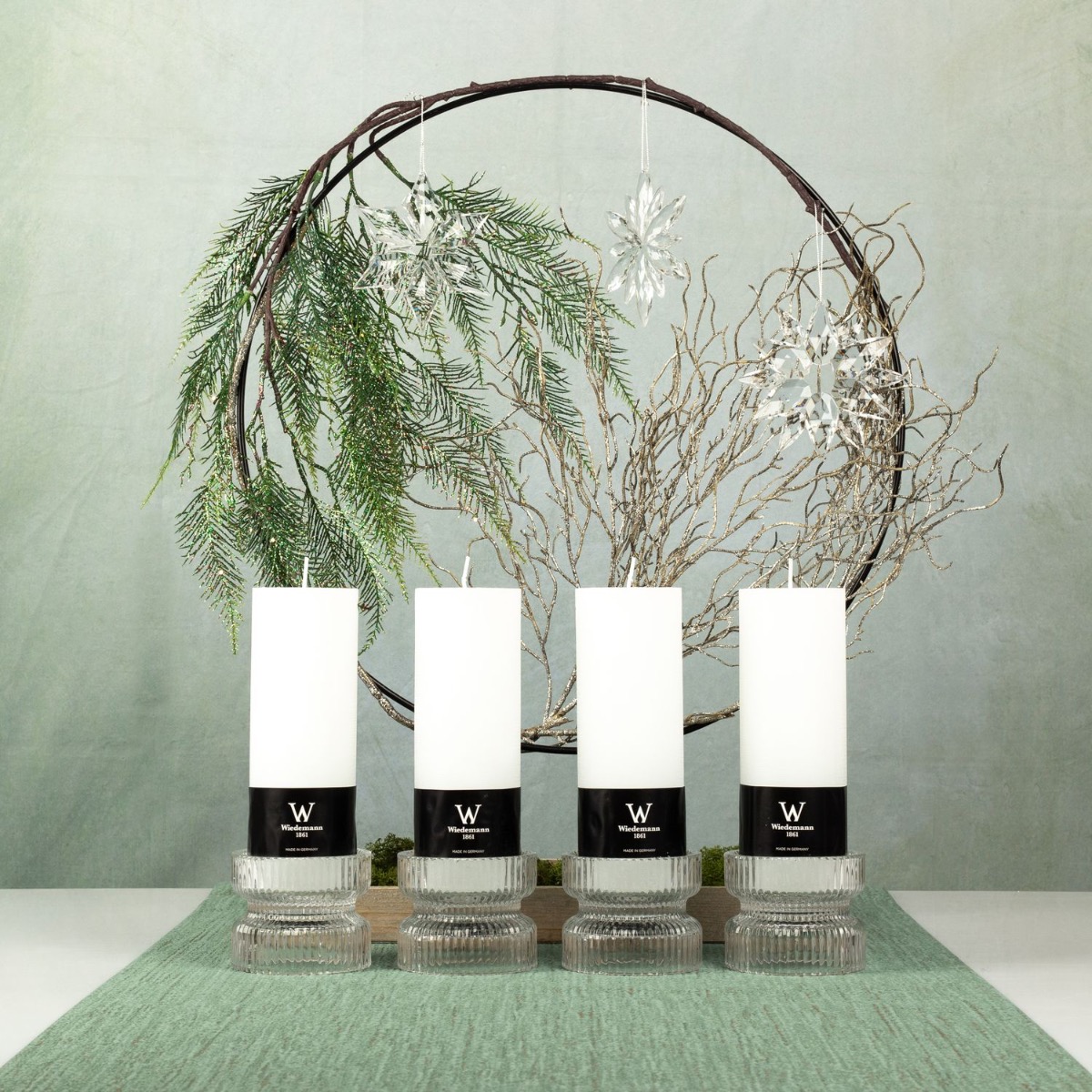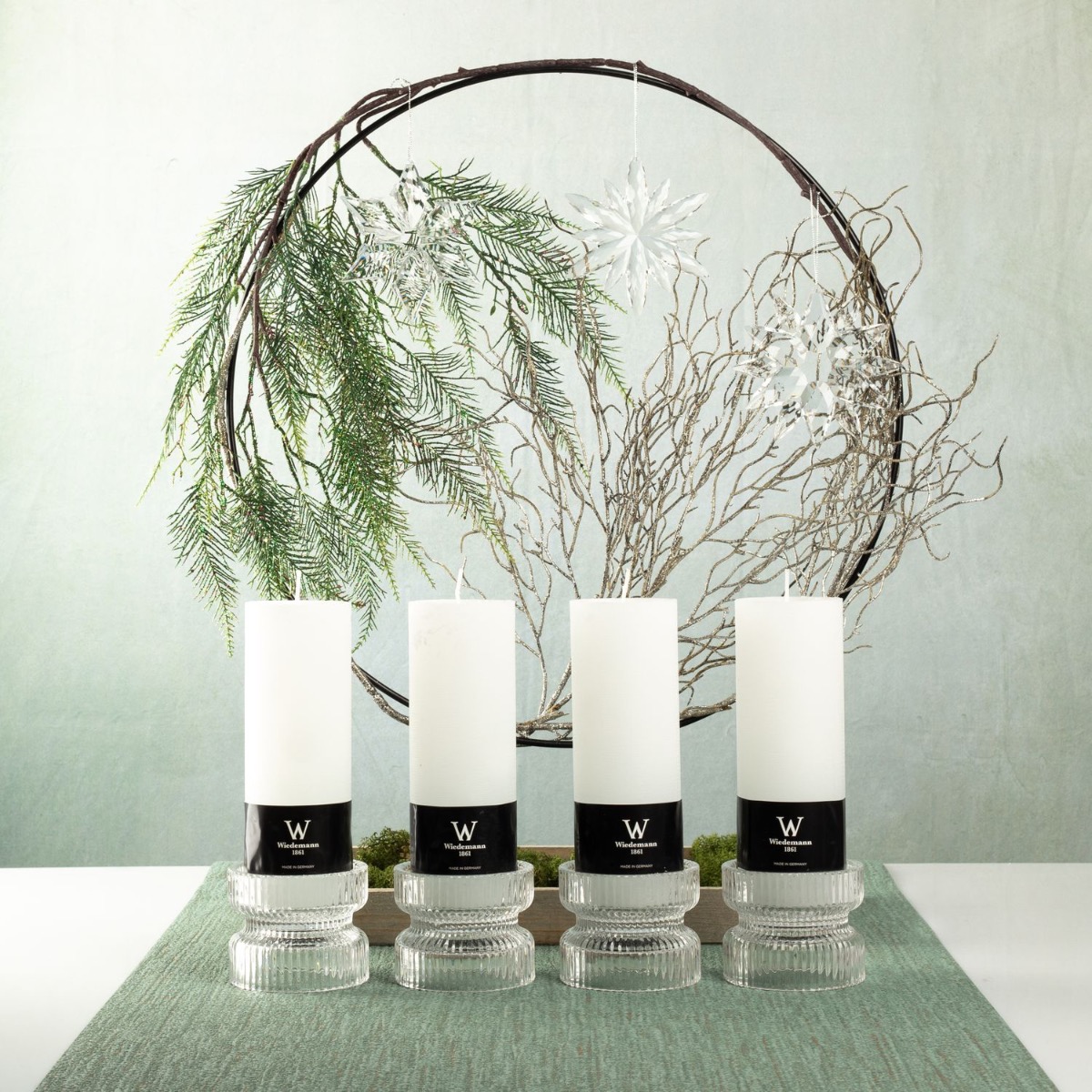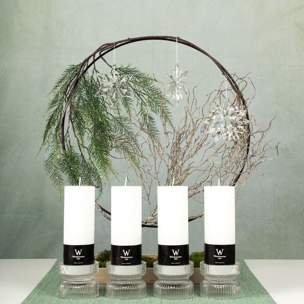 Stříbro a třpytky! Náš adventní vzhled je mimořádně elegantní a díky 4 velkým sloupovým svíčkám jej lze použít i jako adventní věnec. Klasický adventní věnec je vždy navržen ve tvaru kruhu. Katolická víra jím popisuje vzkříšení a věčnost života. Náš samostatně stojící kovový prstenec, který je vhodný i pro skvělé nápady na výzdobu po vánočním období, jsme ozdobili třpytivými větvičkami a ozdobami na vánoční stromeček. Šedý dřevěný podnos byl naplněn naším zeleným přírodním mechem, protože zelená znamená naději a život. Tento vzhled je mimořádným začátkem vánoční sezóny. Nakupte si tento vzhled!