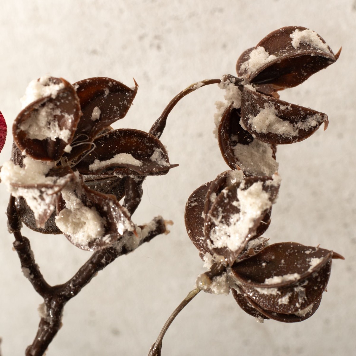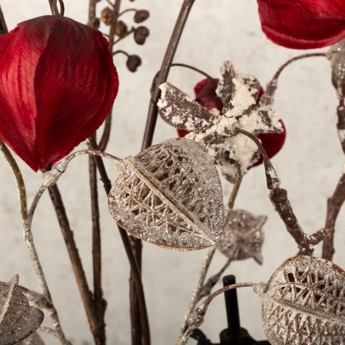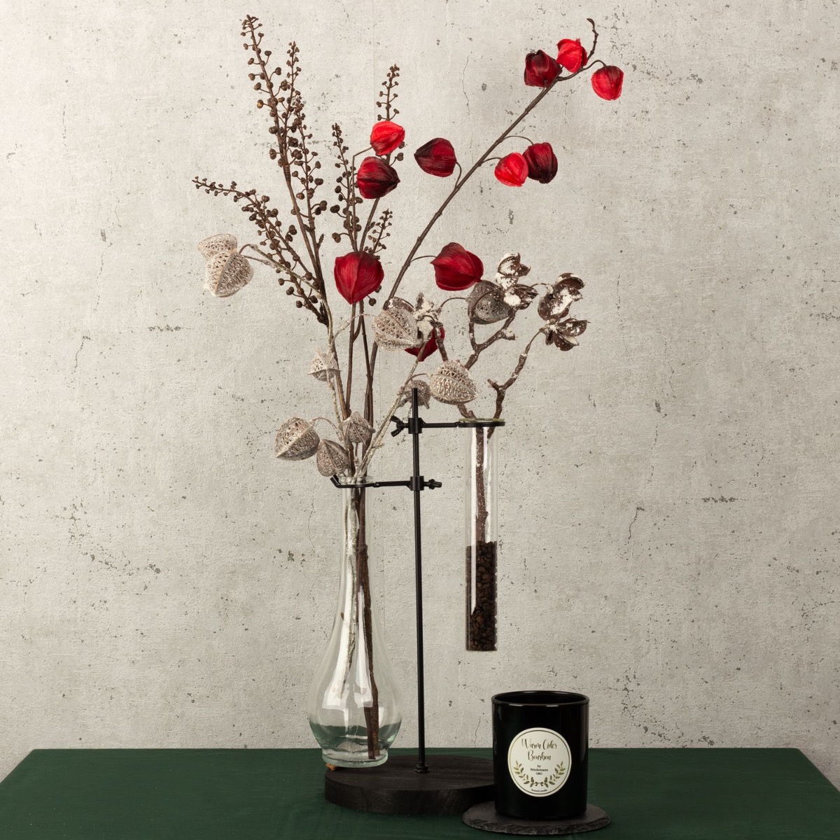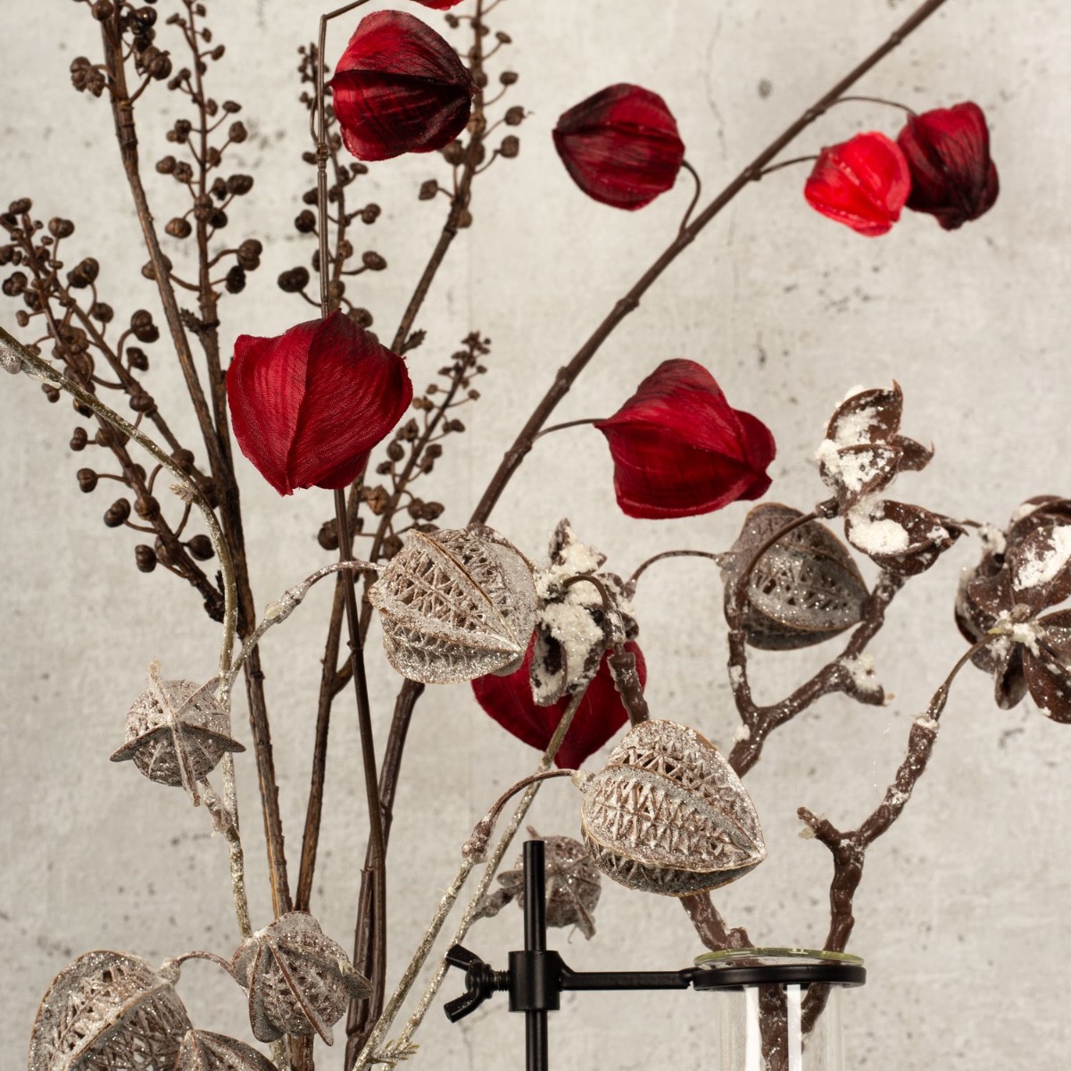 Černá, stříbrná a trocha červené! Ne každý má rád přetížené dekorace, které jsou vidět všude, zejména v období Vánoc. Proto jsme vyvinuli zimní vzhled, který je decentní, elegantní a neobvyklý. Tuto neobvyklou vázu v industriálním designu zdobí Physalis v zimním designu a jasně červené barvě a zasněžená větvička bavlněného bolusu. Vonná svíčka navíc vyzařuje netypickou vůni teplého moštu. Pohled pro minimalisty mezi námi! Nakupte si tento vzhled!