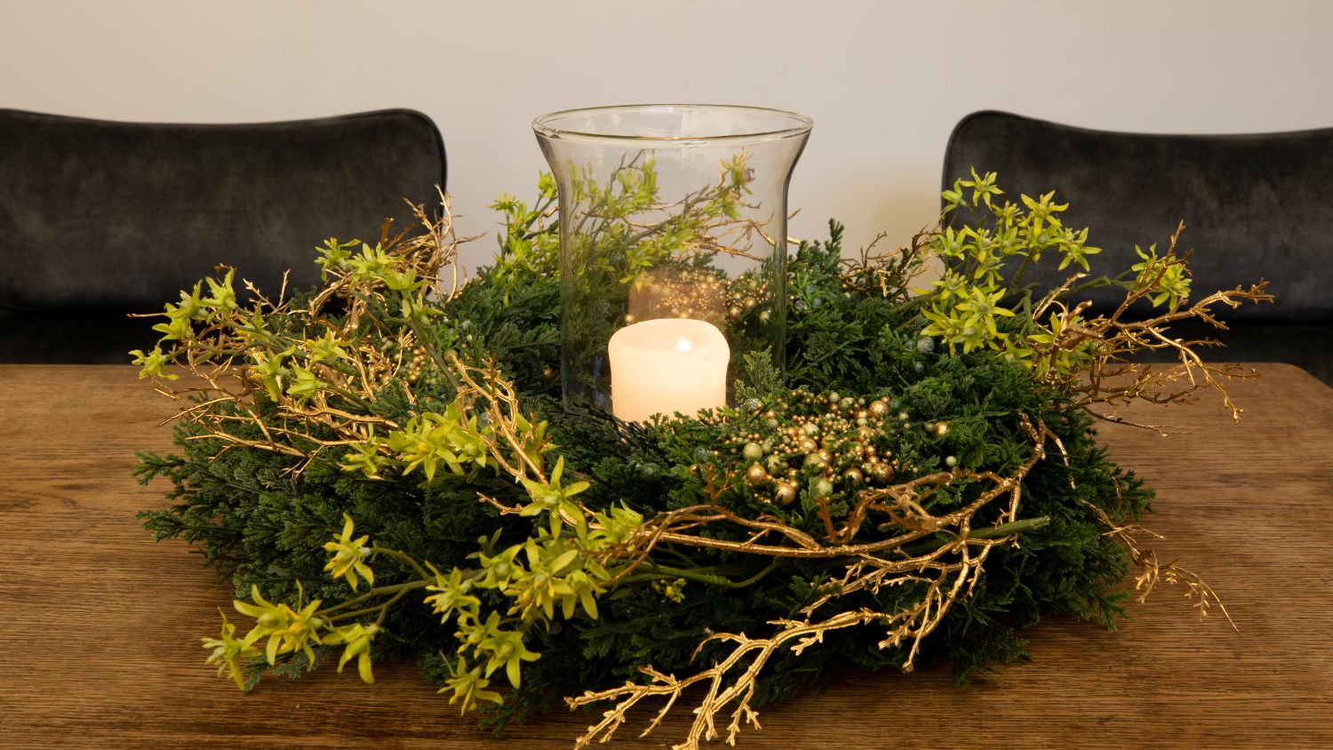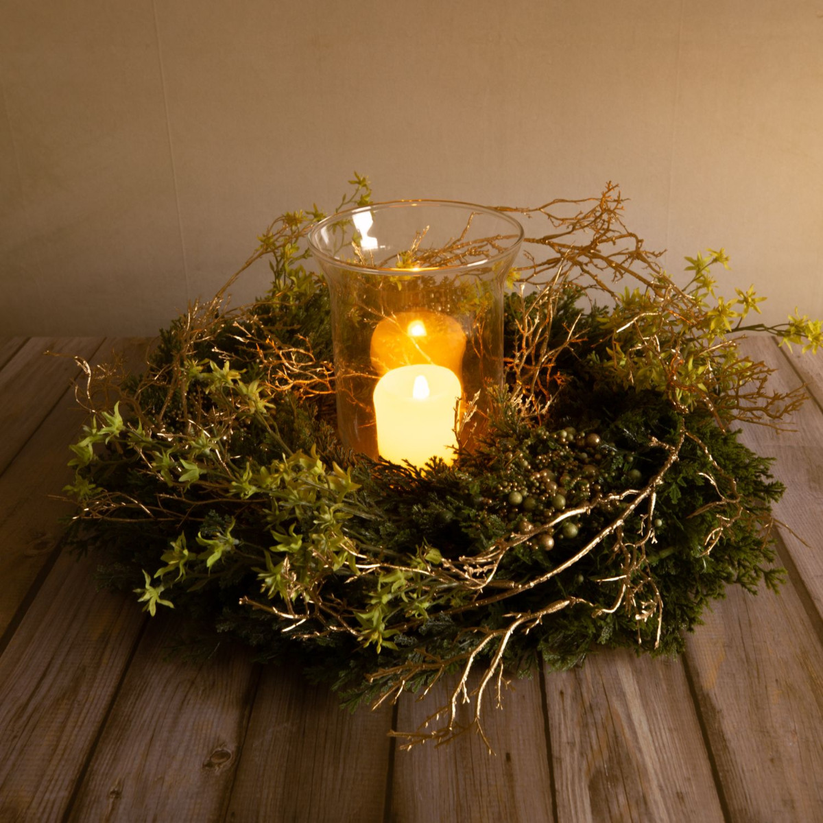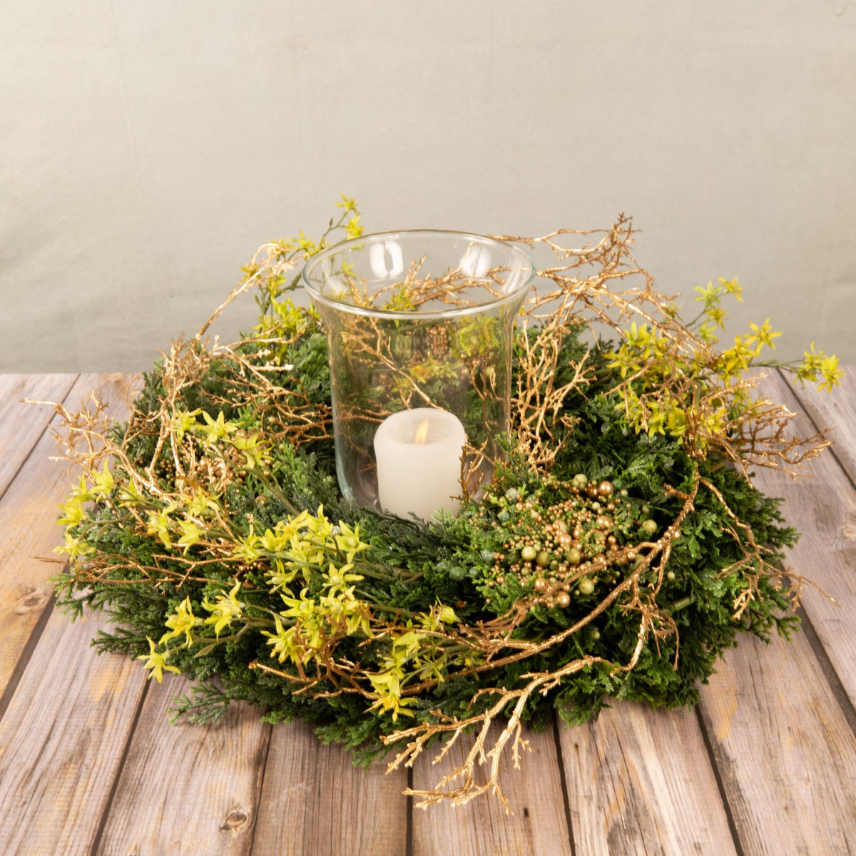 Atmosférická elegance! Díky cypřišovému věnci zdobenému zlatými korálky se adventní období objeví v třpytivém světle. Malé umělé větvičky deutzie i zlaté březové větvičky dodávají věnci živost a svěžest. Nádoba se svíčkou uprostřed symbolizuje adventní období a nadcházející Vánoce. Tento vzhled se hodí nejen do interiéru. Sklenice na svíčku chrání hořící svíčku před větrem a zkrášlí nejen obytný prostor, ale i váš krytý venkovní prostor. Nakupte si vzhled!