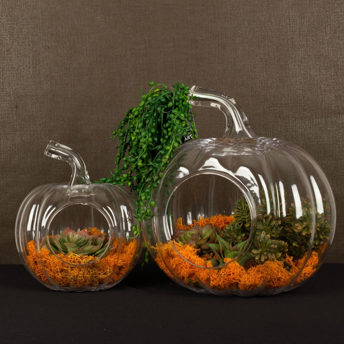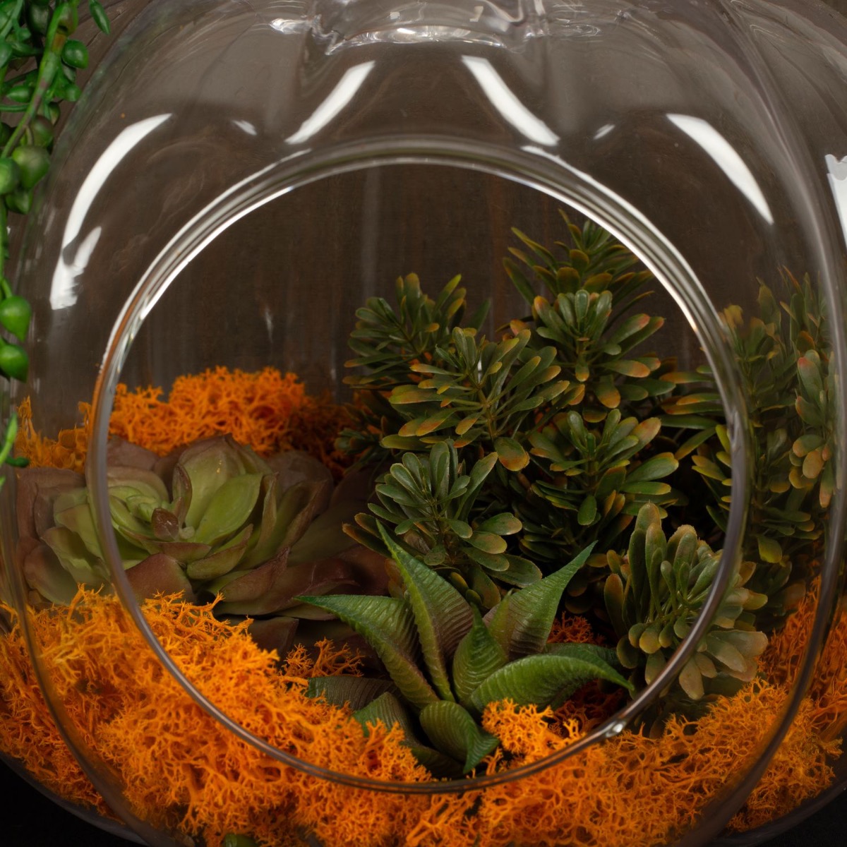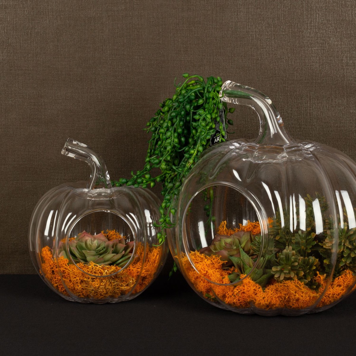 Sklo a mech! Kombinace, která vždy dobře funguje. Tento podzimní halloweenský vzhled jsme zachovali velmi decentní, takže se tentokrát opravdu nikdo nemusí bát. Oranžově zbarvený přírodní mech ve skleněných dýních krásně září. Sukulenty jsou ideální pro použití v rostlinných teráriích. Skvělá dekorace na podzim. Nakupte si tento vzhled!
