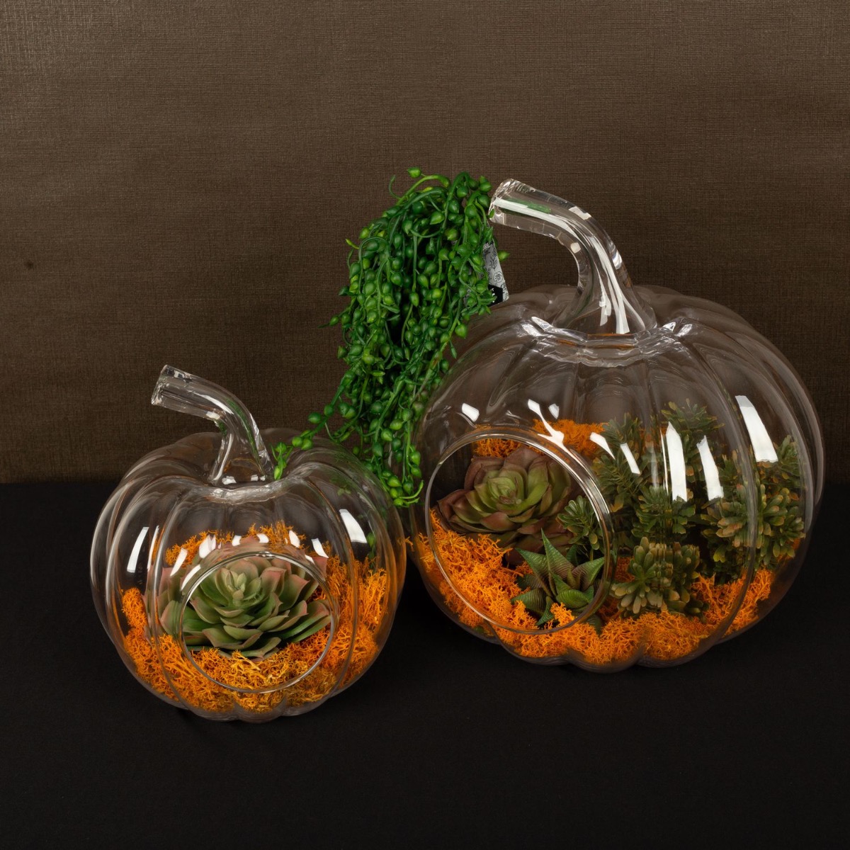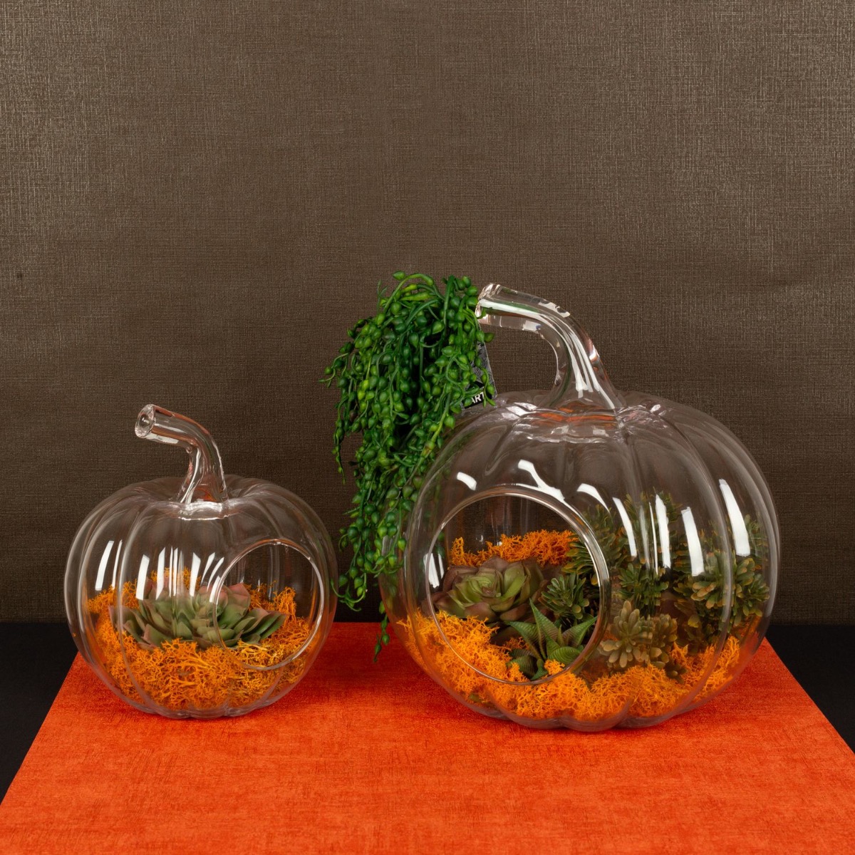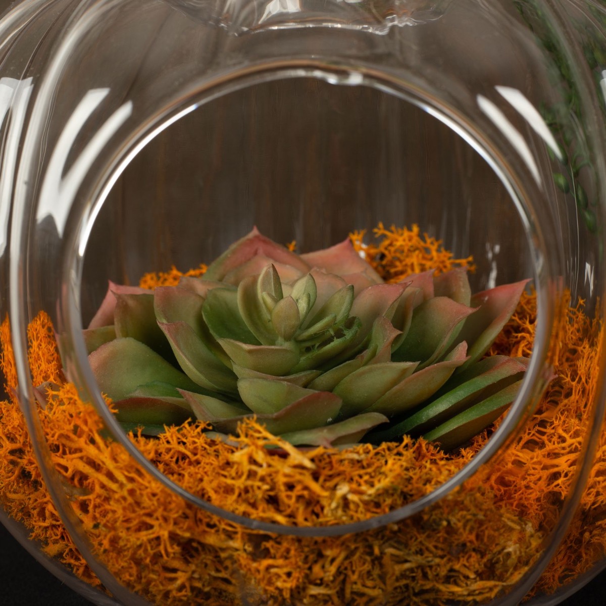 Sklo a mech! Kombinace, která vždy dobře funguje. Tento podzimní halloweenský vzhled jsme zachovali velmi decentní, takže se tentokrát opravdu nikdo nemusí bát. Oranžově zbarvený přírodní mech ve skleněných dýních krásně září. Sukulenty jsou ideální pro použití v rostlinných teráriích. Skvělá dekorace na podzim. Nakupte si tento vzhled!