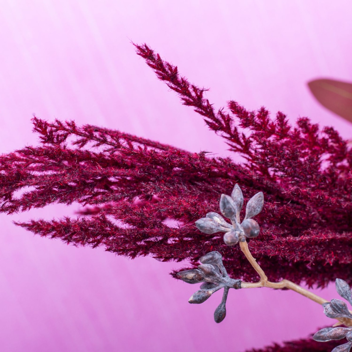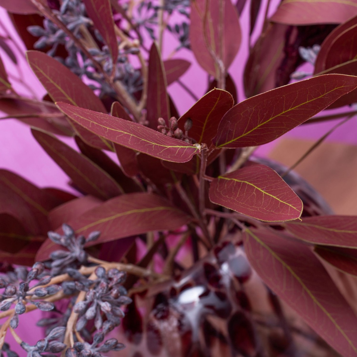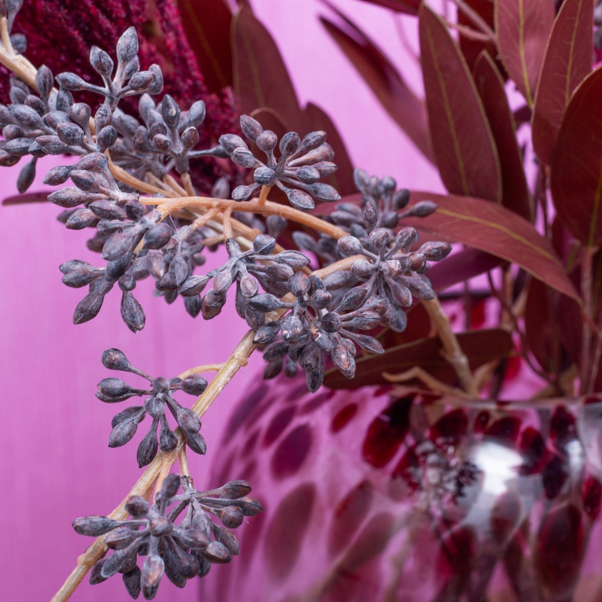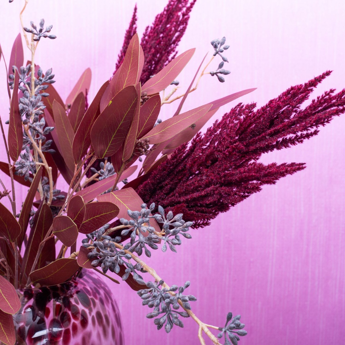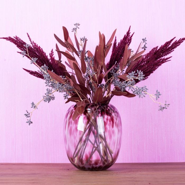 Tón v tónu! Pampová tráva a eukalyptus v bordó barvách. To je pro tuto skupinu výrobků vlastně netypické. Ale existují! Tím spíš, že z nich můžeme vytvořit vzhled. Váza ve stylu leoparda z naší řady RUSSELL s tmavě červenými skvrnami se k této kytici skvěle hodí. Hnědě omyté větvičky plodů eukalyptu celý obraz uvolňují a kytici oživují. Sen pro každý obývací pokoj. Nakupte si tento vzhled!