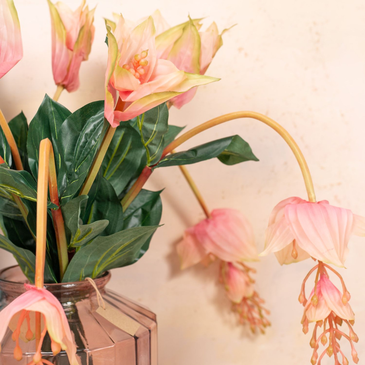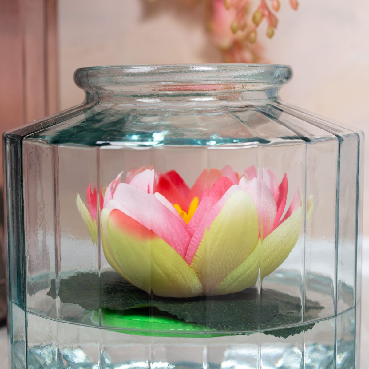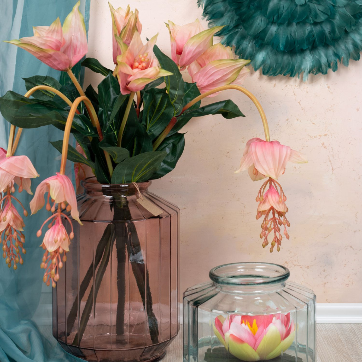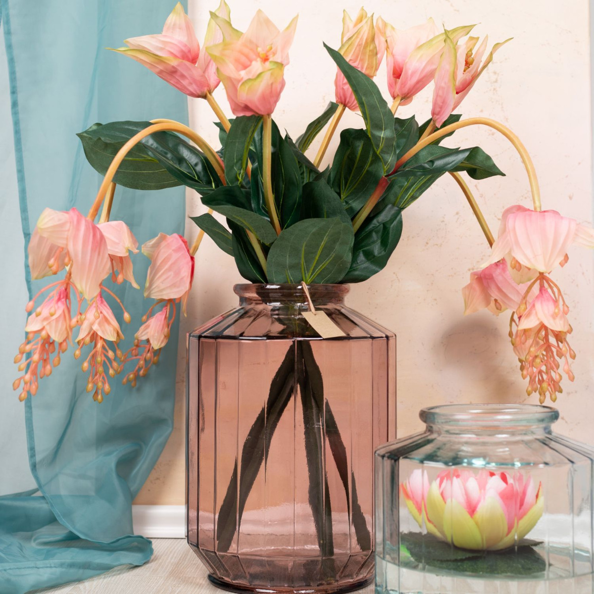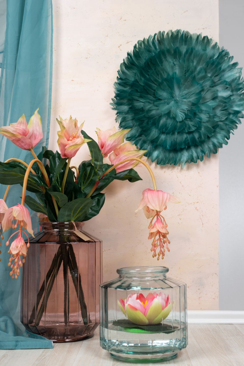 Velké květy! Chcete mít v obývacím pokoji rostlinu jako ozdobu, ale nedáte dopustit na propracovanou péči? - To se vám s naší umělou živou medinilou stát nemůže. Zdobená ve stejně krásné váze ze silnostěnného skla bude pro vaše hosty pastvou pro oči. V kompozici s plovoucím dekorativním leknínem v opticky identickém skle získáte vkusný celkový obraz. Chcete také dodat svému obytnému prostoru nový lesk? Nakupte si vzhled!