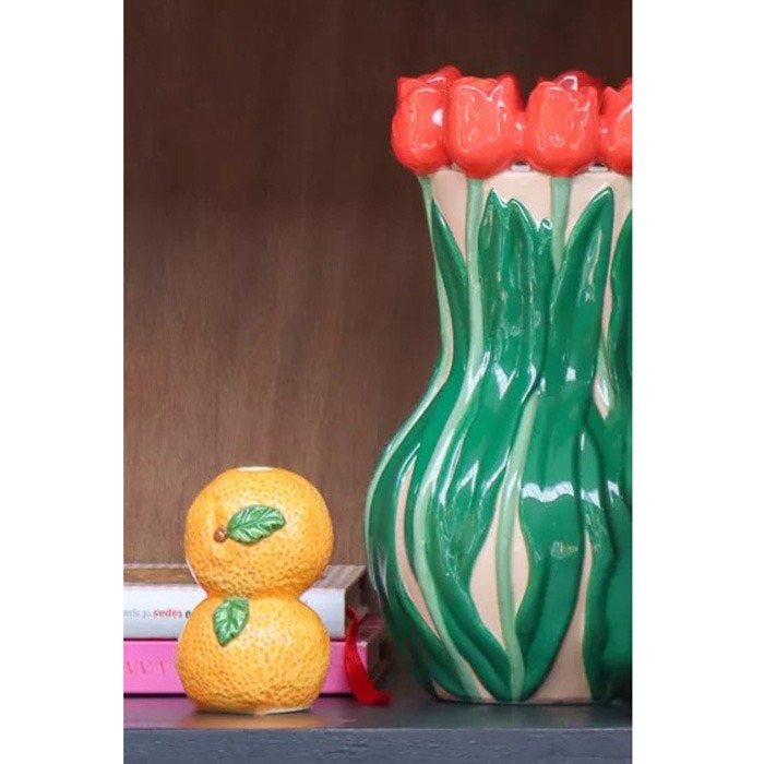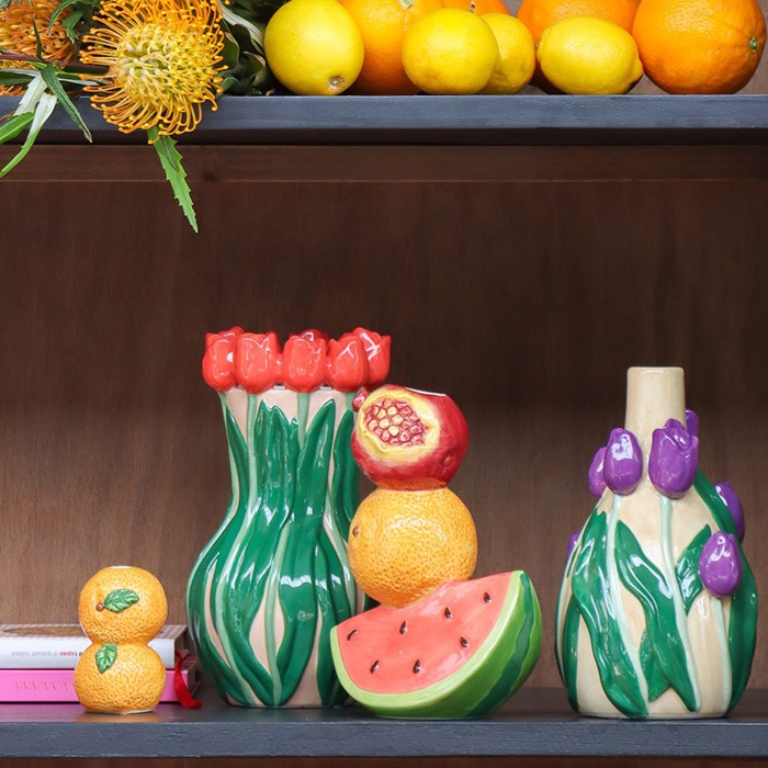 Letní ovoce se setkává s jarní vázou! Look, který se hodí jak na jaro, tak na (pozdní) léto: kromě dekorativních citronů a pomerančů vyvolává chuť na letní ovoce také krásná váza na jednu květinu v designu vodního melounu, pomeranče a granátového jablka. Ještě více barev vnesou dvě vázy na tulipány, které díky svému realistickému vzhledu vlastně ani nepotřebují květiny. Modré bodláky a oranžovo-žluté protey doplňují tento barevný ansámbl. Nakupte si tento vzhled!