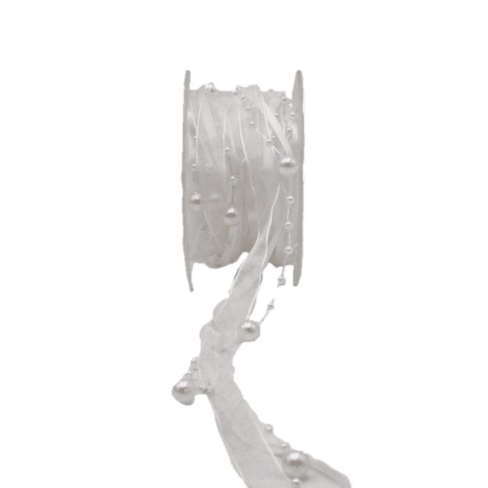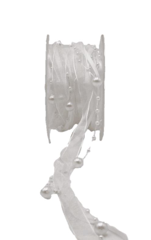 Ozdobná stuha s perličkami CARESA ze šifonu a saténu, bílá, 5m, 20mm