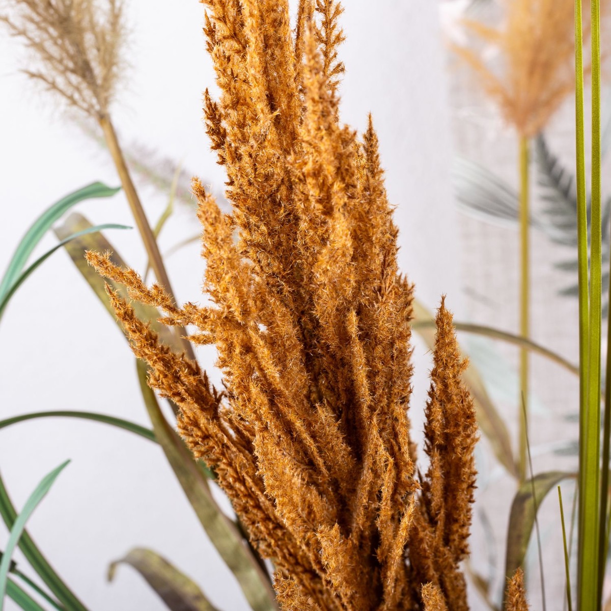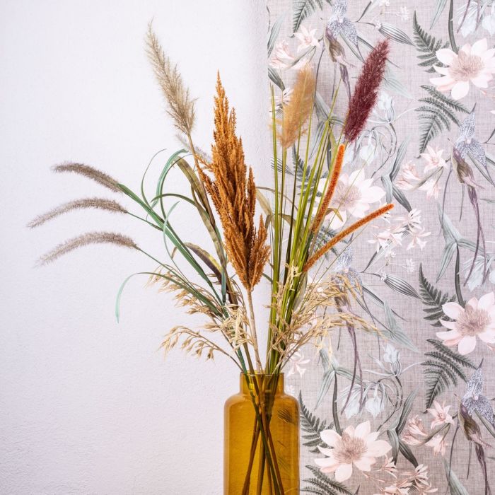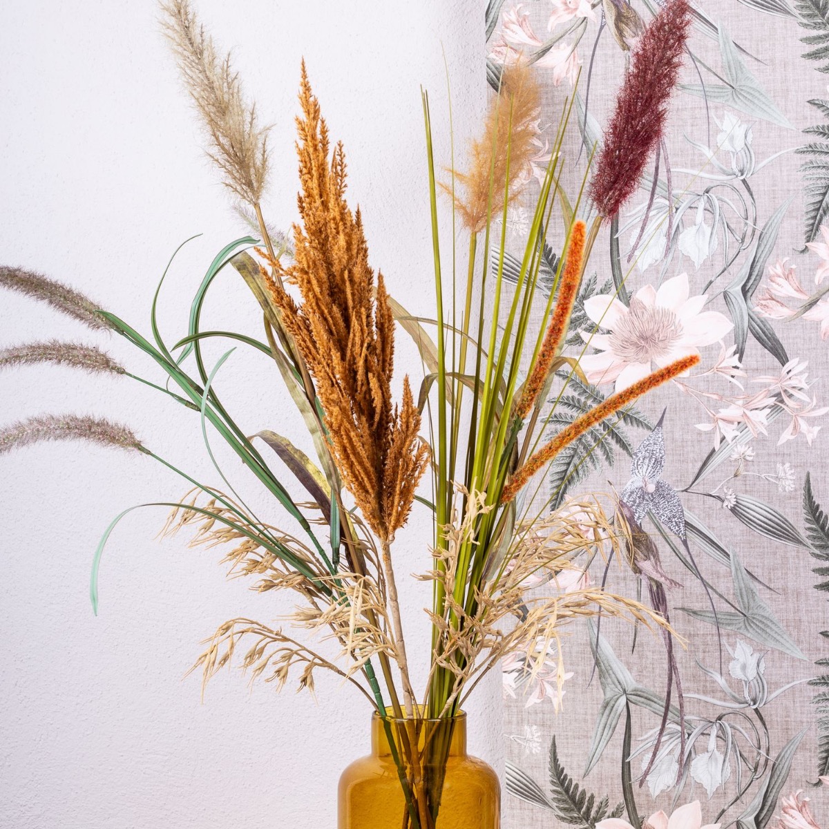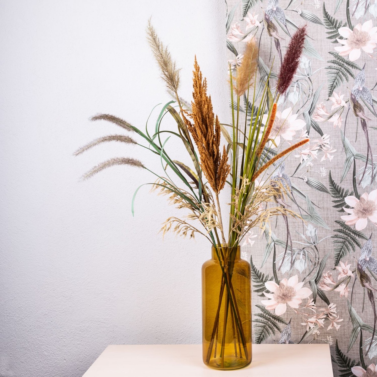 Kognaková - nová trendy barva! Ať už v módě, nebo v obývacím prostoru, tento teplý, světle hnědý tón lze skvěle kombinovat s klasickými podzimními barvami. Skleněná váza SIARA vypadá v této barvě obzvlášť elegantně a dodává naší kytici různých trav extravagantní vzhled. Přirozená a stylová, tato kompozice se opravdu trefuje do módního ducha. Nakupte si tento vzhled!