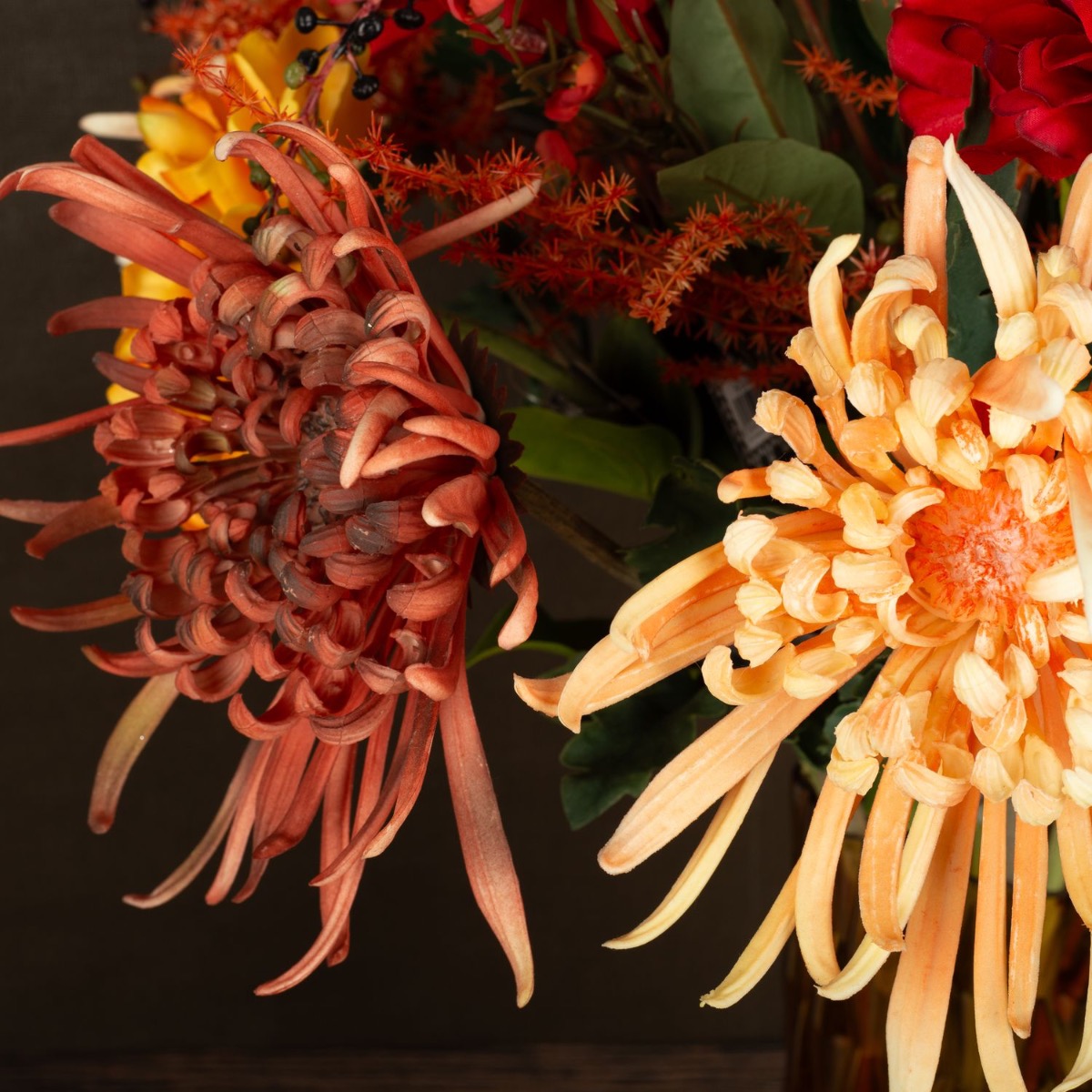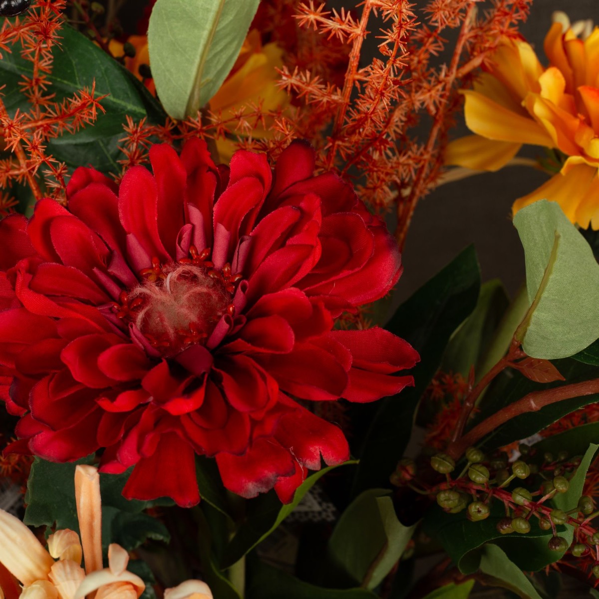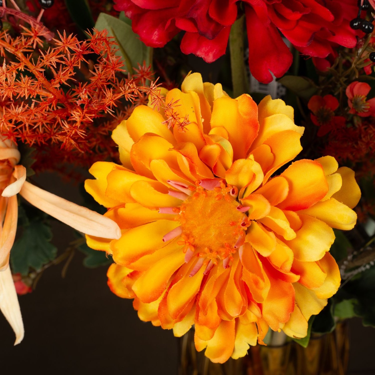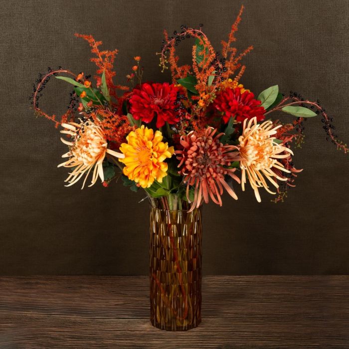 Od meruňkové po tmavě červenou! Tyto ohnivé barvy přinášejí do chladného a temného podzimu teplo a světlo. Typické pozdně letní květiny, jako jsou chryzantémy a cínie, v kombinaci s různými odstíny červené a oranžové vypadají na tmavém pozadí téměř jako impresionistická olejomalba. Rozjasněte svůj domov tímto klasicky krásným zátiším. Nakupte si tento vzhled!