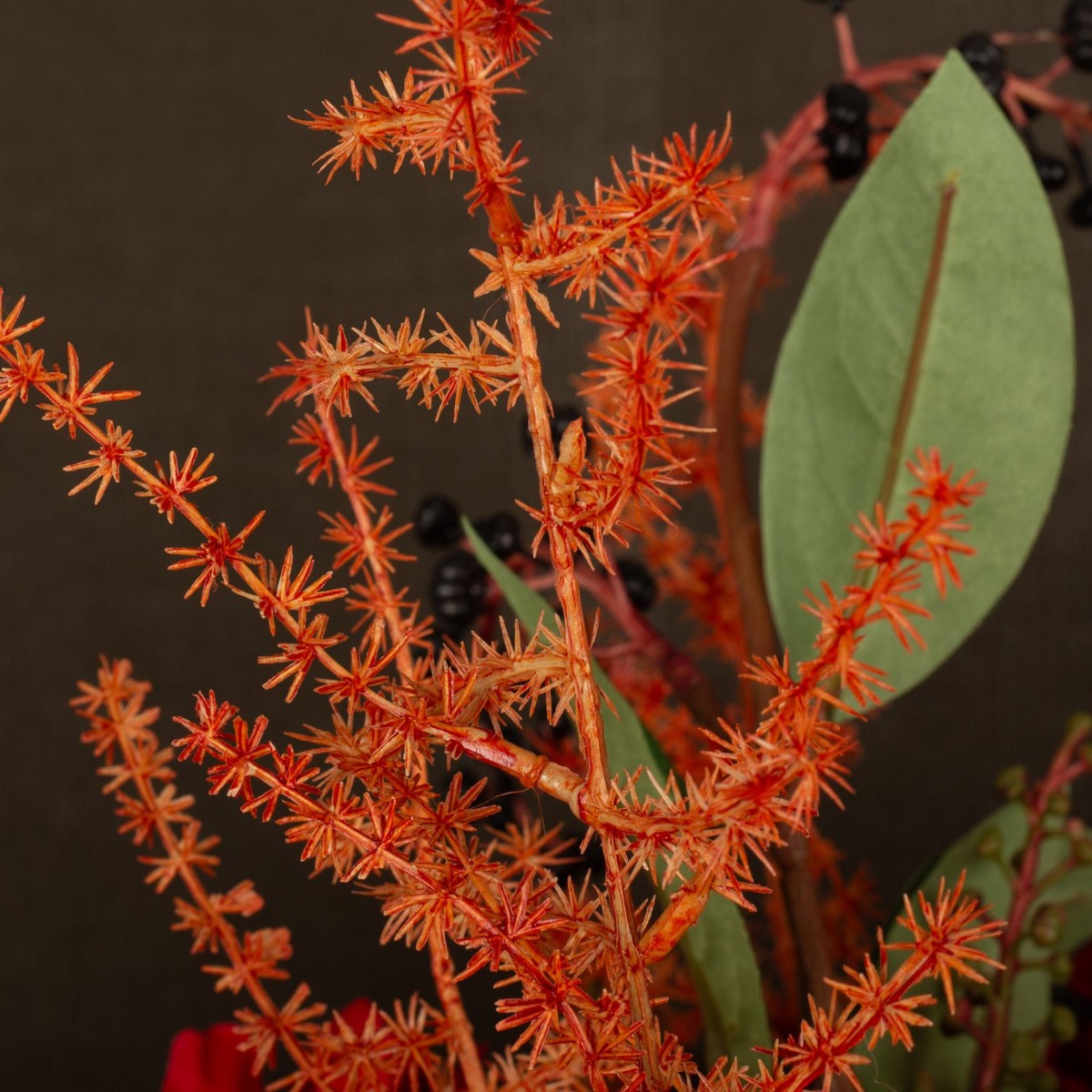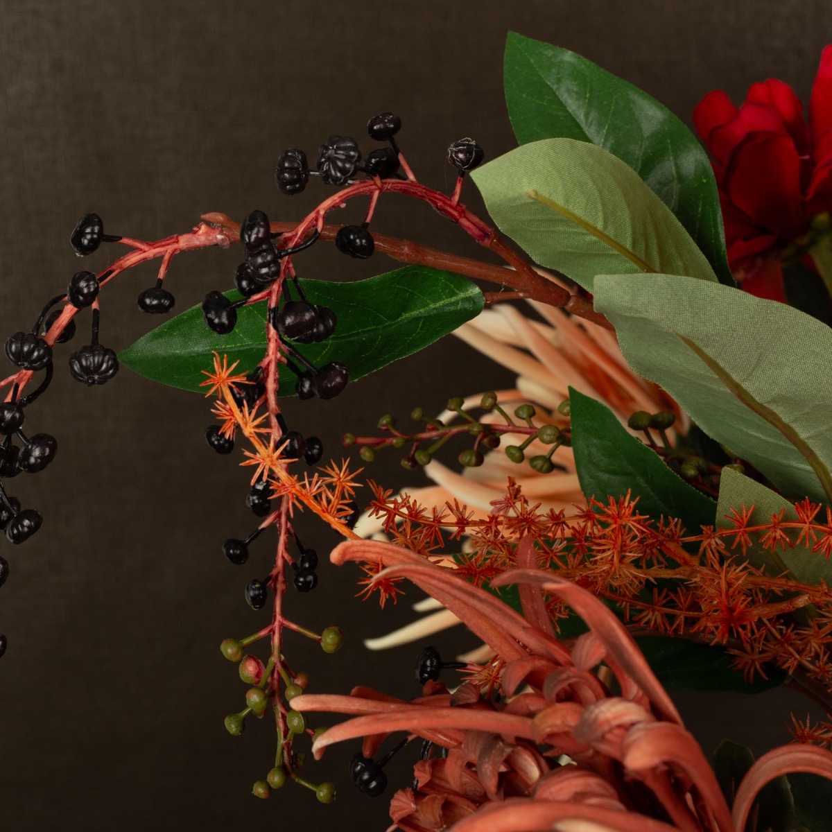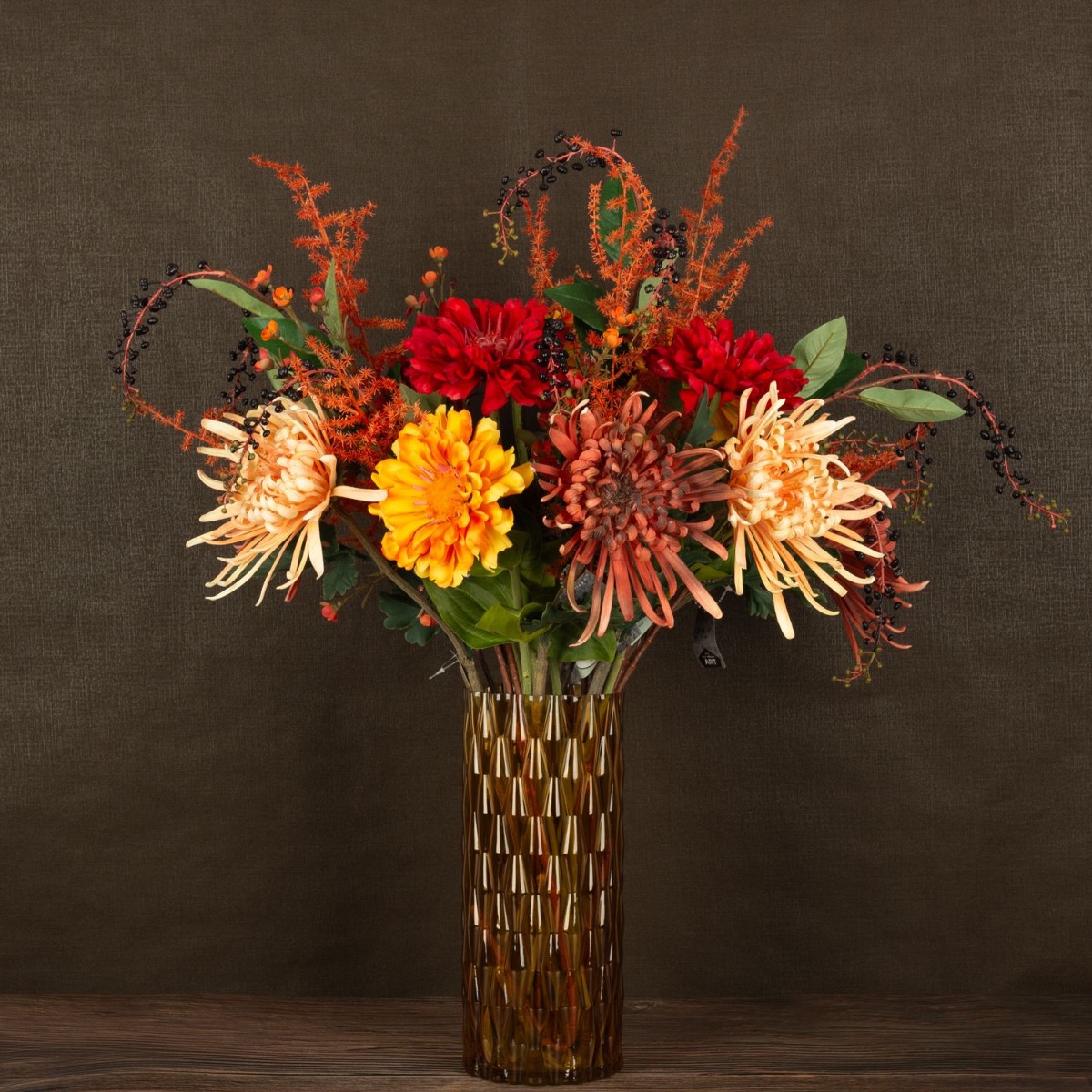 Od meruňkové po tmavě červenou! Tyto ohnivé barvy přinášejí do chladného a temného podzimu teplo a světlo. Typické pozdně letní květiny, jako jsou chryzantémy a cínie, v kombinaci s různými odstíny červené a oranžové vypadají na tmavém pozadí téměř jako impresionistická olejomalba. Rozjasněte svůj domov tímto klasicky krásným zátiším. Nakupte si tento vzhled!