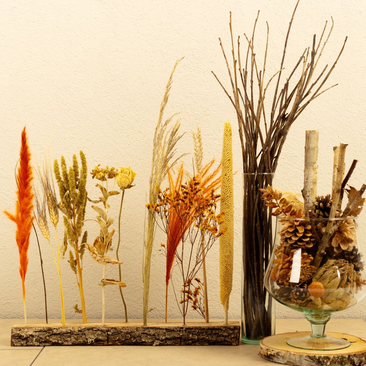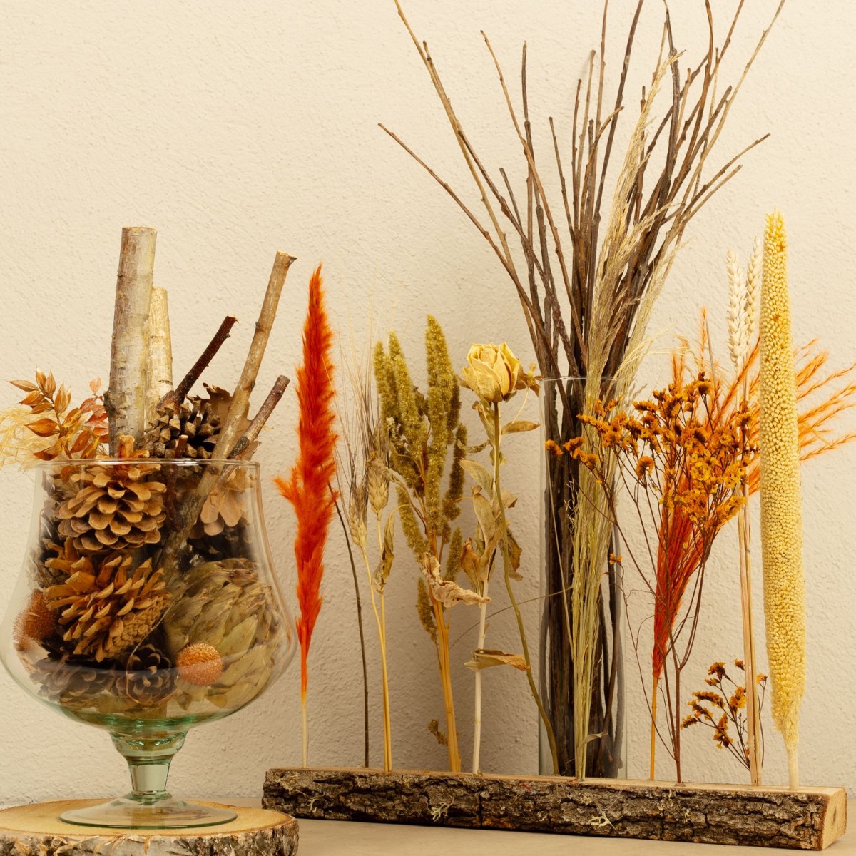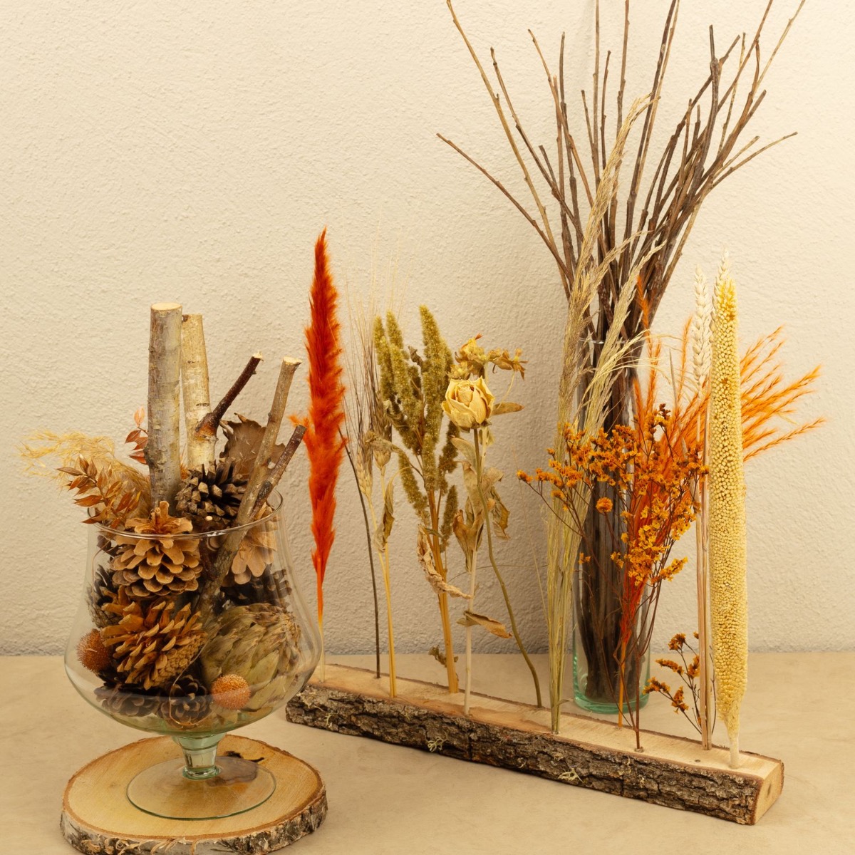 Podzim září! Dnes vám konečně ukážeme vzhled z naší všestranné nabídky přírodních dekorací. Sušené květiny, plody stromů a větvičky se opravdu skvěle hodí pro vnesení podzimu do domácnosti. Aranžmá ze sušených květin s jasně oranžovými prvky je prostě krásné na pohled a vnáší barvy do někdy šedivého ročního období. Nakupte si tento vzhled!