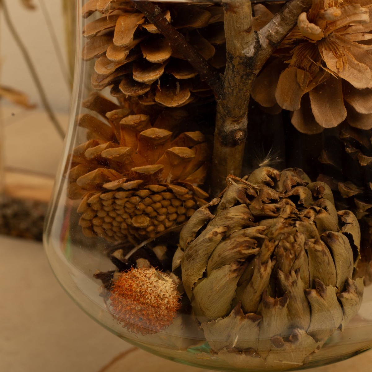 Designový tip: Naplňte podzimní potpourri ze šišek a sušených větviček do obří sklenice na koňak. Větvičky dokonale zapadnou do válcové vázy a jednoduše se umístí dovnitř. Velmi snadné kopírování!
