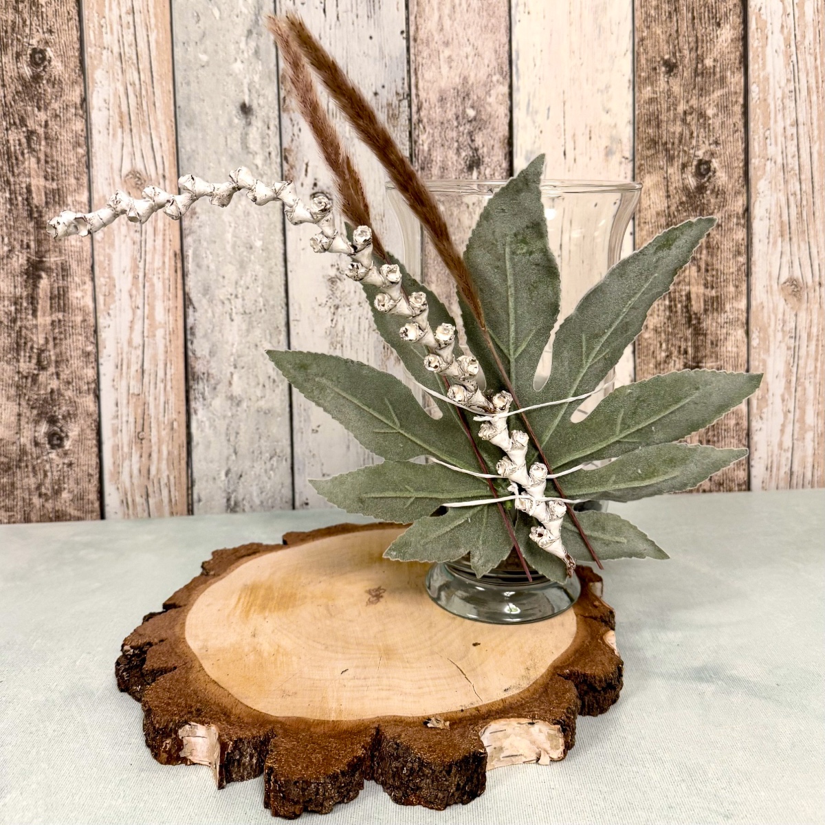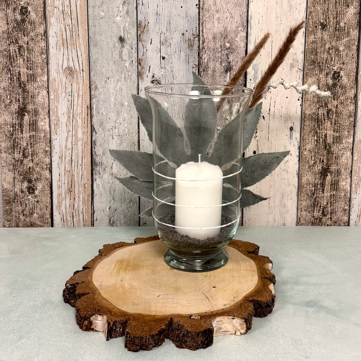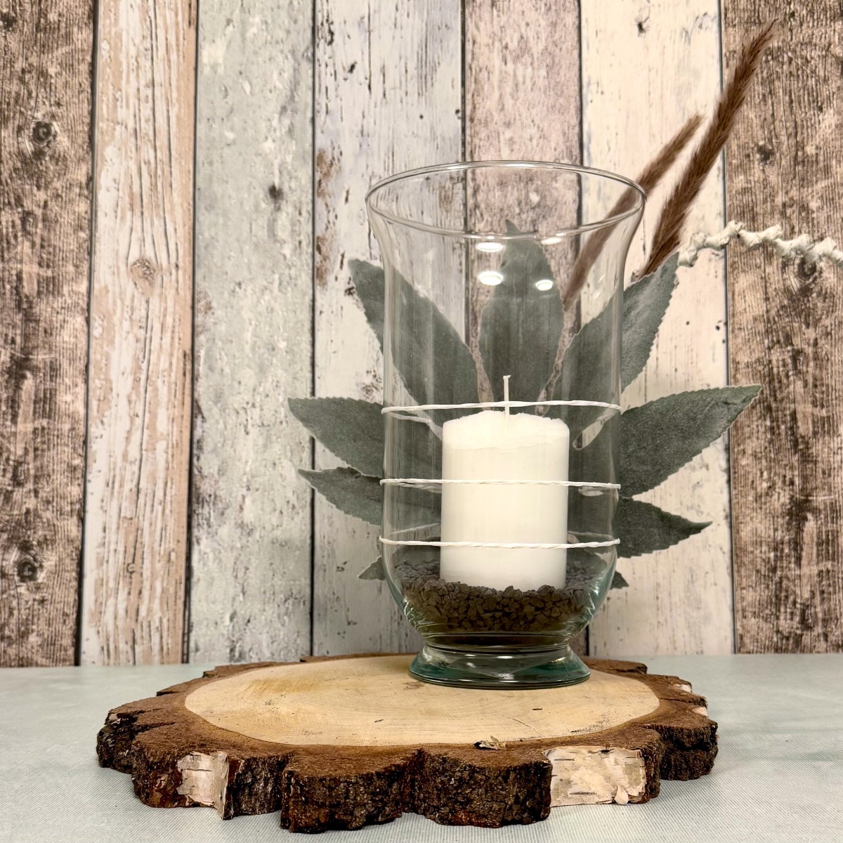 Zemité, autentické a prostě krásné! Tato láskyplně aranžovaná svícna vnáší do vašeho domova kousek přírody. Na kulatém březovém dřevěném podstavci s přírodním okrajem z kůry stojí vysoká skleněná svícna naplněná tmavým korkovým granulátem a bílou svíčkou, která zajišťuje jemné, teplé světlo. Za sklem je umístěn sametový umělý list arálie, který dodává celému vzhledu jemnou, harmonickou hloubku. Celek doplňují sušené stébla trávy, která jsou spolu s listem dekorativně připevněna k sklu pomocí bílého papírového drátu – jemný detail, který zdůrazňuje přirozenost a ruční výrobu. Malý, přírodní prvek, který přitahuje pozornost a vyzařuje klid a teplo! Kupte si tento vzhled!
