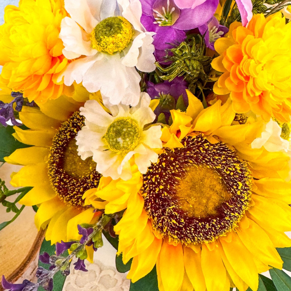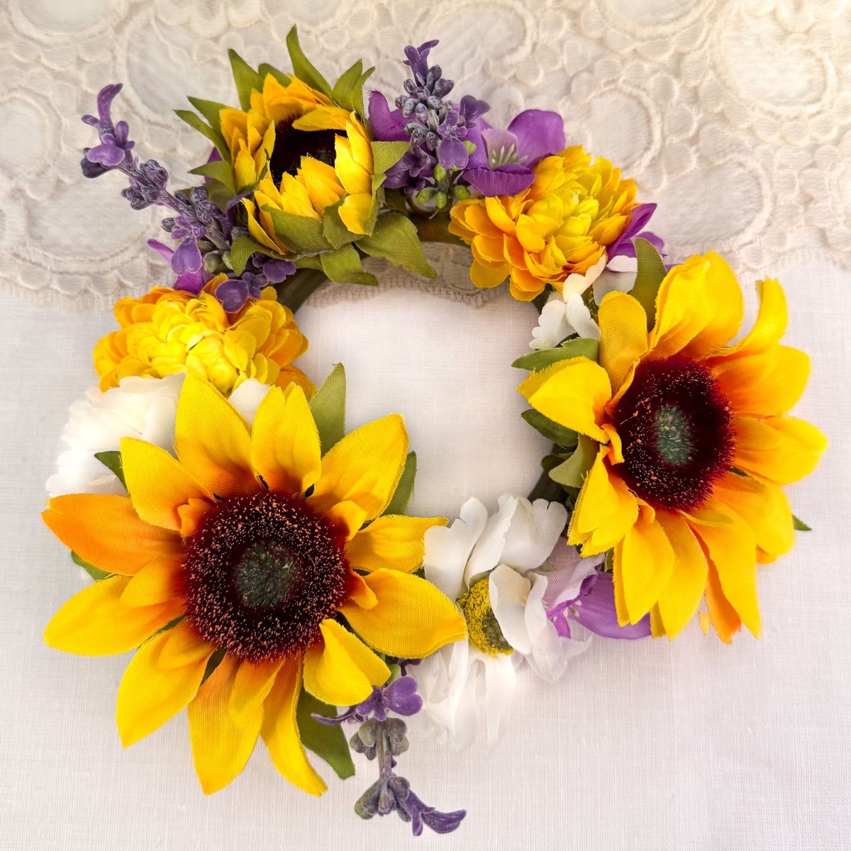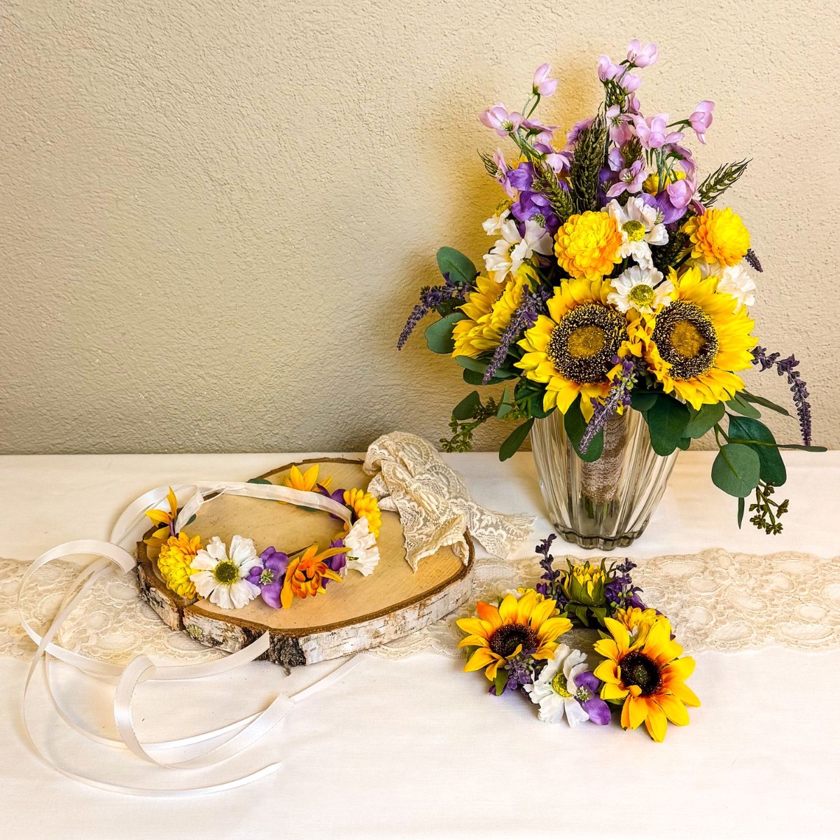 Světlo v srdci - slunečnice v ruce! Na Sheridanově svatbě jsme mohli převzít květinovou výzdobu. Hlavní roli měly hrát slunečnice a levandule. Dokonalá kombinace doplňkových barev pro maximální kontrast a působivost. Slunečnice jsou také skvělou volbou pro letní svatbu, protože symbolizují štěstí, věrnost a zářivou budoucnost. Jestli tohle není dokonalý začátek šťastného manželství. Po svatební kytici následovaly čtyři věnečky se svíčkami a odpovídající čelenka do vlasů. Nakupujte tento vzhled!
