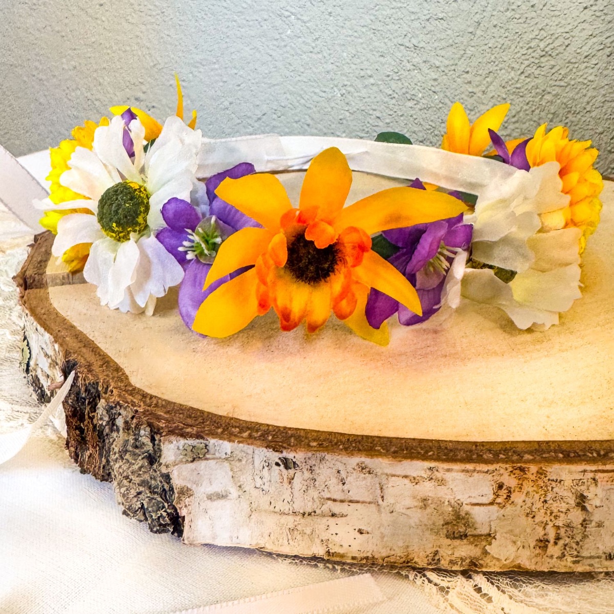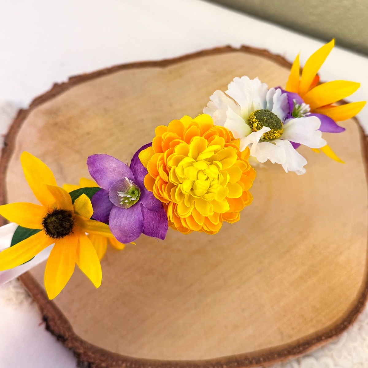 Stužka do vlasů: Nejprve potřebujeme dvě bílé ozdobné stuhy (různé šířky) dlouhé asi 1,5 metru. Určí se středový bod a pomocí tavné lepicí pistole se užší ozdobná stuha připevní k širší ozdobné stuze asi 25 cm v každém směru. Spodní strana stuhy se vyztuží bílým papírovým drátkem, který se rovněž připevní pomocí tavné lepicí pistole. Pro pěkný povrch a příjemný pocit je papírový drátek potažen širokou ozdobnou stuhou. Na každé straně by mělo trčet asi 10 cm papírového drátku. Nyní použijte květy a listy z kytice a věnce, které nepotřebujete. Budete také potřebovat novou větvičku chryzantémy a větvičku bižuterního košíčku. Listy z eukalyptu ustřihněte menší a odstraňte plastový stonek na spodní straně listu. Vystřihněte ozdobný košíček s velkými kulatými okvětními lístky a vytvořte slunečnici, okvětní lístky jednoduše seřízněte do špičky a pestík vybarvěte černým fixem. Květy chryzantém a sedmikrásek se skládají z několika překrývajících se květních kroužků, nejspodnější největší kroužky odstraníme, aby byl květ menší. Květ lze opět slepit horkou lepicí pistolí. Nyní je vše připraveno. Stužku lze nyní zakrýt eukalyptovými listy. Poté je třeba promyslet, v jakém pořadí chcete květy umístit. Začneme lepit středový květ a pak střídavě připevňujeme další květ napravo a pak nalevo od něj. Poté vše necháme dobře zaschnout.