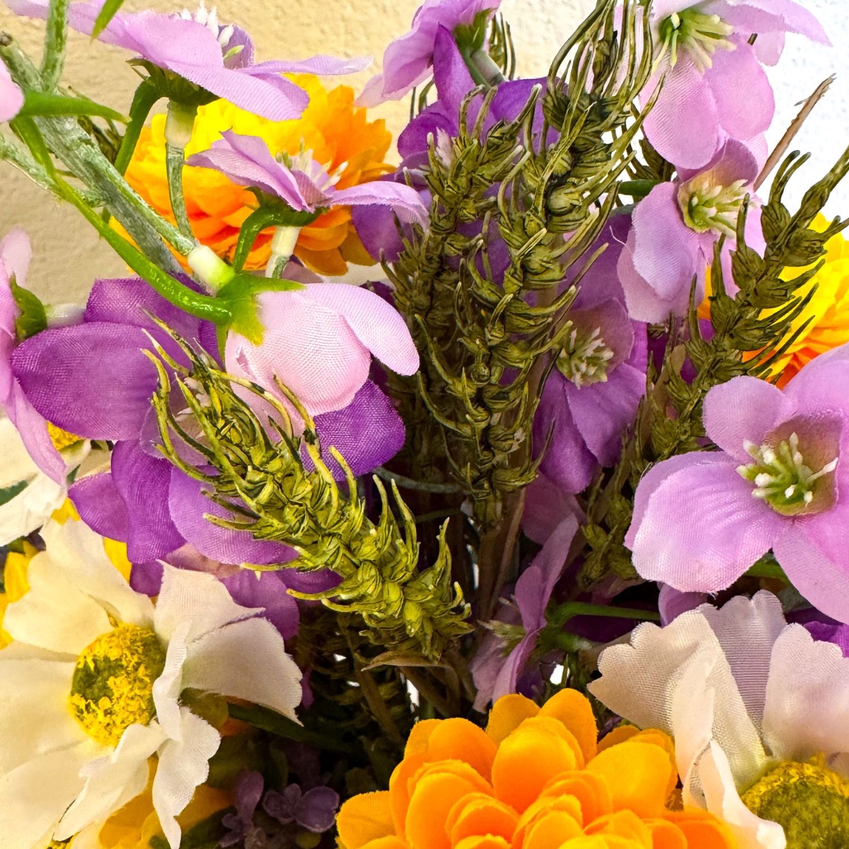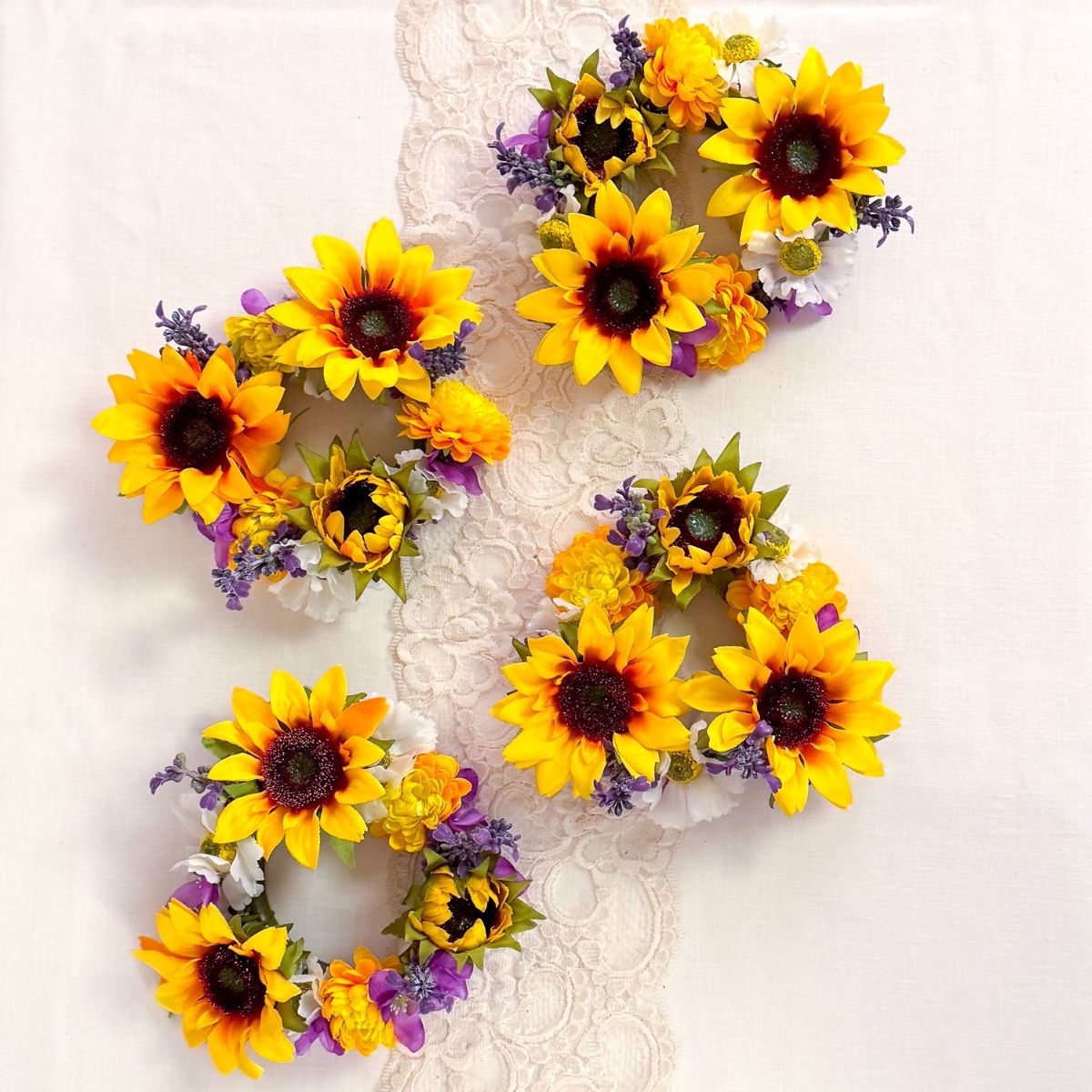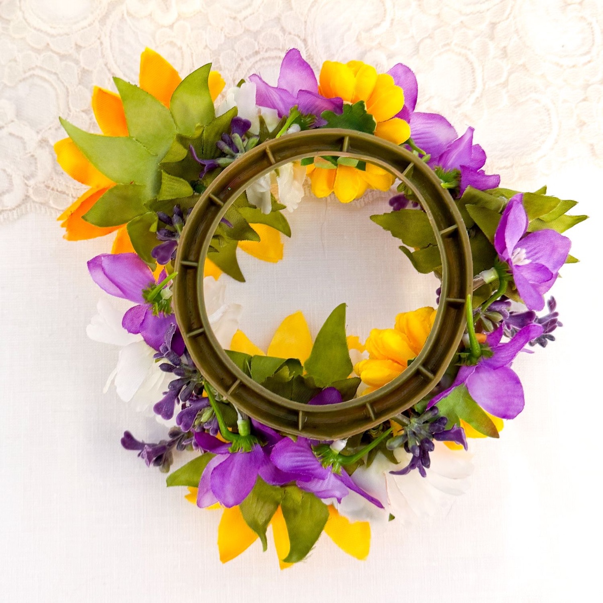 Čtyři svíčkové věnce: Použili jsme na ně hotové růžence. Růžičky jsme odstranili a stonky jsme v rámci přípravy na nové květiny trochu zkrátili, aby se lépe nasazovaly. Z kytice nám již zbyly květy delfínů, dále slunečnice, levandule, chryzantémy a květy kopretin. Všechny je odstraníme ze stonku a začneme slunečnicí, v mezerách mezi nimi pak střídáme barvy ostatních květů. Většina květů již drží sama, ostatní byly připevněny horkým lepidlem.