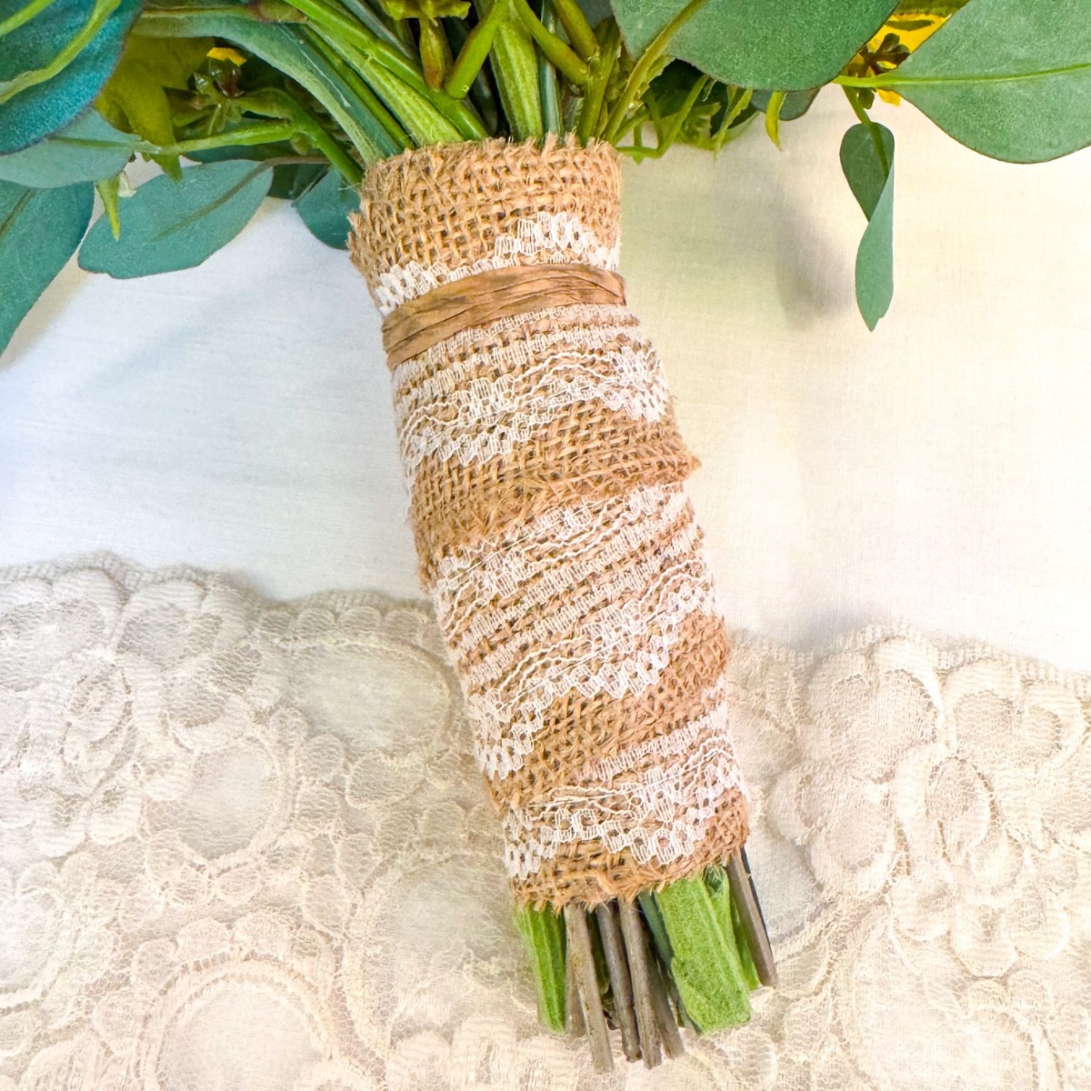 Kytice pro nevěstu: Začněte zmenšením jednotlivých větví jejich rozdělením u vidliček. Některé listy jsou nyní příliš hluboko na stonku a je třeba je odstranit. Stonky se později zkrátí na šířku asi jedné a půl ruky a ovinou se stuhou, květy a listy by měly začínat až nahoře. U delfinia se jednotlivé řady květů dole odstraní, takže ztratí na délce, aby vznikla malá kompaktní kytice. Střed kytice tvoří delfinium a pšenice, následuje snítka chryzantémy a dvě snítky sedmikrásky, které by měly být v dostatečných rozestupech. Poté následuje hlavní hrdina kytice, slunečnice, mezi nimiž je květ levandule. Nakonec dostane své místo eukalyptus. Stonky jsme ovázali jutovou stuhou s krajkou a poté jsme je zkrátili na stejnou délku asi 2 cm pod stuhou.