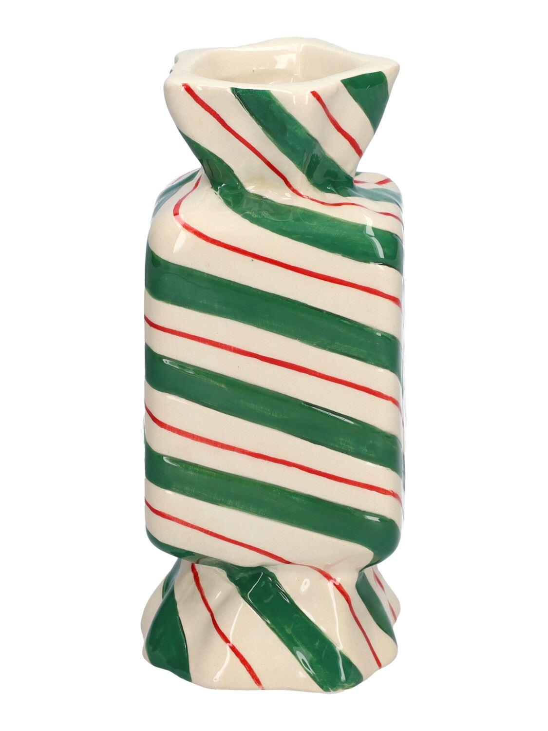 Rohová váza na květiny Bonbon AMIEL z keramiky, s diagonálními čarami, zeleno-červeno-bílá, 6,5x6,5x15cm