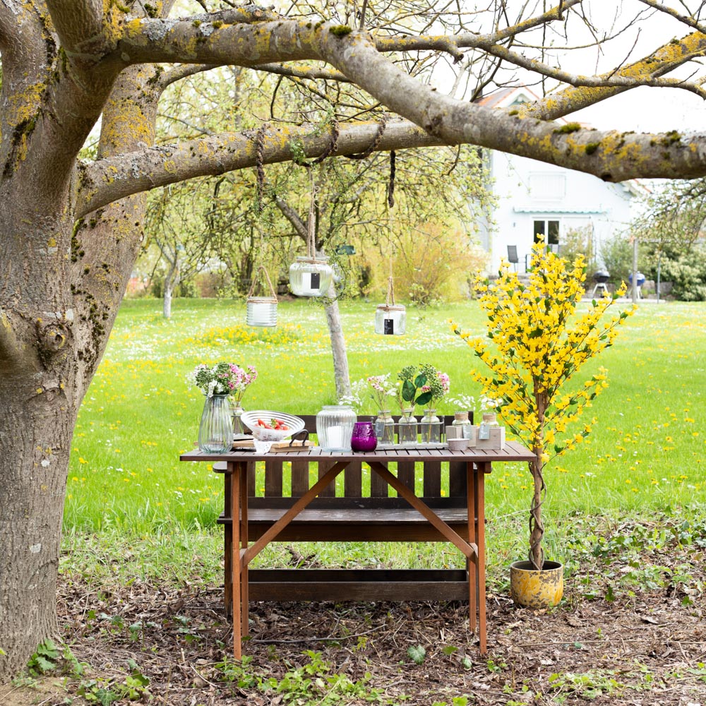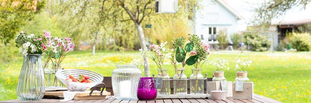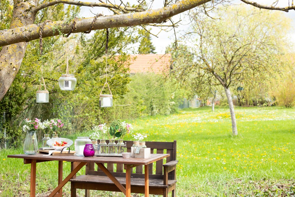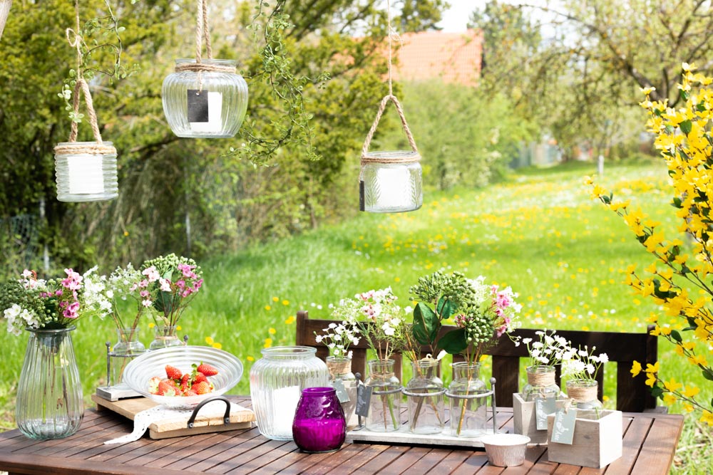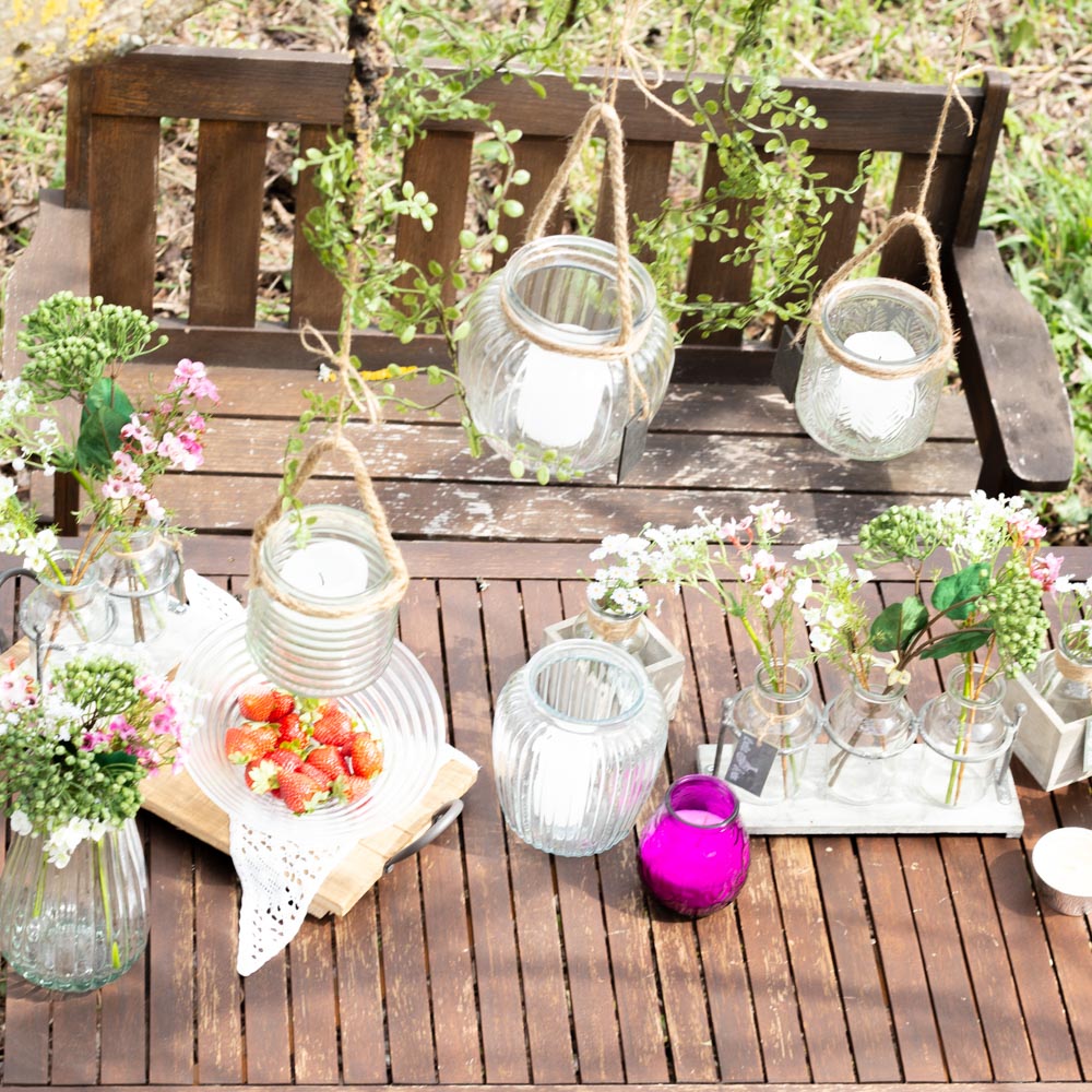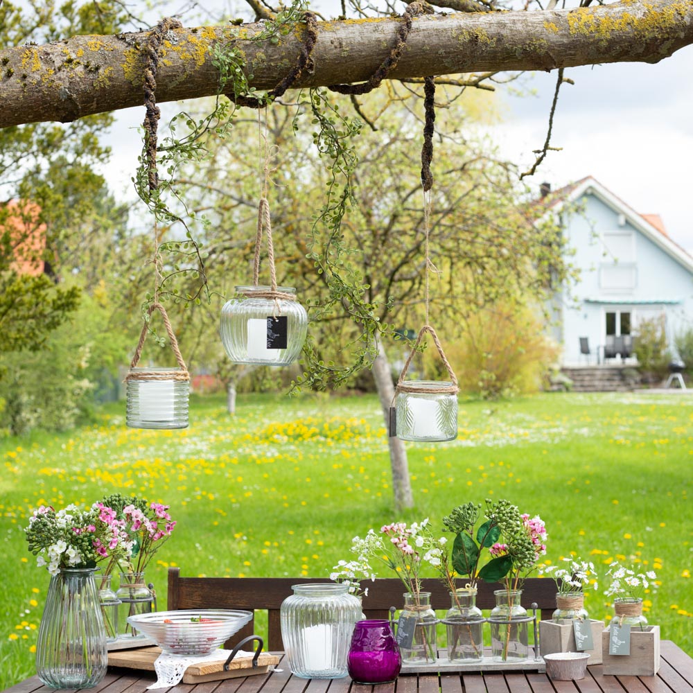 Designový tip: Sklenice se šňůrou byly připevněny k plastové liáně ovinuté kolem velké větve. Ideální pro zapálení svíček na večerní hodiny. Chcete-li hostům nabídnout pohodový večer, doporučujeme svíčky, případně lucerny s účinkem proti komárům.