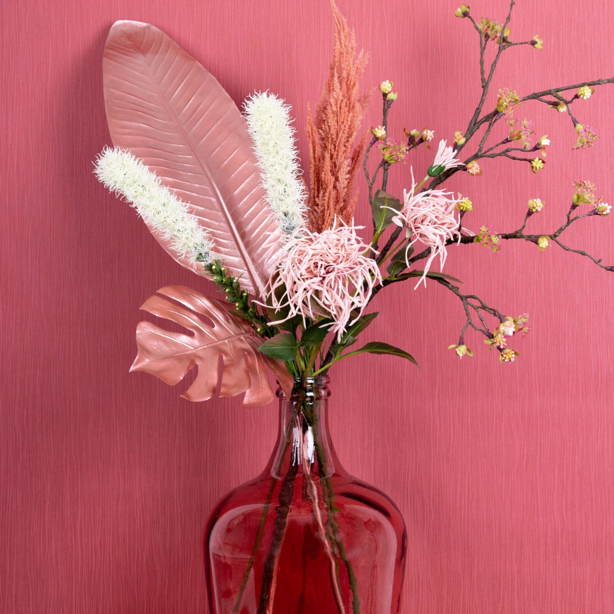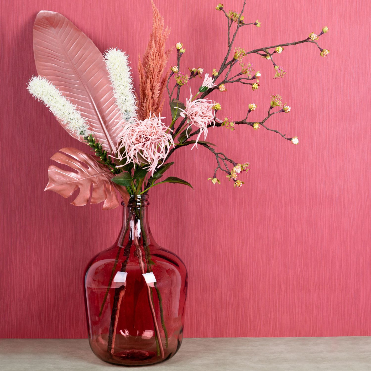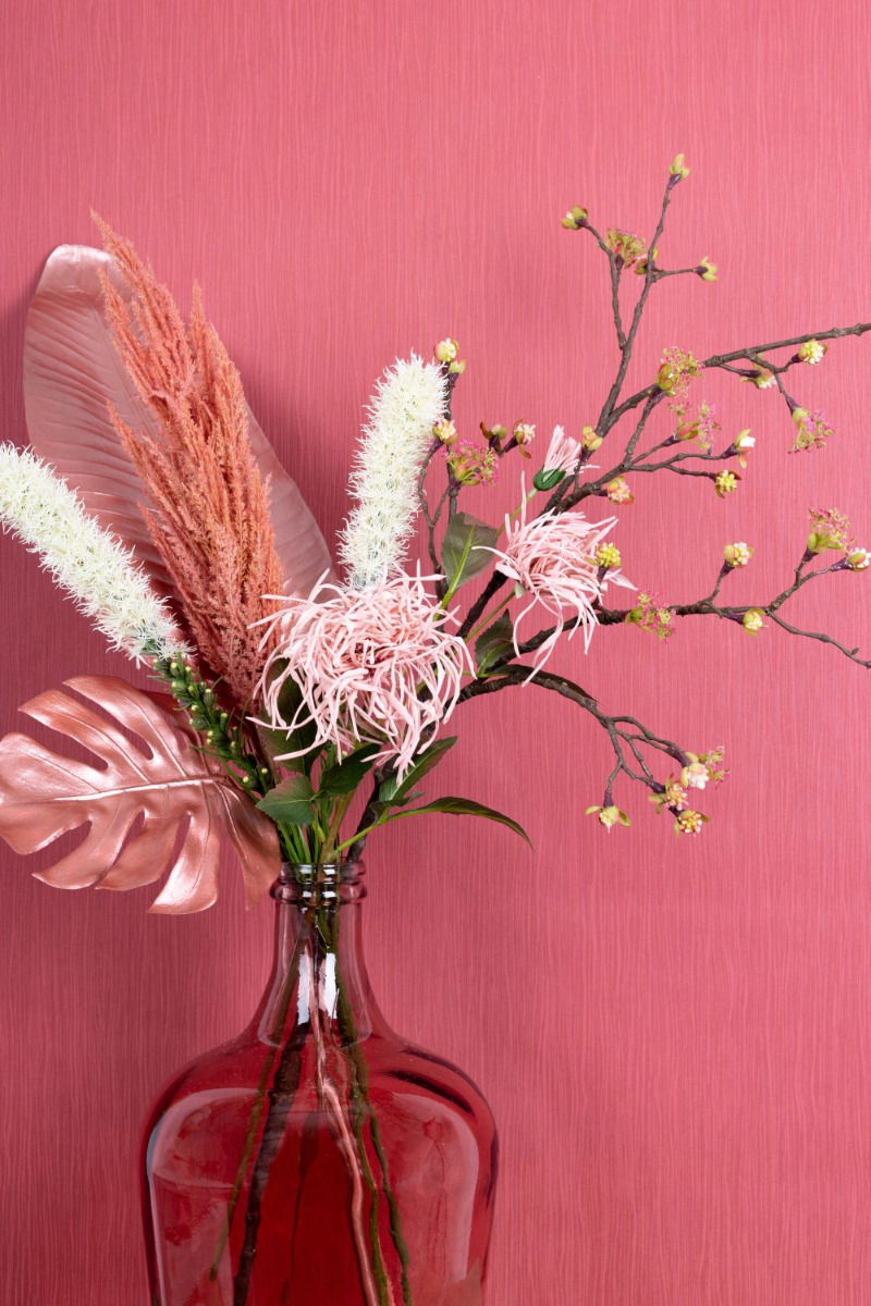 Pudrové a růžové! Typické letní barvy jsou často v pudrové škále. Růžové tóny dokonale ladí s lesklými kovově růžovými listy. Květy javorové větve se třpytí za jednobarevným designem vzhledu a v každé místnosti vypadají opravdu kouzelně! K završení velmi ženského vzhledu jsme zvolili skleněný balonek v barvě růže. Ke starorůžovému pozadí se prostě dokonale hodí. Nakupujte tento vzhled!