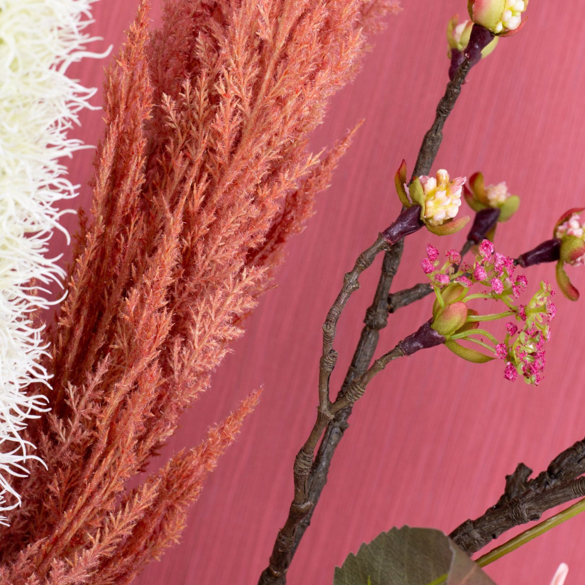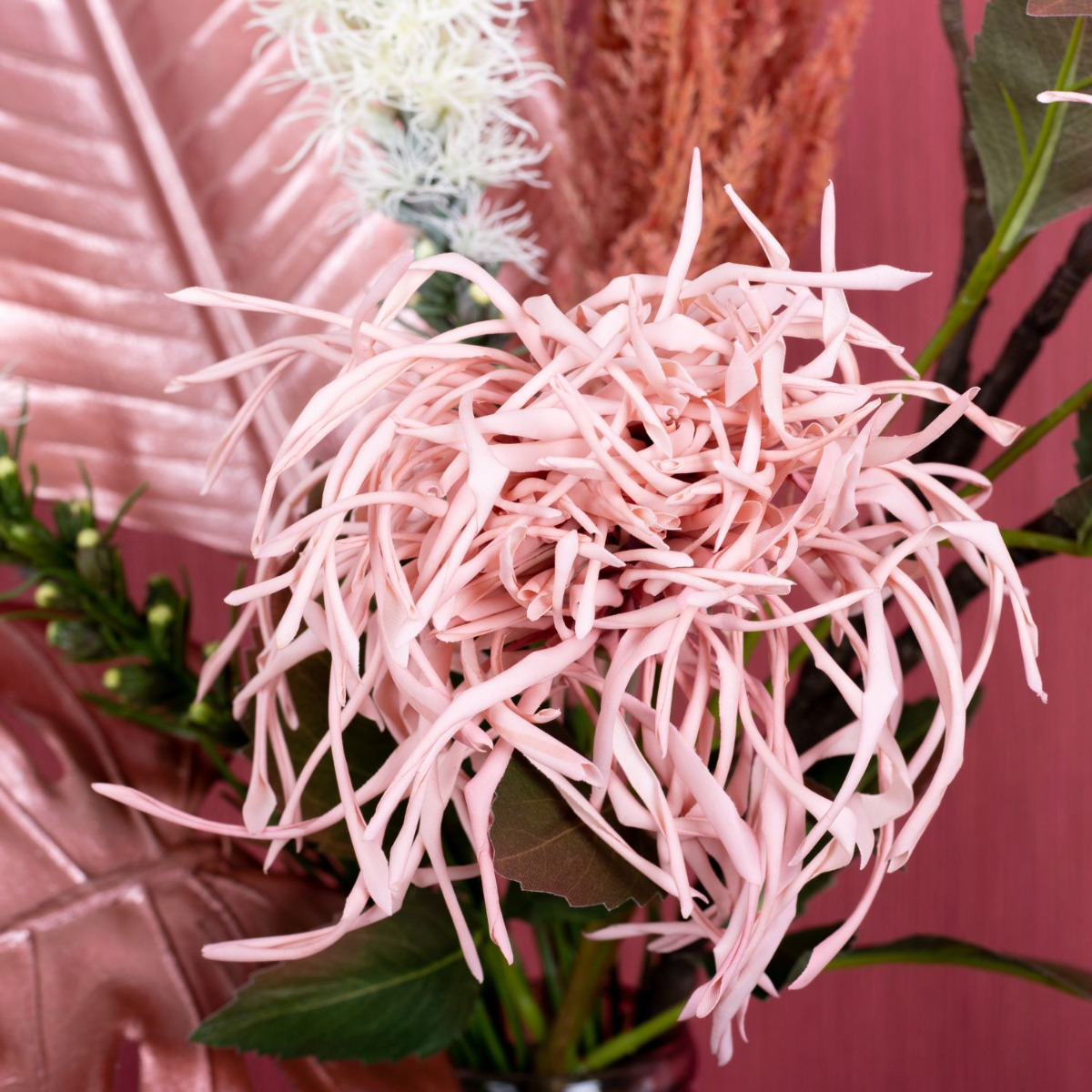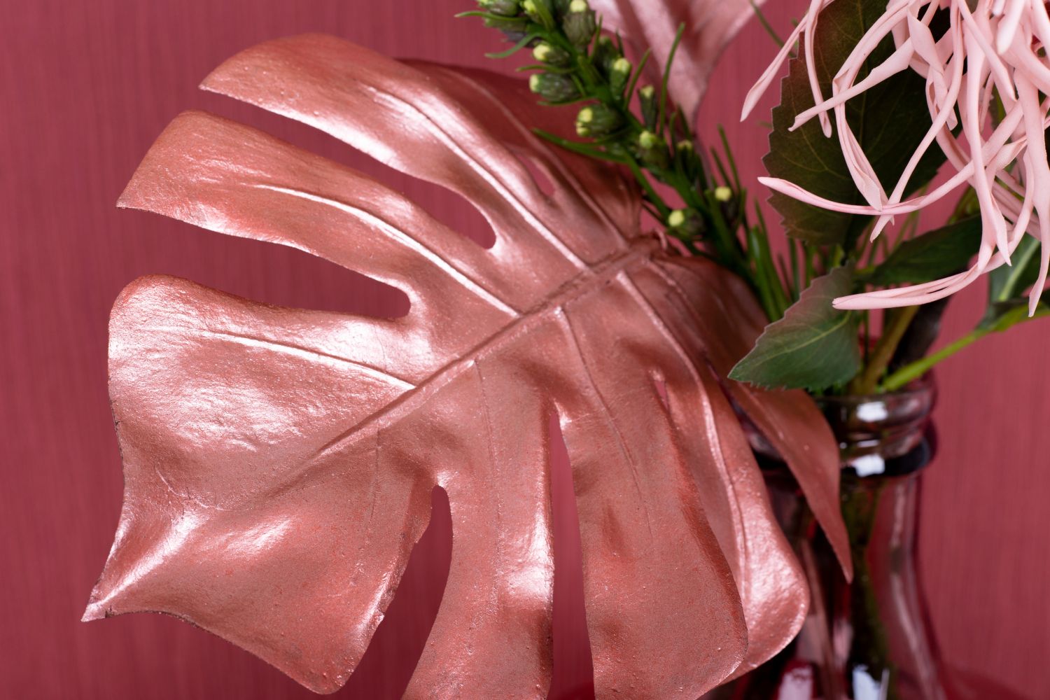 Pudrové a růžové! Typické letní barvy jsou často v pudrové škále. Růžové tóny dokonale ladí s lesklými kovově růžovými listy. Květy javorové větve se třpytí za jednobarevným designem vzhledu a v každé místnosti vypadají opravdu kouzelně! K završení velmi ženského vzhledu jsme zvolili skleněný balonek v barvě růže. Ke starorůžovému pozadí se prostě dokonale hodí. Nakupujte tento vzhled!