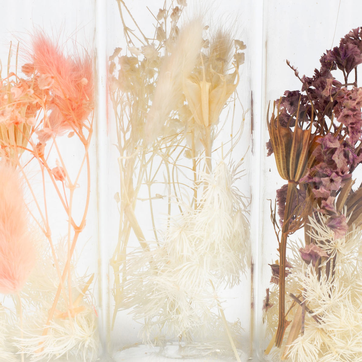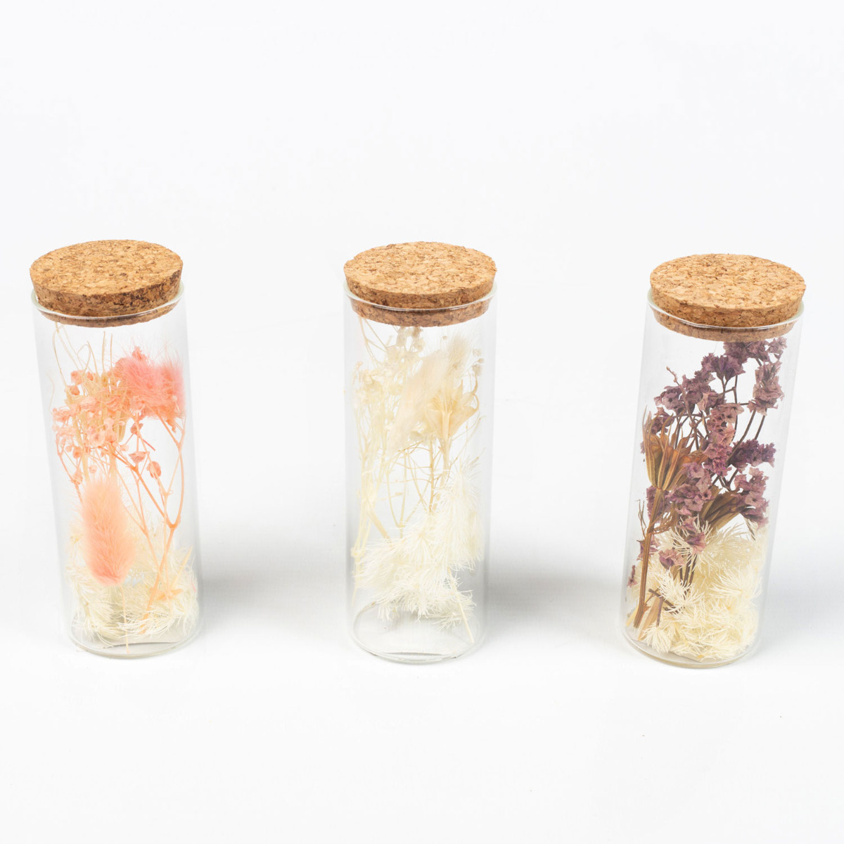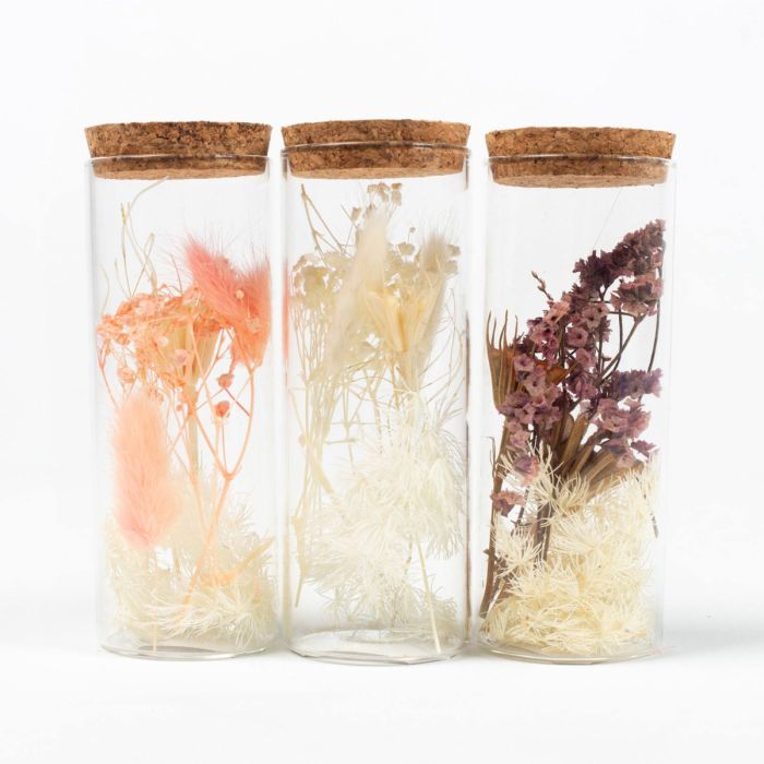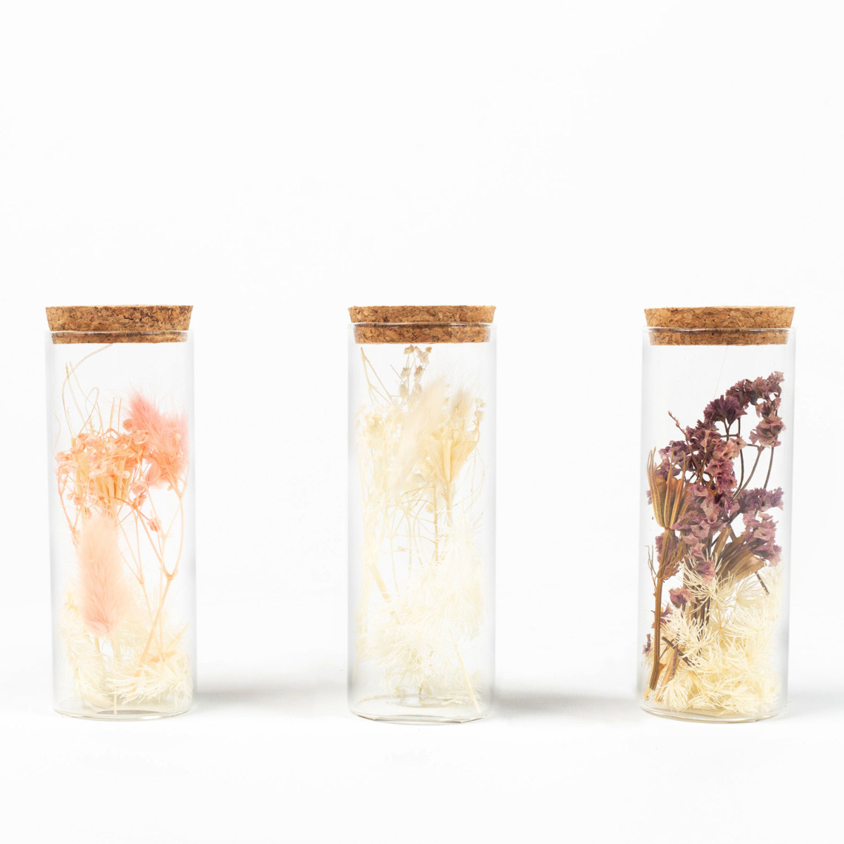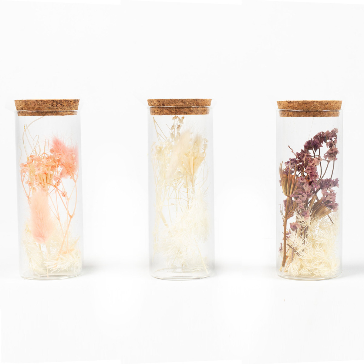 Sada sušených květin ve skle FELICITY, 3 kusy, růžovo-fialovo-bílá, 12,5cm, Ø4,5cm
