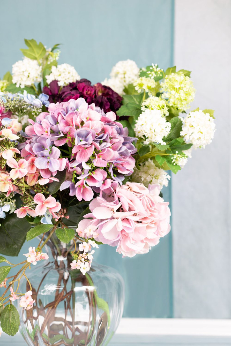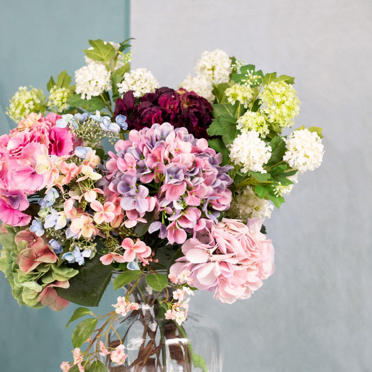Zlaté květy v plné kráse! Bujné květy hortenzie dělají z této kytice něco mimořádně krásného. Umělé květiny jsou ve všech barvách a vyznačují se akvarelovým vzhledem. Mezi kyprými květy se nacházejí také menší květenství panikové hortenzie a také japonská sněhová koule, která vyčnívá dolů nad baňatou skleněnou vázu. Zelené a bílé květy sněhové koule v zadní části umělé kytice jsou závěrečnou tečkou. Chcete také dodat svému obytnému prostoru novou jiskru? Nakupte si tento vzhled!
