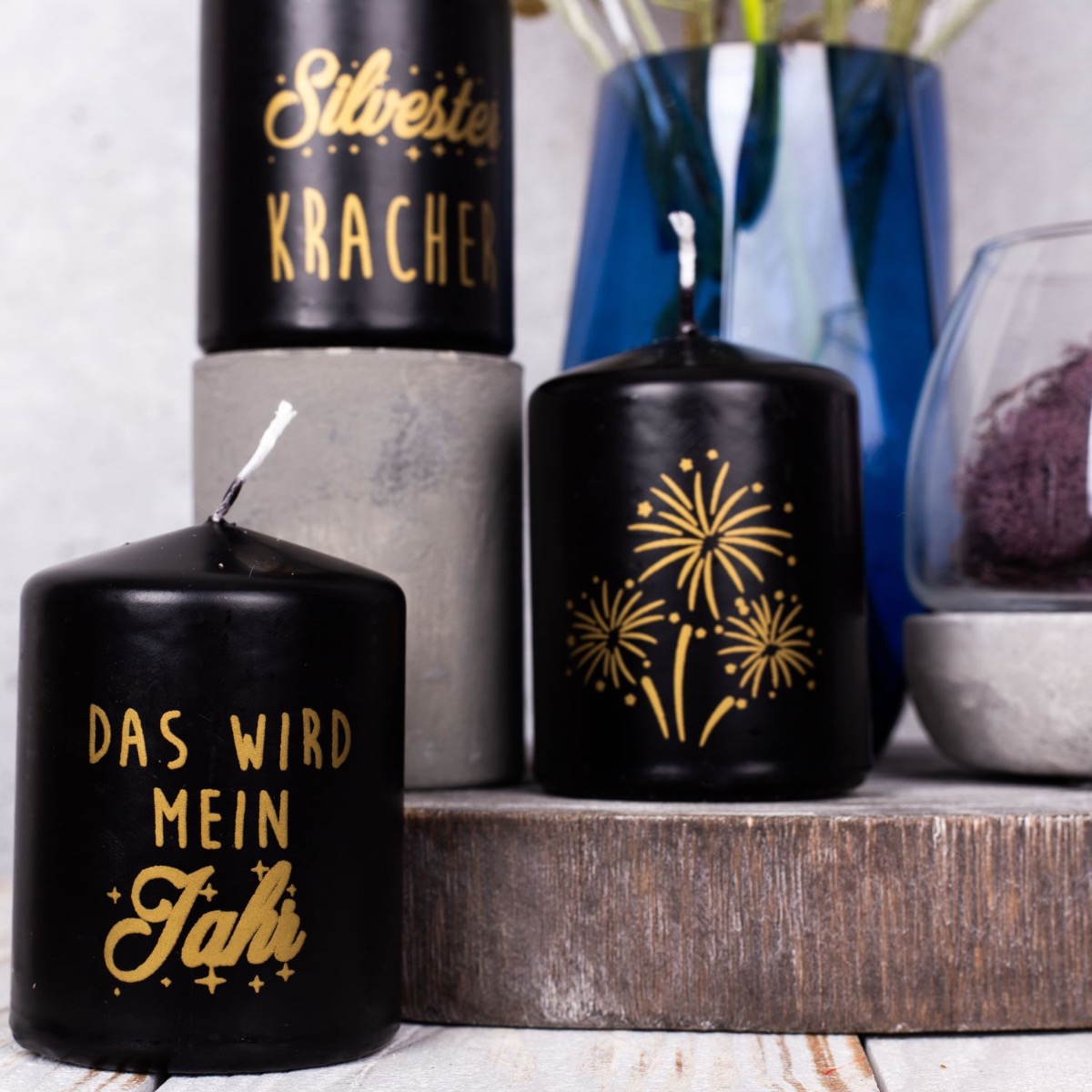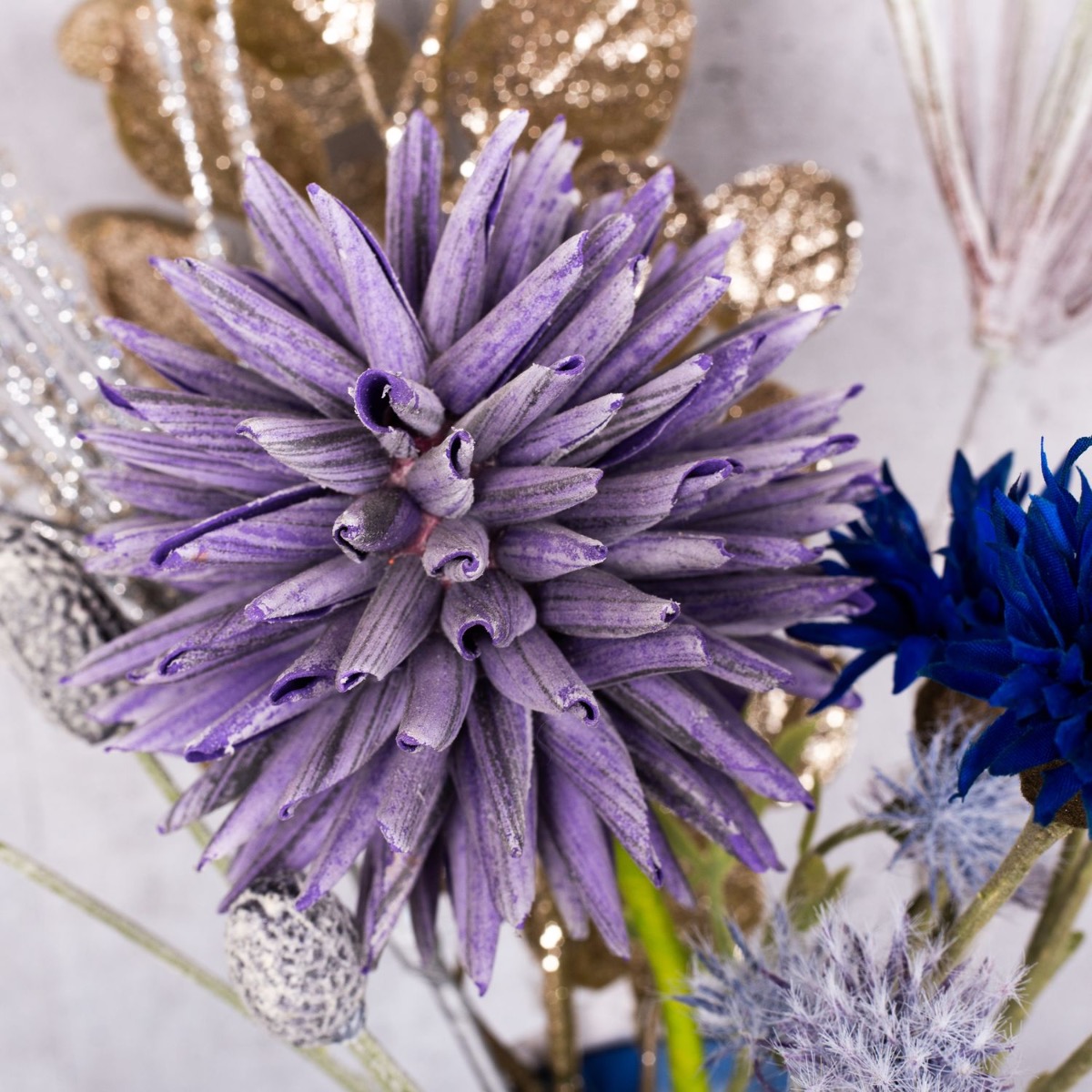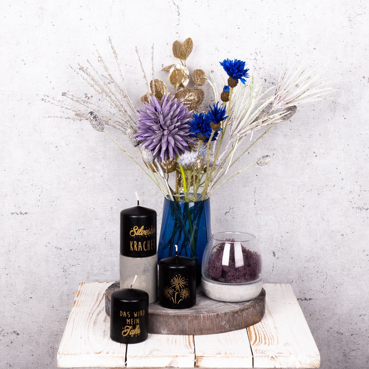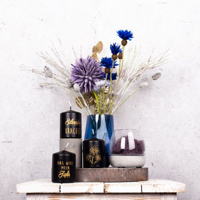 Fialová a modrá! Atypická barevná kombinace, která vytváří svěží a barevnou zimní náladu. Se silvestrovskými svíčkami se tento vzhled skvěle hodí na silvestrovský večírek, kterým společně zakončíme rok. Malá kytice modrých chrp a okrasného česneku v barvě lila už vypadá jako malý ohňostroj, který podtrhují zmrzlé větvičky borovice a třpytivá větvička borovice. Sklenici se svíčkou na betonovém podstavci jsme vyplnili přírodním mechem v odpovídající barvě. Ať může párty začít. Nakupte si tento vzhled!