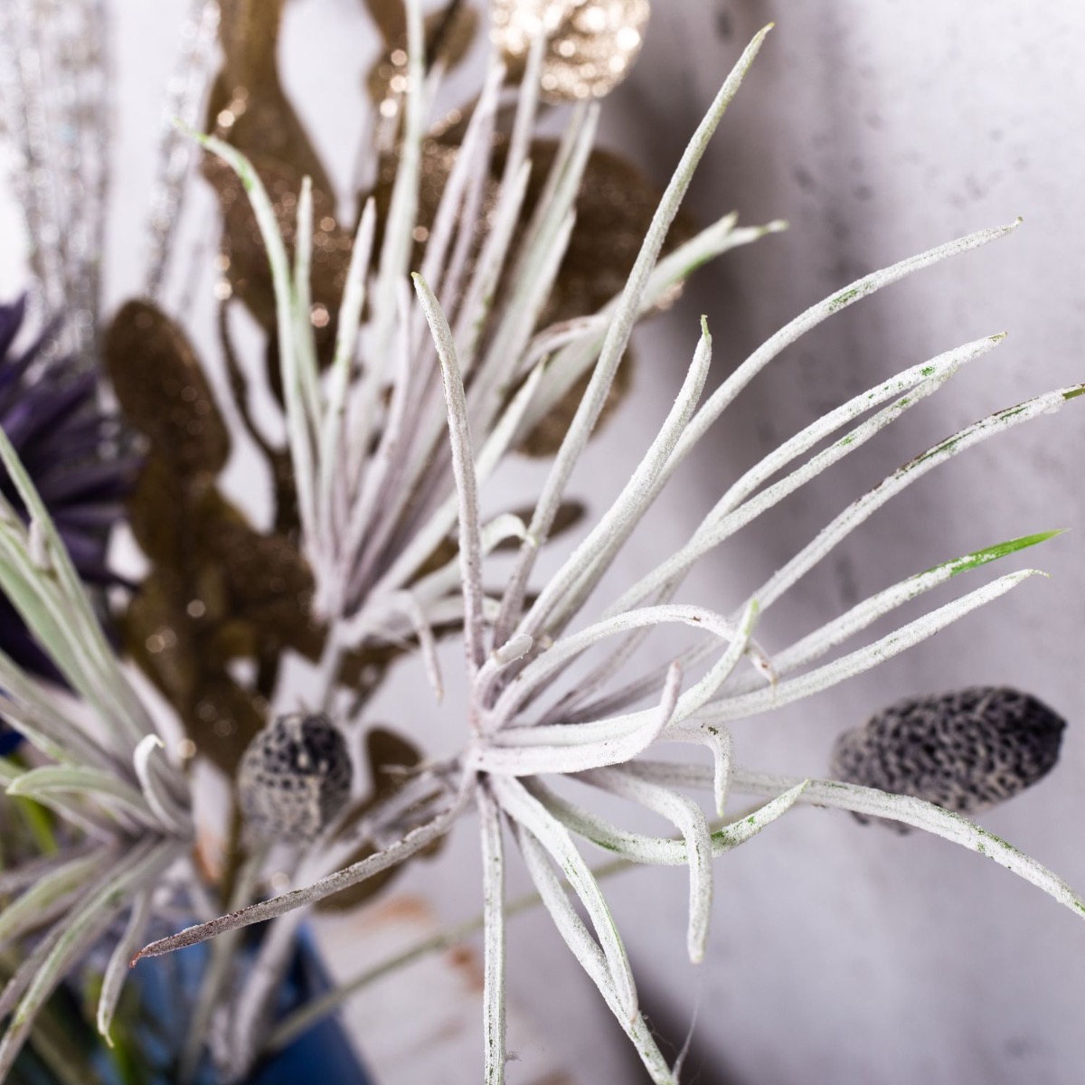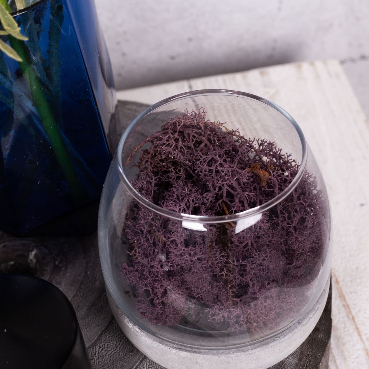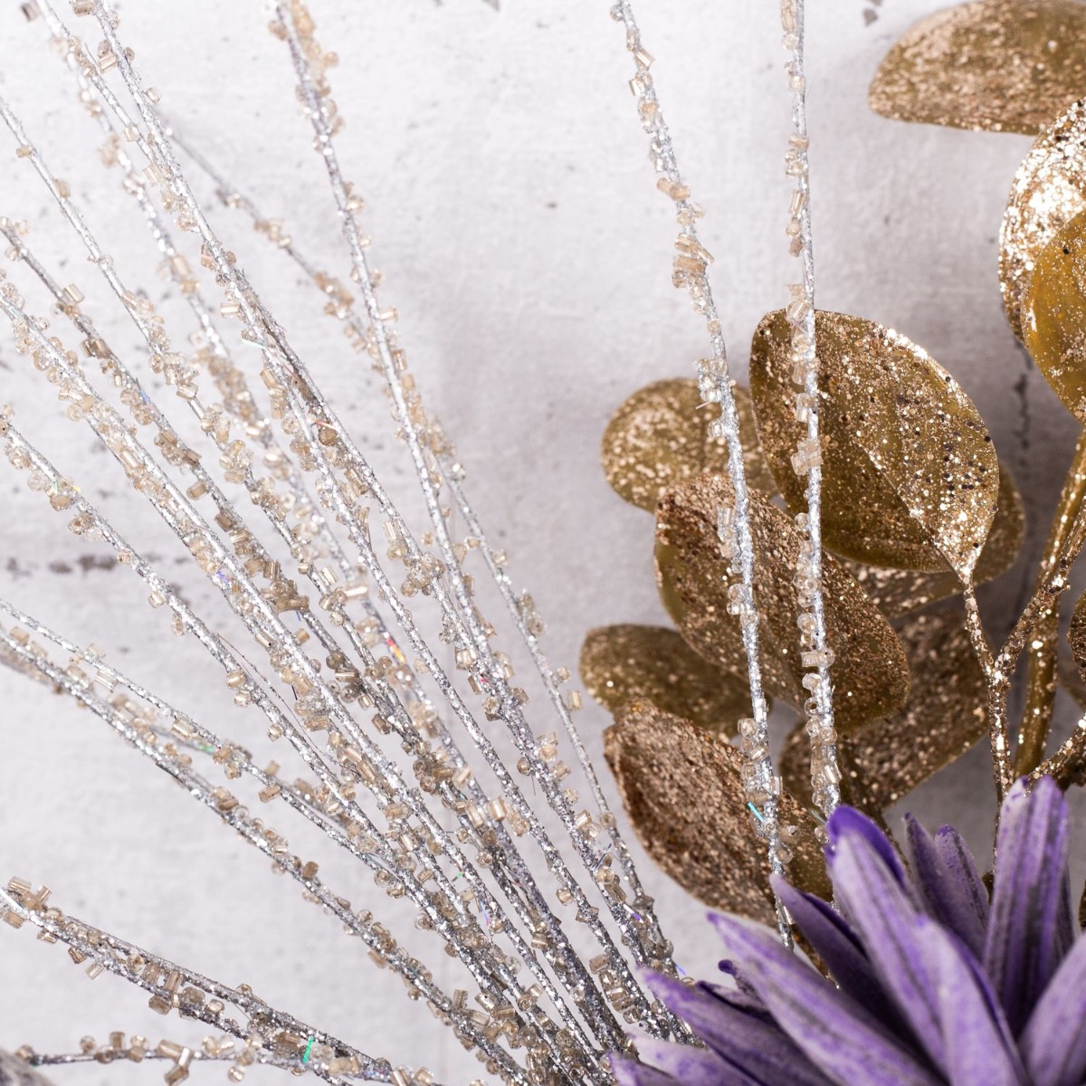 Fialová a modrá! Atypická barevná kombinace, která vytváří svěží a barevnou zimní náladu. Se silvestrovskými svíčkami se tento vzhled skvěle hodí na silvestrovský večírek, kterým společně zakončíme rok. Malá kytice modrých chrp a okrasného česneku v barvě lila už vypadá jako malý ohňostroj, který podtrhují zmrzlé větvičky borovice a třpytivá větvička borovice. Sklenici se svíčkou na betonovém podstavci jsme vyplnili přírodním mechem v odpovídající barvě. Ať může párty začít. Nakupte si tento vzhled!