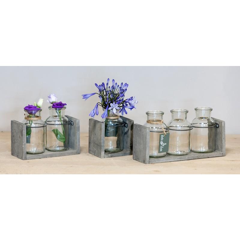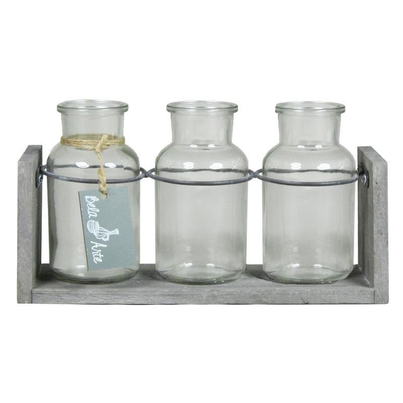 Skleněné láhve LORRIE s dřevěným stojanem, 3 sklenice, čiré, 25x8x13cm