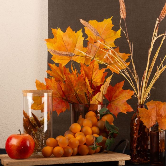 Hnědá a oranžová! To jsou klasické podzimní barvy. Zvláště javorové listy mají na podzim obzvláště krásné barvy. Oranžová magicky září a vnáší podzim do vašeho domova. Úložná nádoba naplněná podzimními sušenými květy se k tomuto podzimnímu vzhledu skvěle hodí. Pšeničné klasy, červená jablka a oranžově zbarvené hrozny připomínají nadcházející období sklizně. Naše nabídka lahví a váz obsahuje řadu výrobků v hnědé a oranžové barvě. Nakupte si tento vzhled!