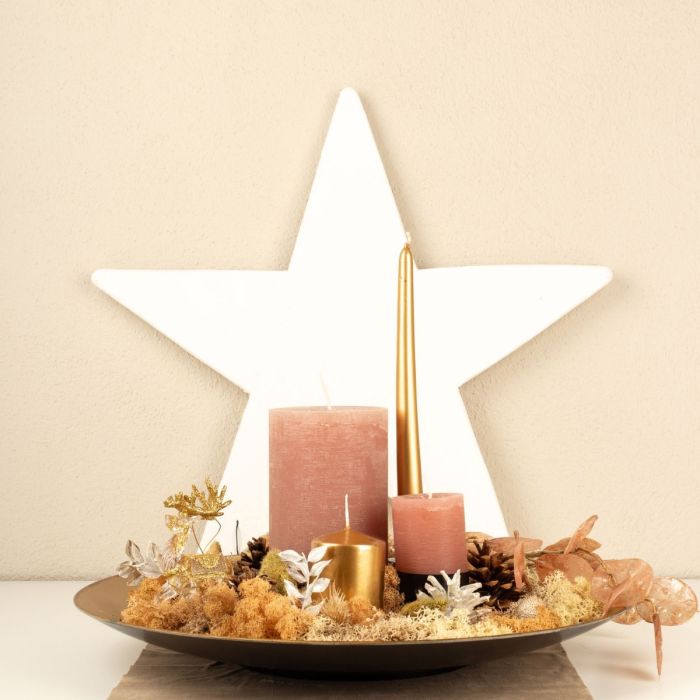 Designový tip: Nejprve umístěte svíčky na talíř tak, aby nemohly spadnout. Poté na talíř umístěte přírodní mech. Dbejte na to, aby byly barvy rovnoměrně rozložené. Navrch položte šišky a malé sušené větvičky a naaranžujte je podle chuti. Můžete také přidat další dekorativní prvky, například ozdoby na vánoční stromeček nebo hvězdy.