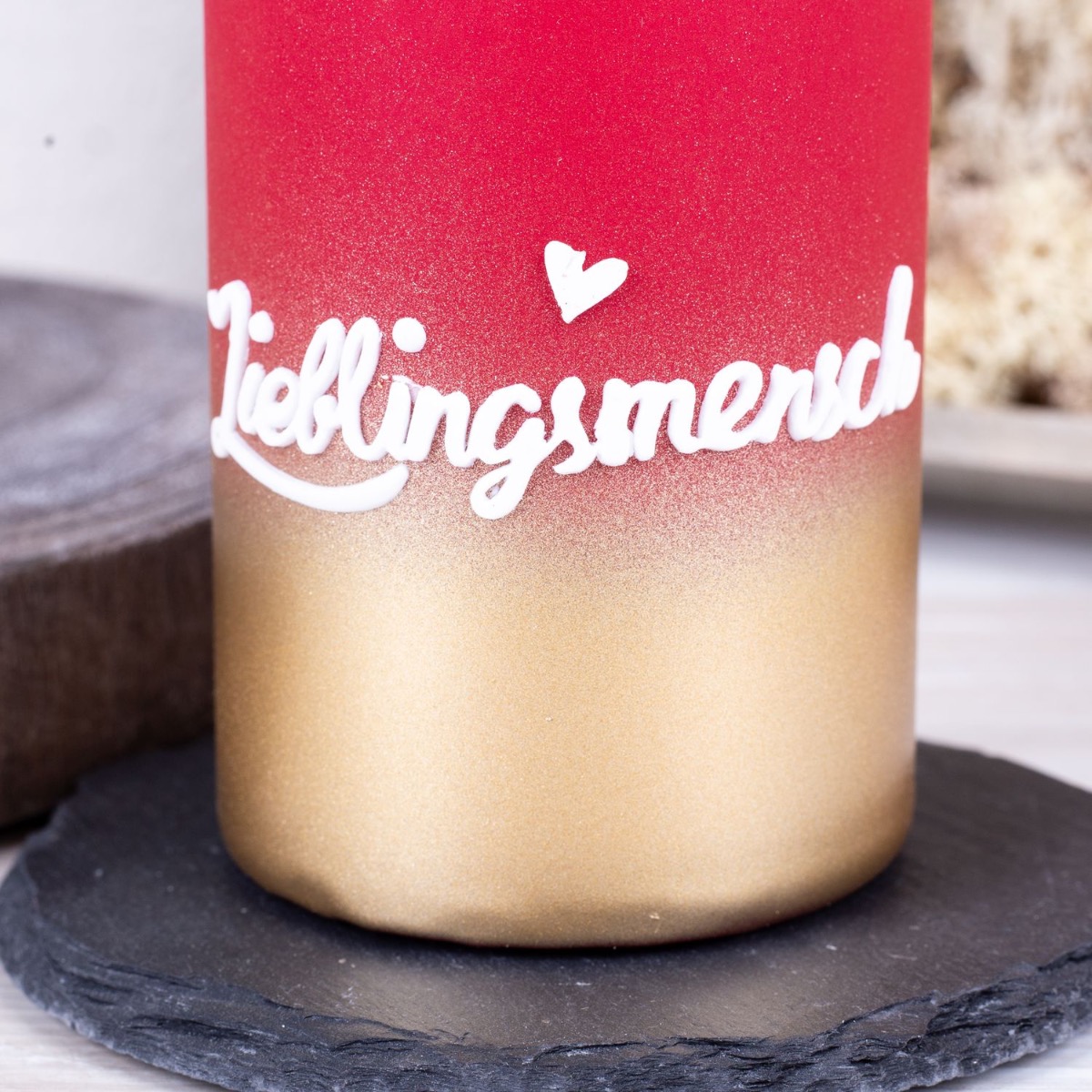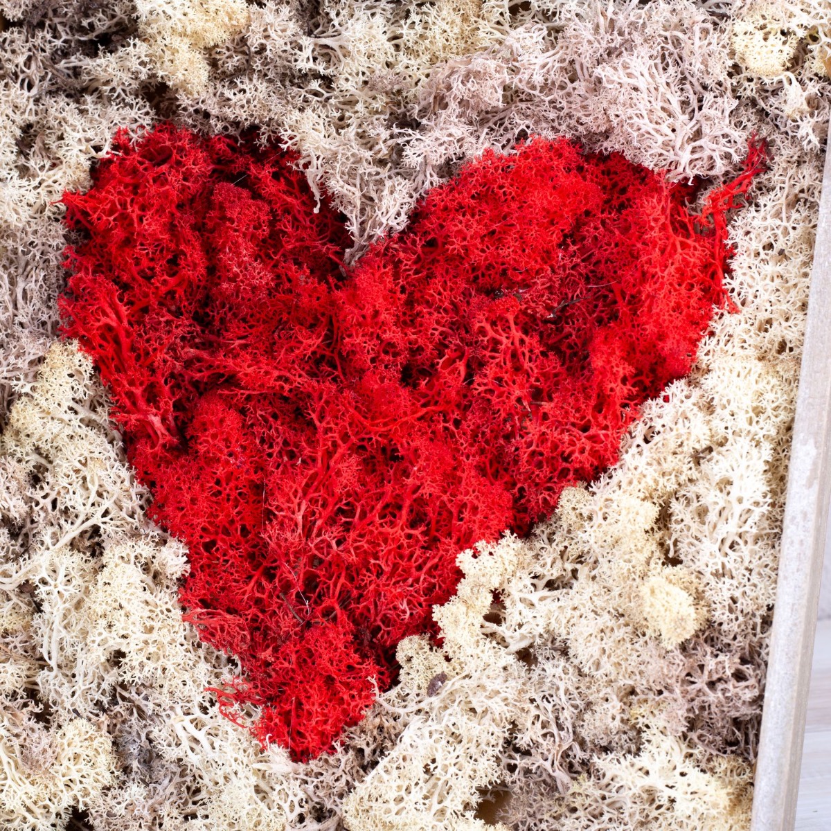Designový tip: Růže mírně ohněte a svažte do kytice. V případě potřeby je zkraťte na velikost vázy. Na srdce z přírodního mechu budete potřebovat tavnou lepicí pistoli. Začněte srdcem a červený přírodní mech ve tvaru srdce nalepte na dřevěný podnos, který zde byl přeměněn na rámeček na obraz. Obrys srdce může být trochu nepřesný, protože tak vznikne přírodní efekt. Jakmile budete s tvarem srdce spokojeni, vyplňte zbytek dřevěného rámu druhou barvou mechu.