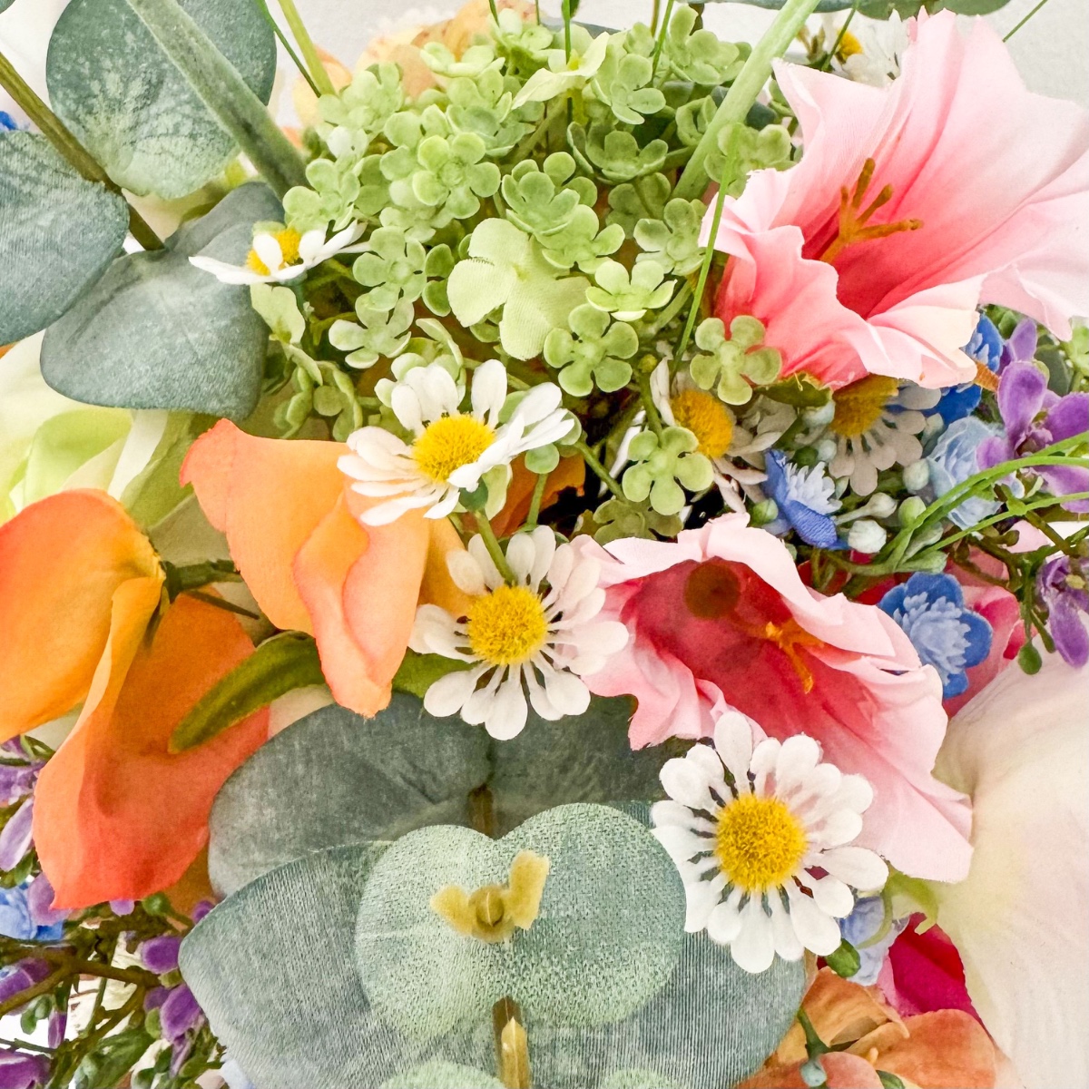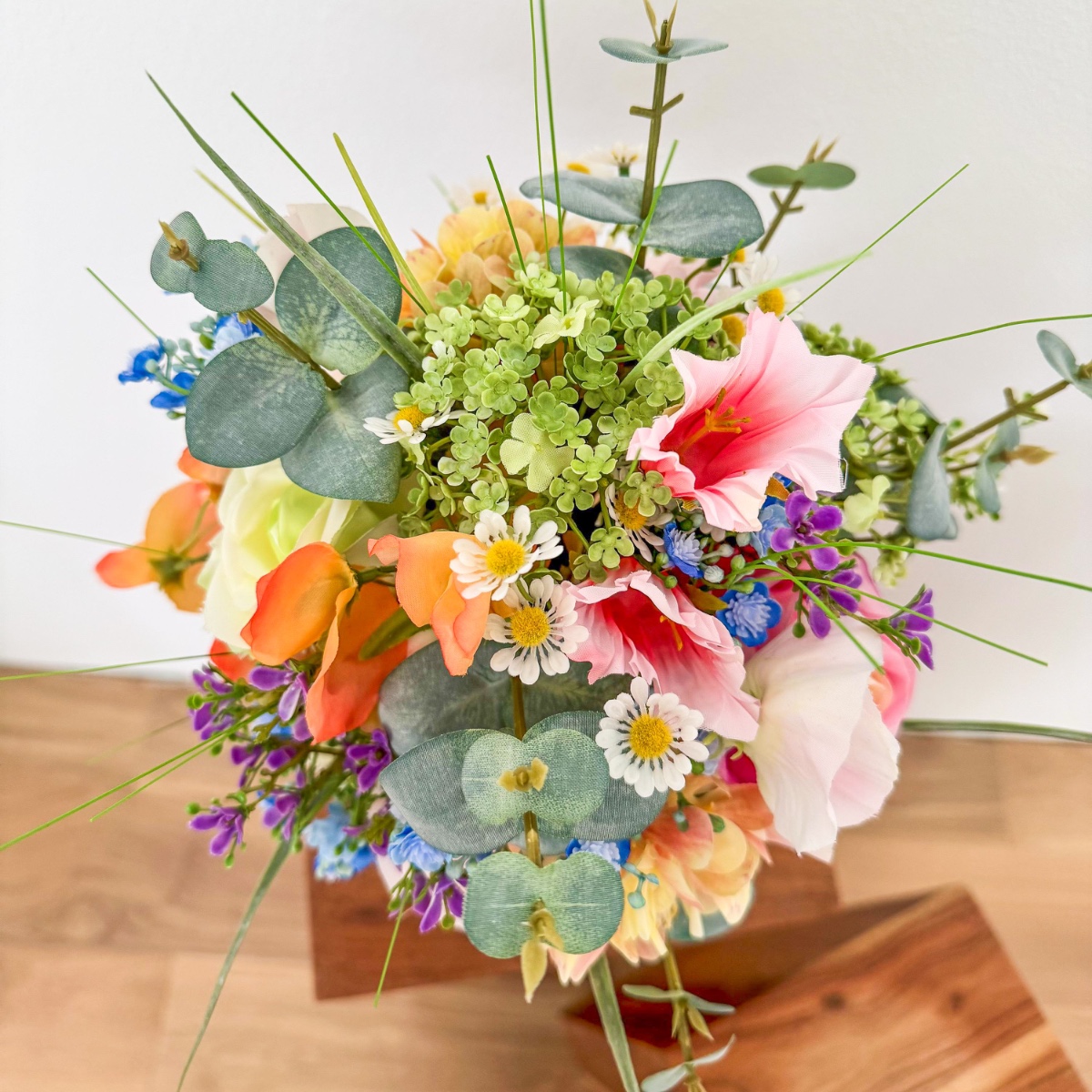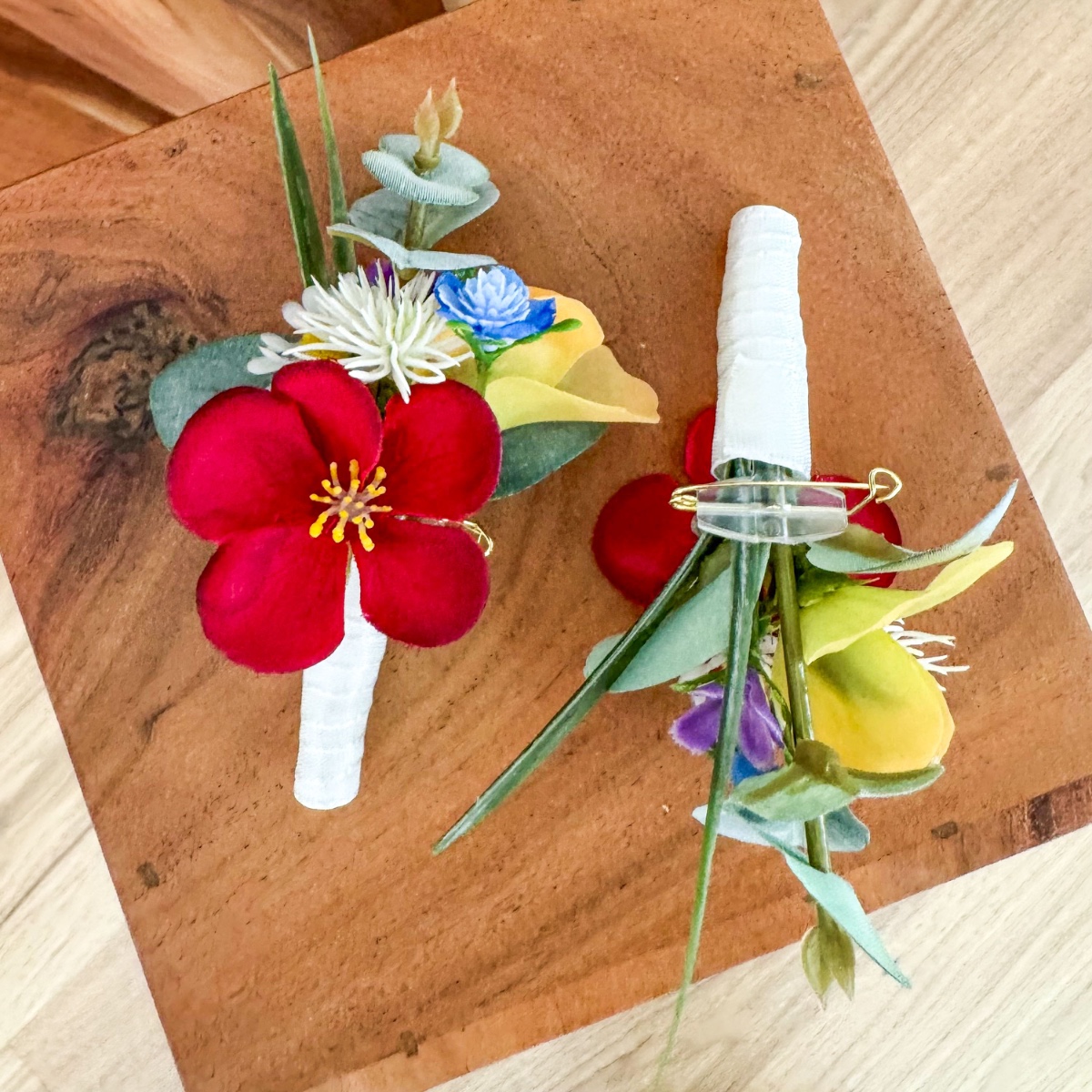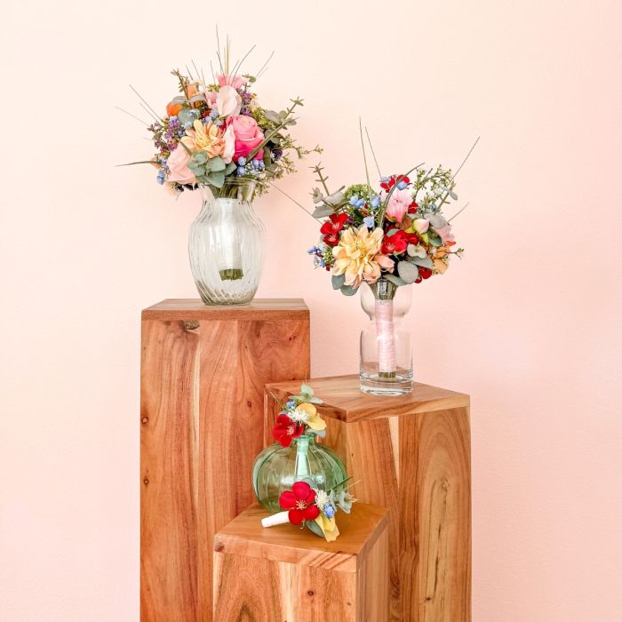 Romantika louky v té nejvznešenější podobě! Inspirována osobními přáními nevěsty a s láskou vybranou referenční fotografií vznikla tato zcela výjimečná svatební kytice – vytvořená na míru, aby se skutečný sen stal skutečností. Přání: kytice, která zachycuje přirozenost louční květinové kompozice a zároveň vyzařuje eleganci a luxus. Díky kombinaci četných květů, jako jsou scabiosa, zvonky, lathyrus, heřmánek a luční chrpa, vzniká volný a lehký charakter luční kytice. Růže a jemná gypsophila dodávají aranžmá ušlechtilou hloubku a zajišťují stylovou rovnováhu mezi přirozeností a elegancí. Kytice je svázána kompaktně, díky čemuž působí obzvláště harmonicky a luxusně. Jednotlivé větvičky – zejména trávy a eukalyptus – volně vyčnívají a přirozeně prolomují tvar. Vzniká tak živá silueta s jemným pohybem, která dodává kytici moderní a zároveň romantický vzhled. Barevná paleta v jemných odstínech broskvové, růžové a zelené odráží romantickou lehkost konceptu a podtrhuje přirozený vzhled – ideální pro svatbu s osobním nádechem, i daleko od domova. Odpovídající svatební kytice navazuje na tento design a je doplněna malými červenými kvítky, které dodávají milý, hravý akcent. Dvě sladěné korsáže stylově dotvářejí celkový dojem. Svatební kytice, která ukazuje, jak z nápadu a vašich představ vzniká jedinečný květinový design – osobní, emotivní a s velkou láskou k detailu. Kupte si tento look!