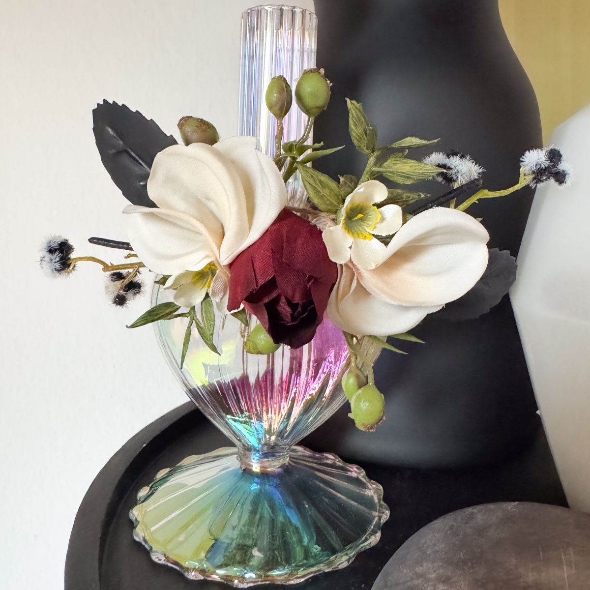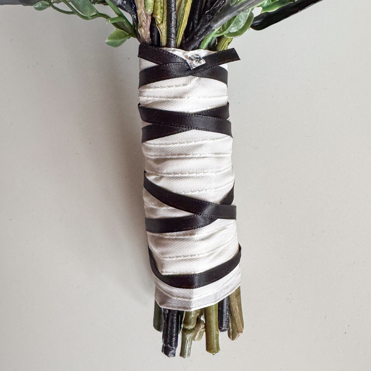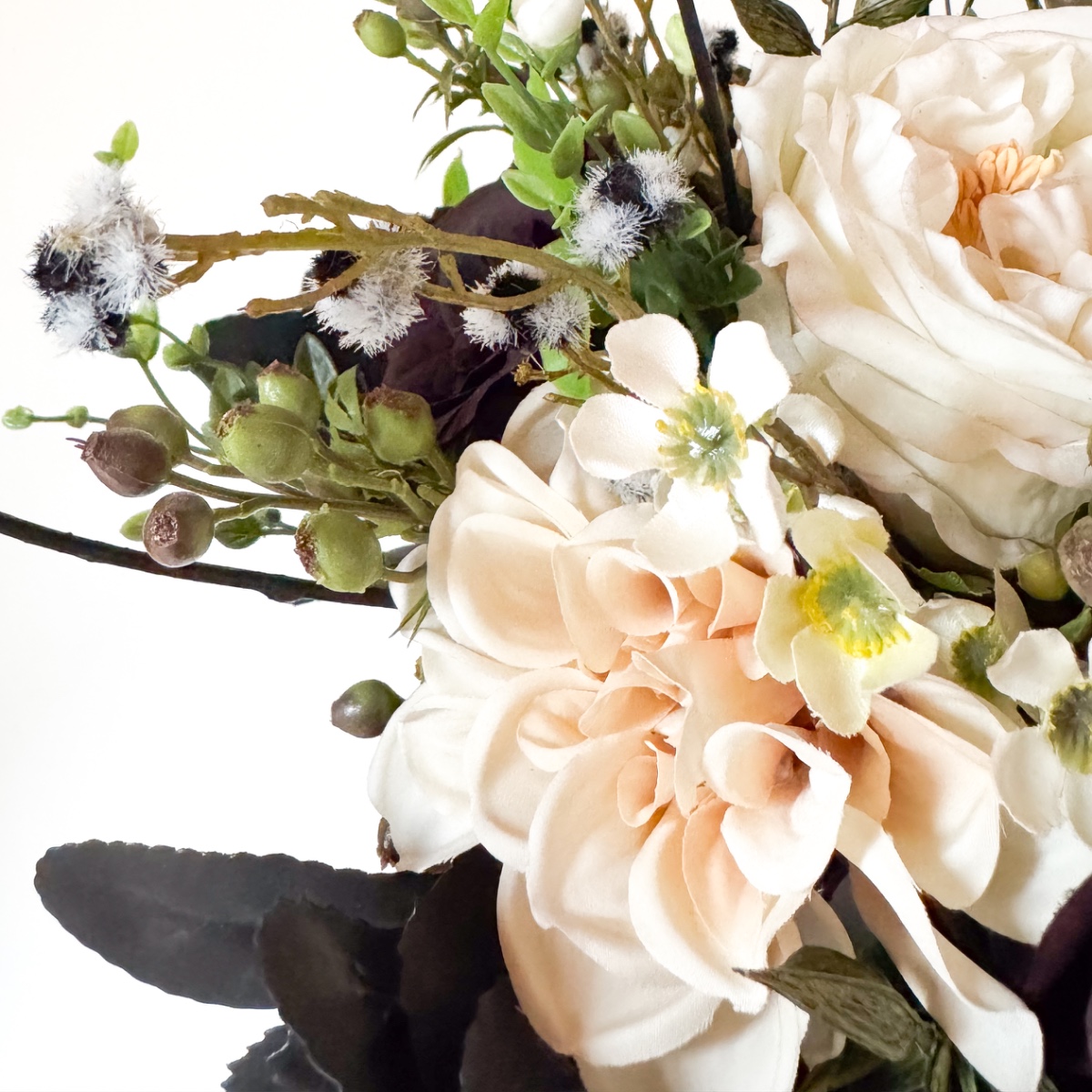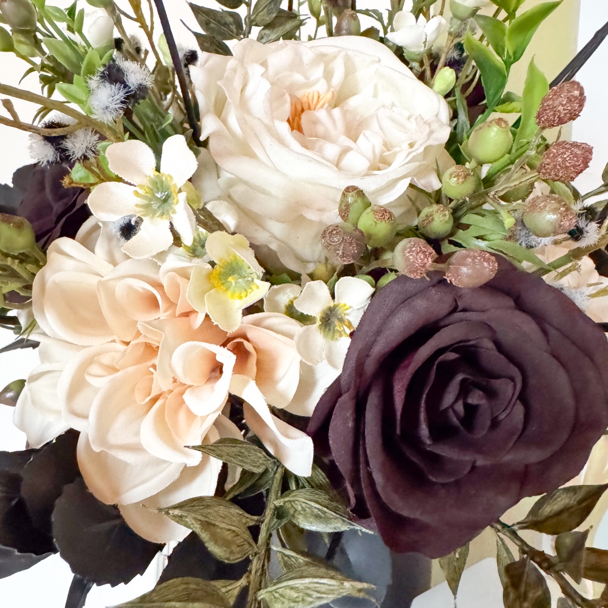 Láska v každém okvětním lístku! V den svatby Nicole, 31. října 2025, musí vše dokonale ladit – od zářivých svatebních šatů až po každý květinový detail. Svatební kytice odráží tuto kouzelnou harmonii: jemné krémové růže a pudrové jiřiny se mísí s tajemnými černými a tmavě červenými růžemi a vytvářejí kytici plnou elegance a hloubky. Jemné voskové květiny v krémové barvě a malé bobule myrty dodávají kytici hravý akcent, zatímco černobílá Stirlingia latifolia jí propůjčuje moderní, rafinovaný nádech. Myší trn a liguster se jemně vkládají jako zelené listy mezi květy, zatímco mate a dřín zdůrazňují tajemné černé odstíny – květinová báseň, která perfektně ladí s šaty v barvě nude s černými krajkovými akcenty. A jako třešnička na svatebním účesu: ladící sponka do vlasů, která navazuje na barvy a elegantní náladu kytice, jako jemné zrcadlo květinové nádhery. Každý květ, každá větvička bobulí a každý černý akcent vypráví malý kousek jejího milostného příběhu a činí tento okamžik nezapomenutelným. Kupte si tento look!