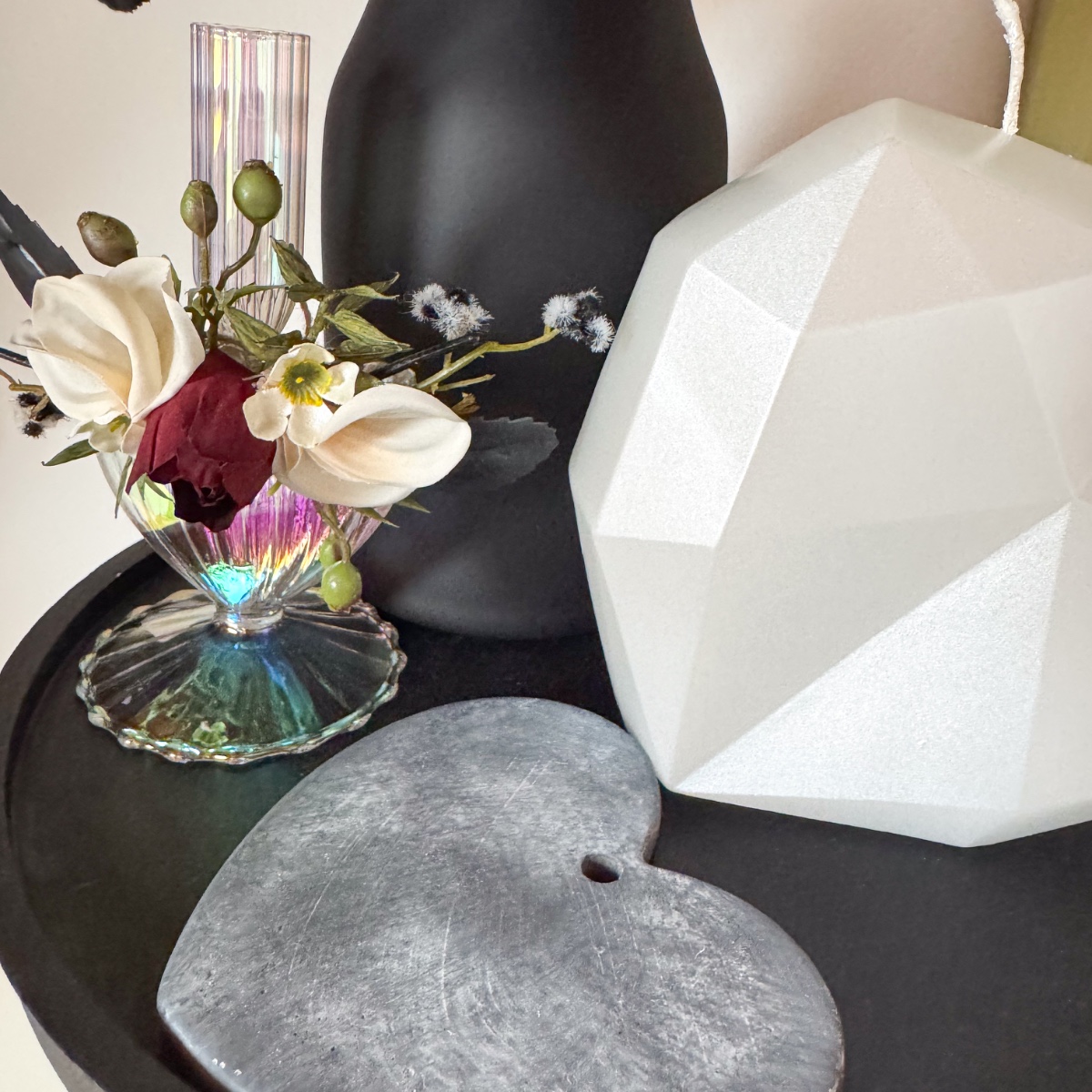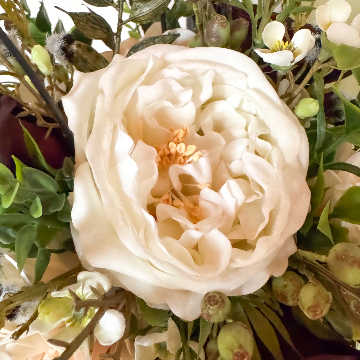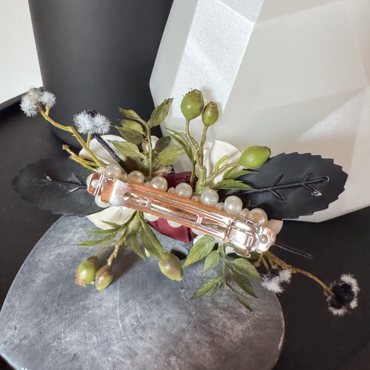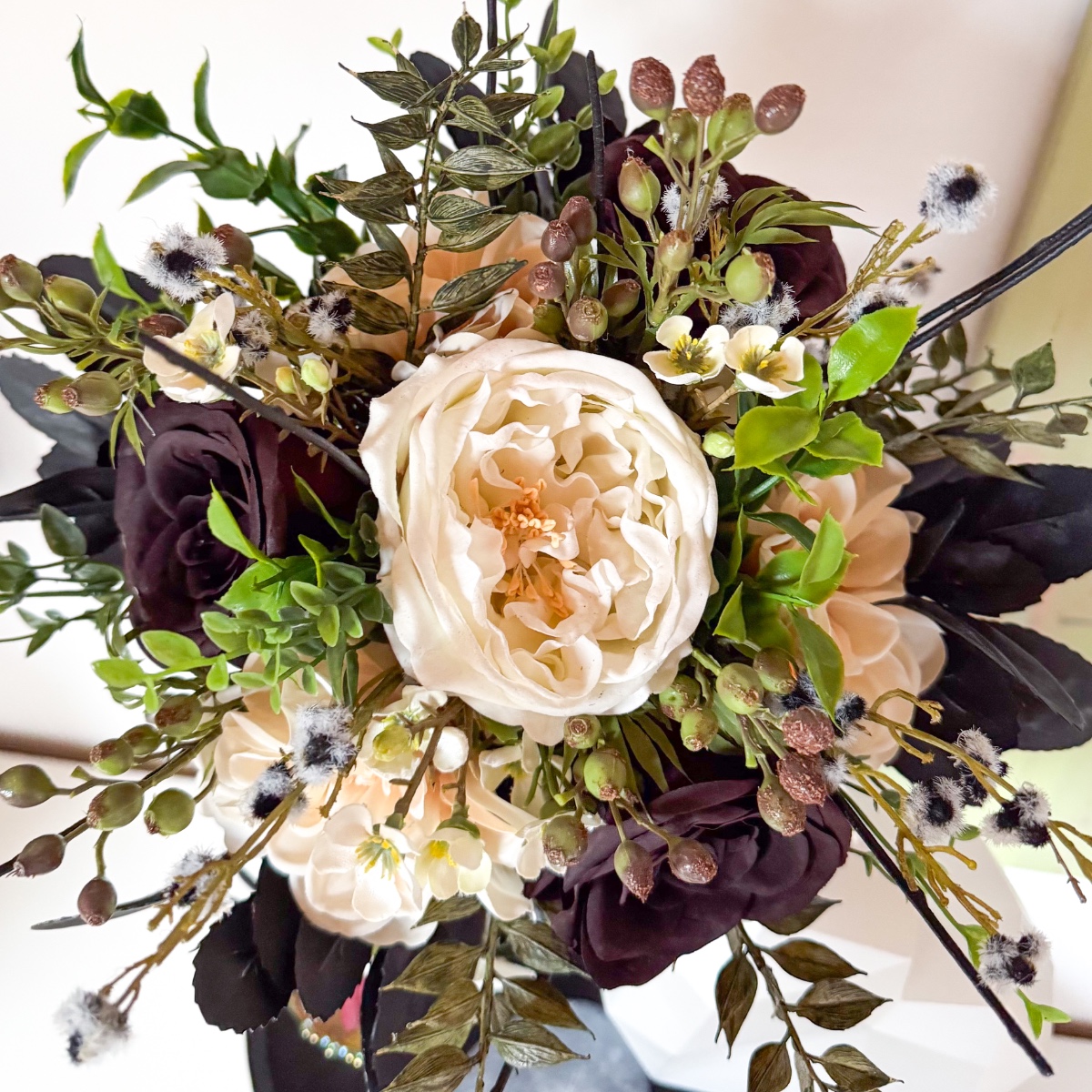 Láska v každém okvětním lístku! V den svatby Nicole, 31. října 2025, musí vše dokonale ladit – od zářivých svatebních šatů až po každý květinový detail. Svatební kytice odráží tuto kouzelnou harmonii: jemné krémové růže a pudrové jiřiny se mísí s tajemnými černými a tmavě červenými růžemi a vytvářejí kytici plnou elegance a hloubky. Jemné voskové květiny v krémové barvě a malé bobule myrty dodávají kytici hravý akcent, zatímco černobílá Stirlingia latifolia jí propůjčuje moderní, rafinovaný nádech. Myší trn a liguster se jemně vkládají jako zelené listy mezi květy, zatímco mate a dřín zdůrazňují tajemné černé odstíny – květinová báseň, která perfektně ladí s šaty v barvě nude s černými krajkovými akcenty. A jako třešnička na svatebním účesu: ladící sponka do vlasů, která navazuje na barvy a elegantní náladu kytice, jako jemné zrcadlo květinové nádhery. Každý květ, každá větvička bobulí a každý černý akcent vypráví malý kousek jejího milostného příběhu a činí tento okamžik nezapomenutelným. Kupte si tento look!