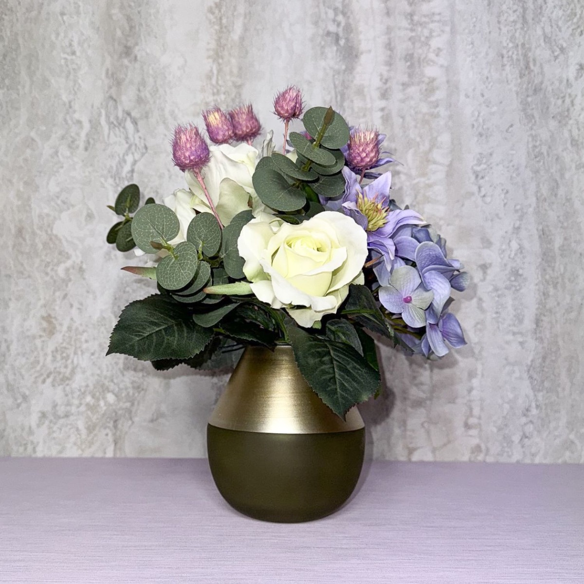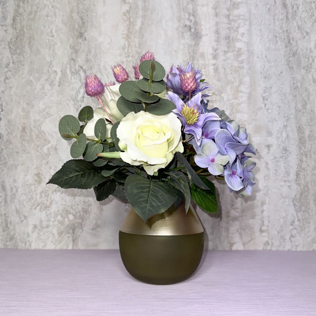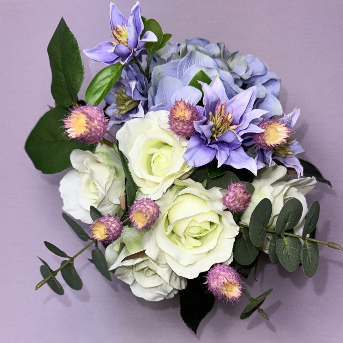 Láska kvete navždy! Při procházení našeho internetového obchodu narazila naše stálá zákaznice Monika na projekt bývalé zákaznice svatební kytice. Zajímalo ji, zda by bylo možné znovu vytvořit její vlastní svatební kytici, a napsala nám zprávu. Chtěla, aby kytice byla pro její ženu nezapomenutelným překvapením, které jí bude připomínat jejich svatební den. Krásné vyznání lásky, jak jsme si mysleli. Kytici vyplňuje svěží hortenzie v jemné fialové barvě a růže v krémové barvě. Ty byly doplněny jemným plaménkem a zeleným listovím z větviček jabloní a eukalyptu. Poprvé jsme také použili sušené květiny, které dodaly mezi květy růží barevný nádech. Naše zákaznice byla s replikou svatební kytice velmi spokojená. Chcete také umělou svatební kytici na věčnost? Nakupte si vzhled!
