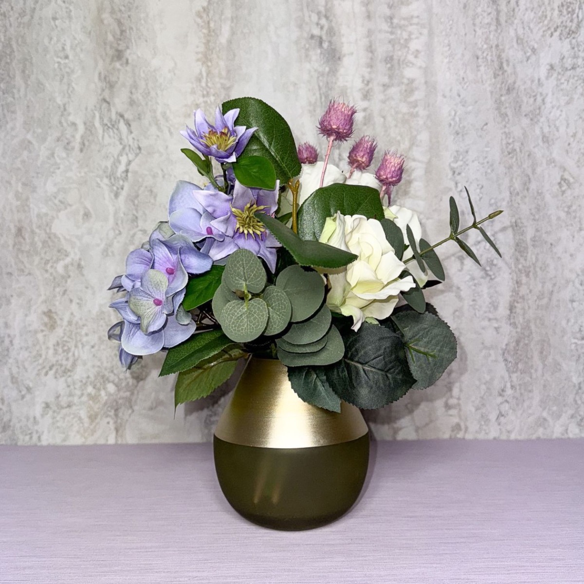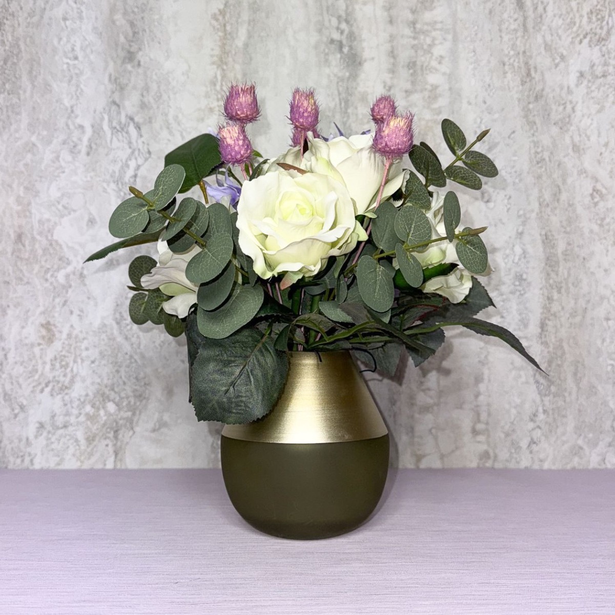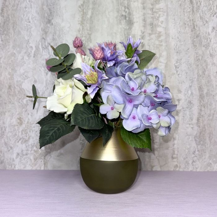 Láska kvete navždy! Při procházení našeho internetového obchodu narazila naše stálá zákaznice Monika na projekt bývalé zákaznice svatební kytice. Zajímalo ji, zda by bylo možné znovu vytvořit její vlastní svatební kytici, a napsala nám zprávu. Chtěla, aby kytice byla pro její ženu nezapomenutelným překvapením, které jí bude připomínat jejich svatební den. Krásné vyznání lásky, jak jsme si mysleli. Kytici vyplňuje svěží hortenzie v jemné fialové barvě a růže v krémové barvě. Ty byly doplněny jemným plaménkem a zeleným listovím z větviček jabloní a eukalyptu. Poprvé jsme také použili sušené květiny, které dodaly mezi květy růží barevný nádech. Naše zákaznice byla s replikou svatební kytice velmi spokojená. Chcete také umělou svatební kytici na věčnost? Nakupte si vzhled!
