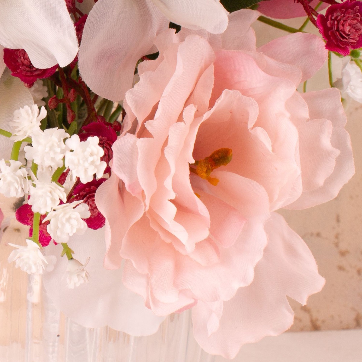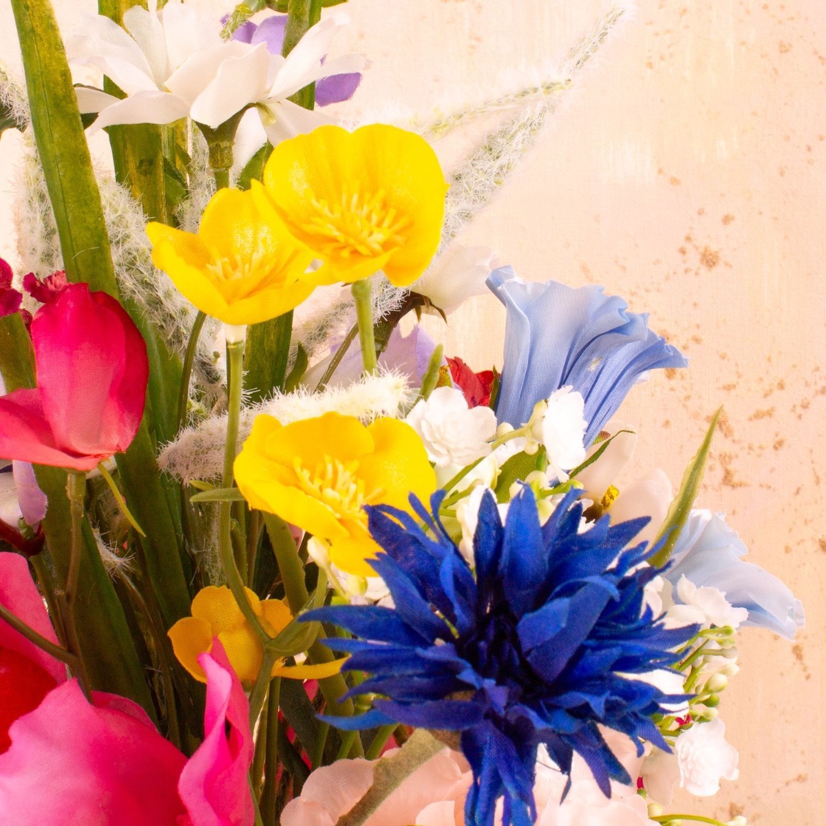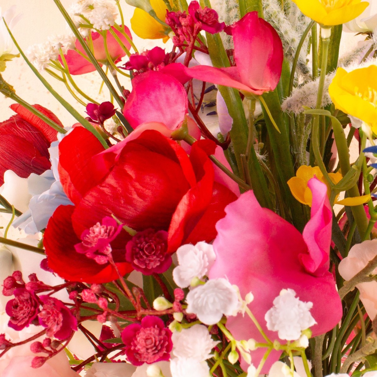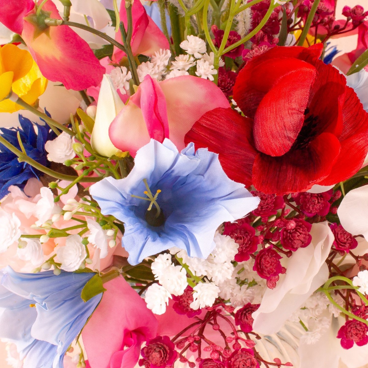 Romantická a barevná! Svatební kytice je něco, co si chcete uchovat navždy. Proč si tedy nepořídit umělou kytici? Heidi byla natolik chytrá, že nechala náš kreativní tým, aby pro ni něco vytvořil. Nejprve nevěděla, jak přesně má kytice vypadat, musela samozřejmě ladit s šaty. Chtěla zkombinovat své světle modré šaty s letní kyticí. Kytice z lučních květin jsou teď v módě! Naši zákazníci jsou z našeho bestselleru Cindana tak nadšeni, že ho často používají jako základ pro své nápady. Jen bodláky použité v této kytici se k sobě tak úplně nehodily. Proto jsme je nahradili růžově zbarvenými vikvemi. Přidali jsme také gypsophily v růžové a bílé barvě, aby kytice dělala čest této příležitosti. Doufáme, že Heidi prožila krásný svatební den! Nakupte si tento vzhled!
