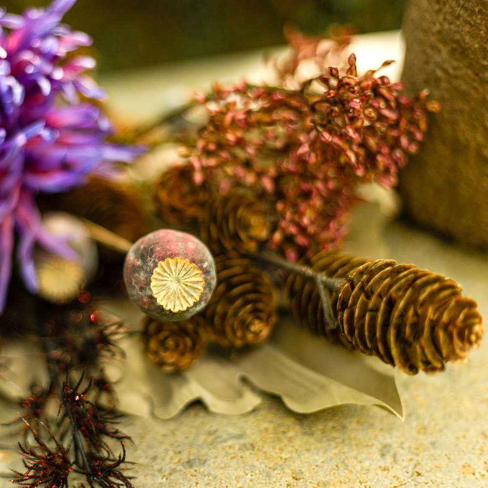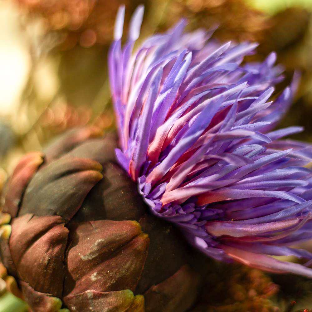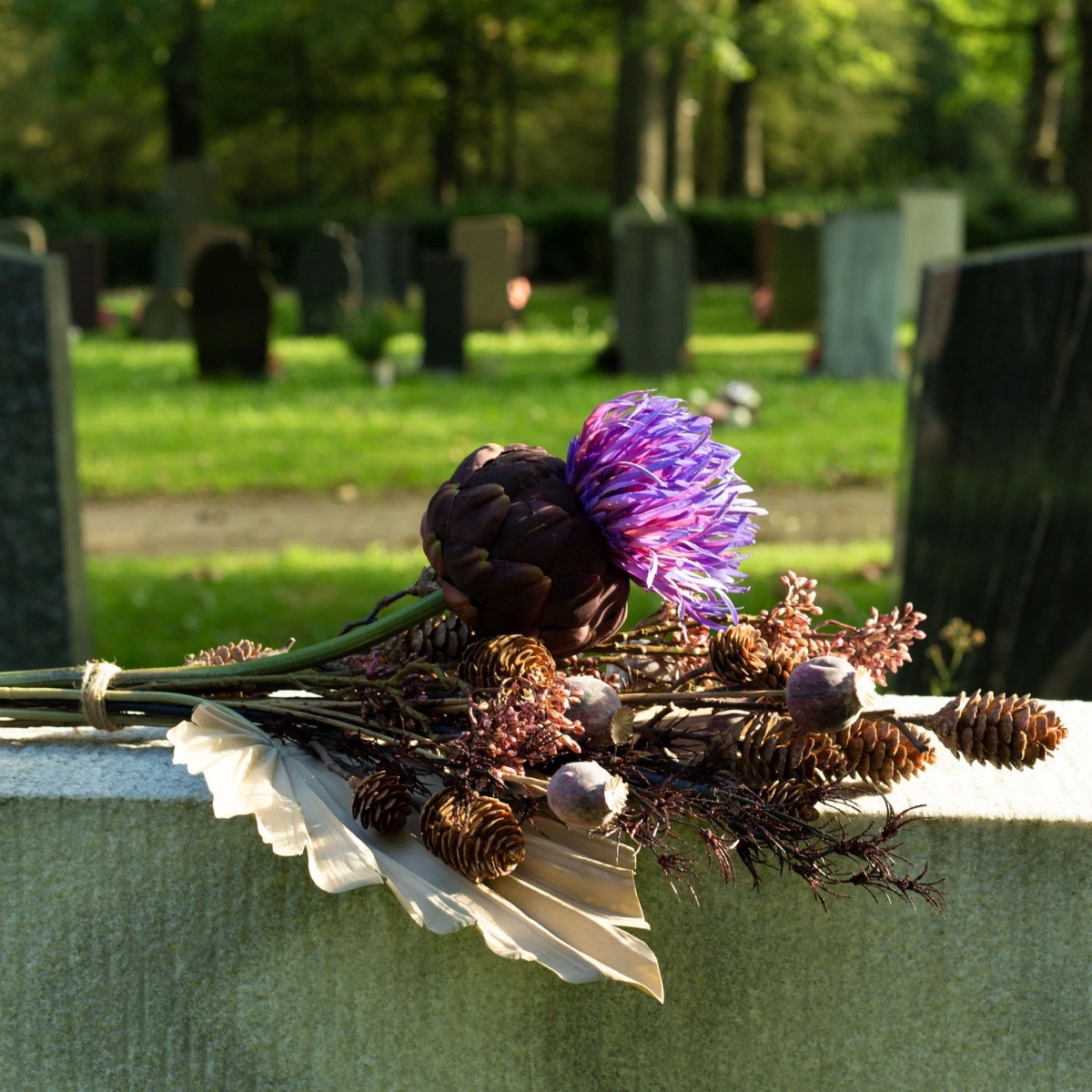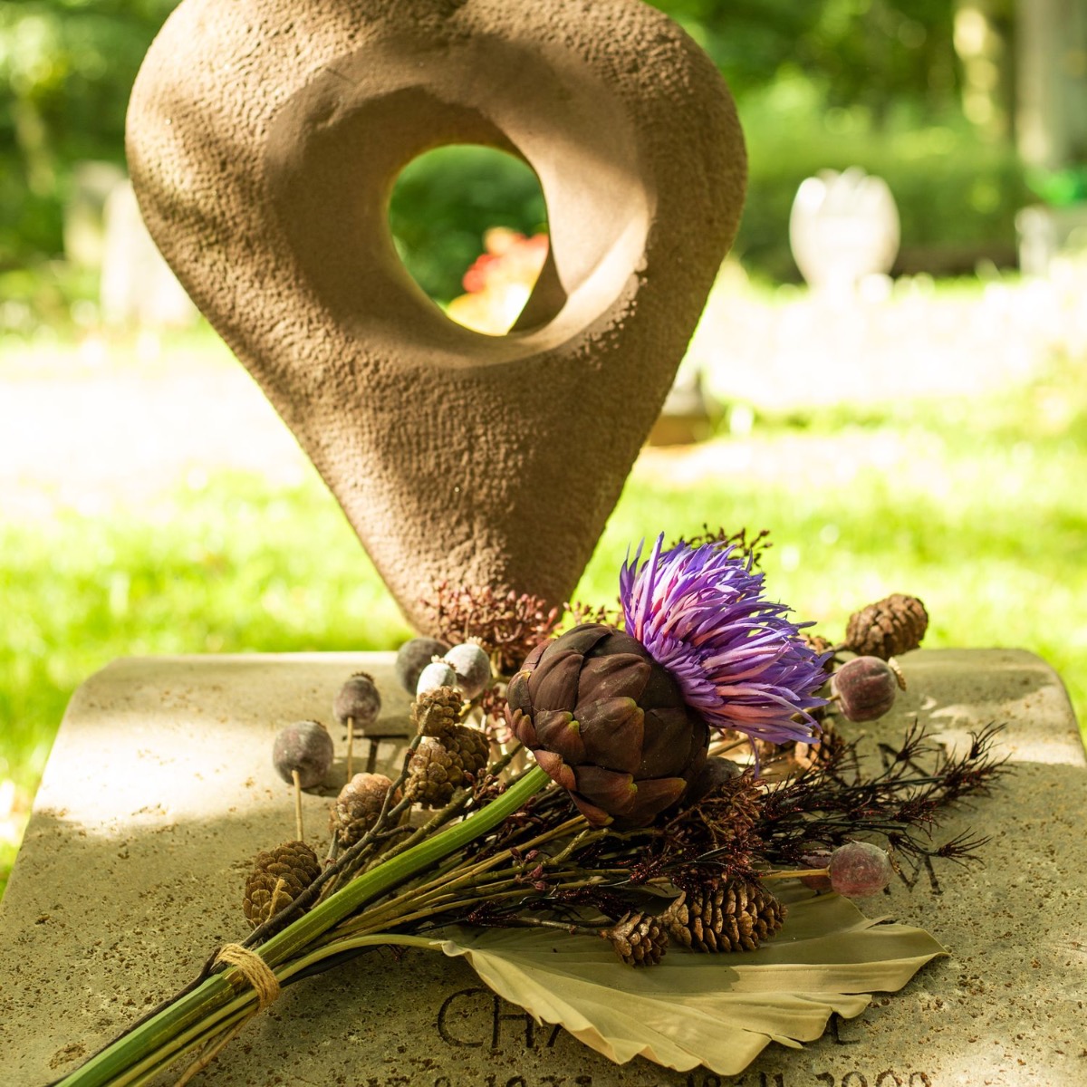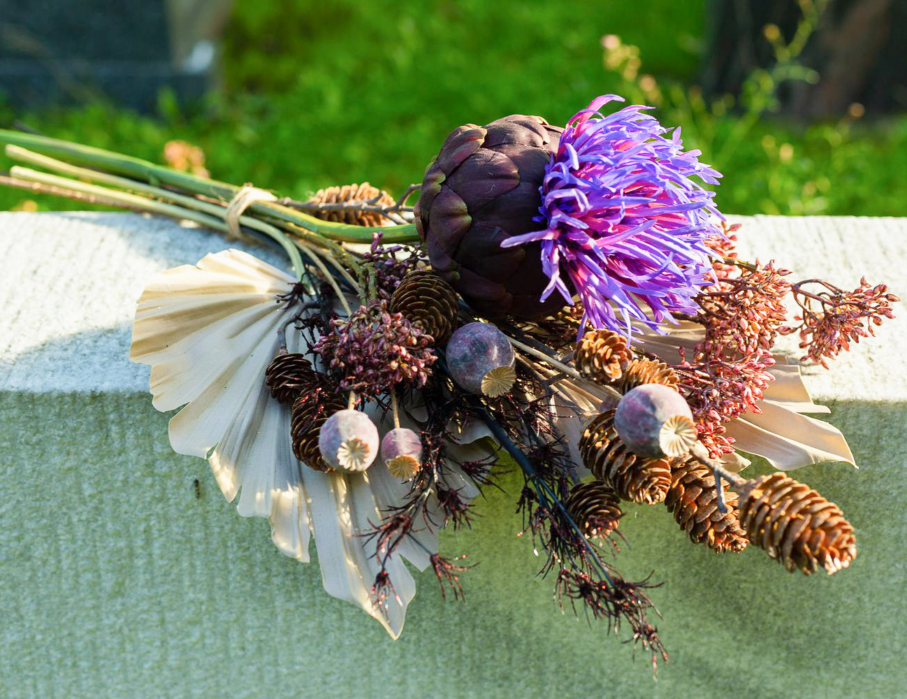 Barvy smutku! Když ztratíte milovanou osobu, život se vám výrazně změní. Zůstane jen vzpomínka. Na svátek Všech svatých si připomínáme památku zesnulých a vzpomínáme na krásné životní osudy. Hroby se upravují a zdobí novými květinami. Je opravdu praktické, když květiny neuvadnou a trvale zkrášlují hrobové místo. Žádné vadnutí, žádné zalévání - a opravdu přirozený efekt. Tajemná fialová barva květu artyčoku září v temné atmosféře hřbitova a na pozadí šedavě zbarvených palmových listů působí moderně a nadčasově. Nakupte si tento vzhled!