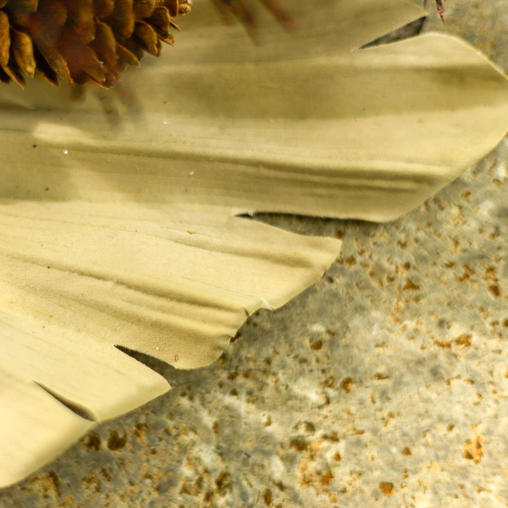 Designový tip: Umístěte hlavní květinu (květ artyčoku) do popředí a palmové listy do pozadí. Doplňky jsou umístěny mezi nimi a měly by diskrétně rámovat květ artyčoku.