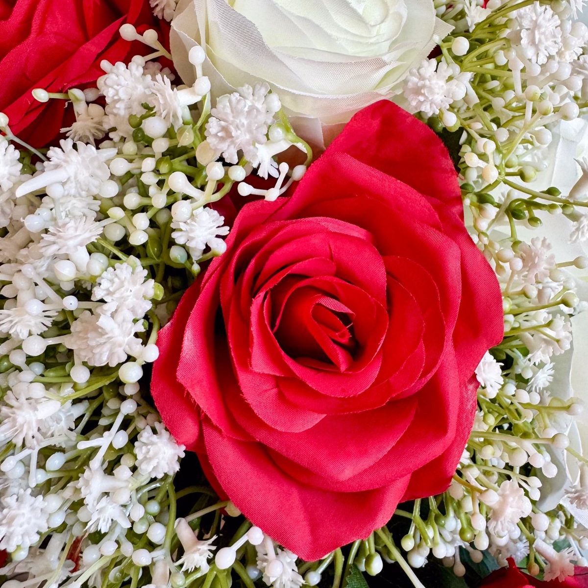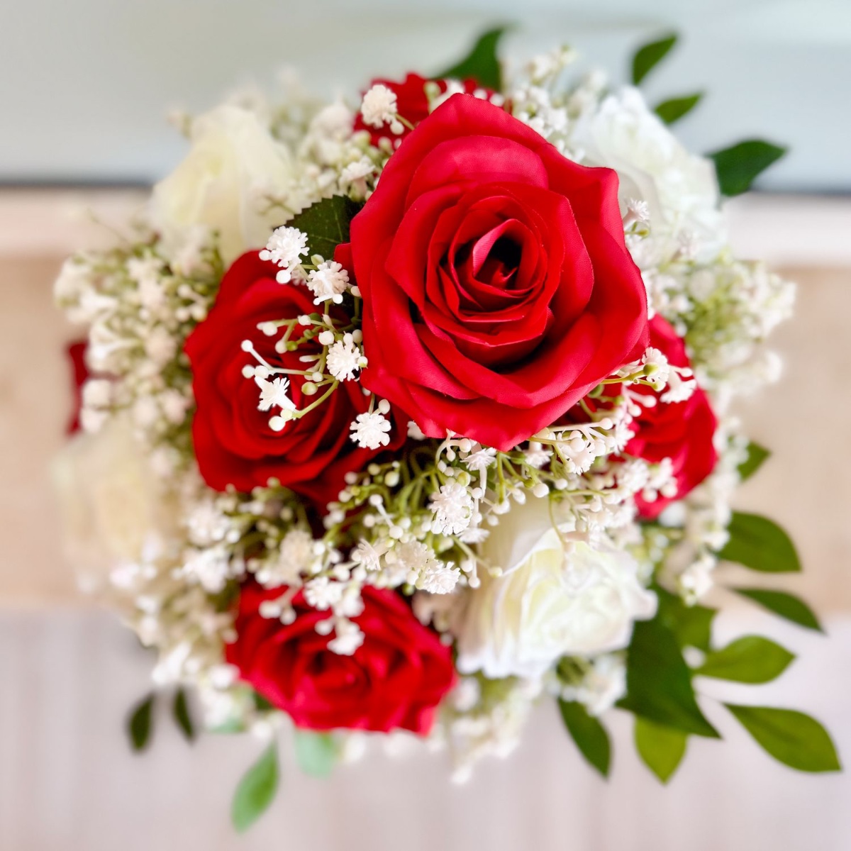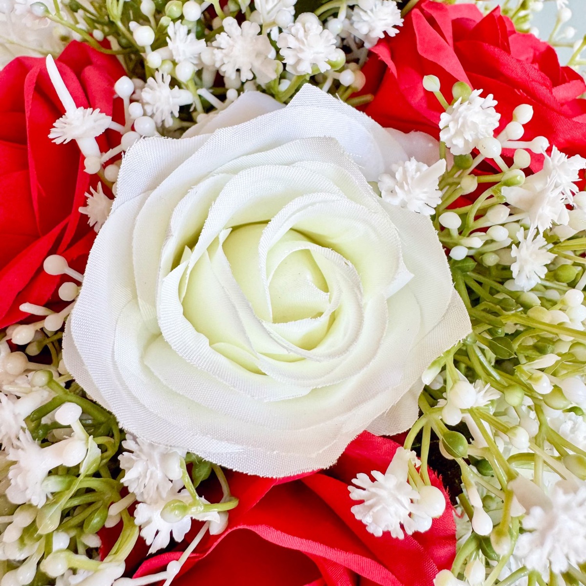 Tak jedinečné jako vaše ano! Tato elegantní svatební kytice ve tvaru kapky nebo vodopádu byla individuálně navržená podle přání zákazníka. Harmonická kombinace zářivě červených a čistě bílých růží, doplněná jemnými větvičkami gypsophily a sytě zeleným listovím, dodává aranžmá nadčasový a ušlechtilý vzhled. Kytice je vyrobena s velkou láskou k detailu. Zakřivený tvar zajišťuje plynulé, přirozené linie – stylový doplněk pro váš velký den. Kupte si tento vzhled!
