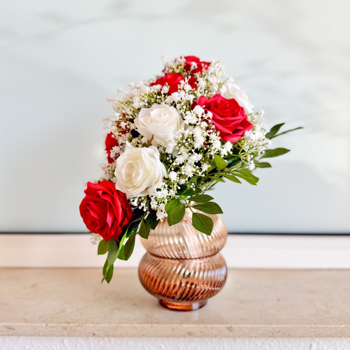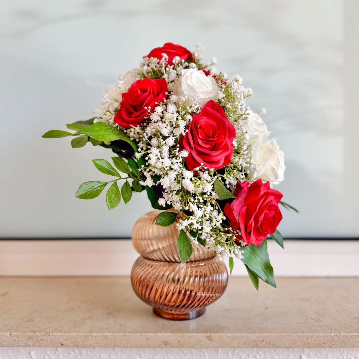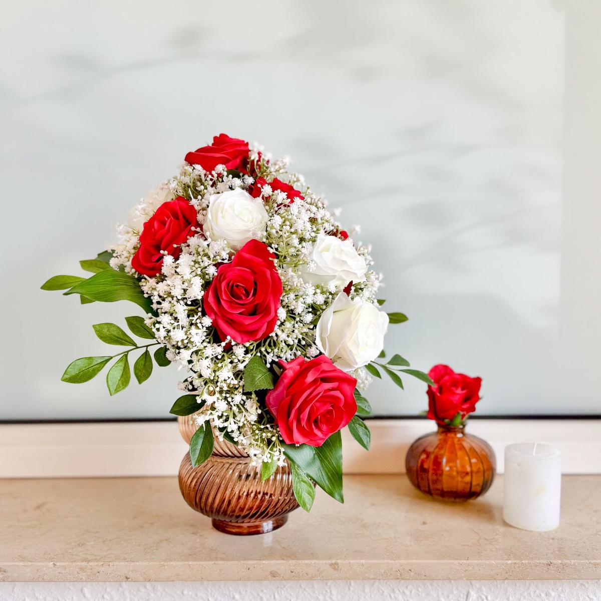 Tak jedinečné jako vaše ano! Tato elegantní svatební kytice ve tvaru kapky nebo vodopádu byla individuálně navržená podle přání zákazníka. Harmonická kombinace zářivě červených a čistě bílých růží, doplněná jemnými větvičkami gypsophily a sytě zeleným listovím, dodává aranžmá nadčasový a ušlechtilý vzhled. Kytice je vyrobena s velkou láskou k detailu. Zakřivený tvar zajišťuje plynulé, přirozené linie – stylový doplněk pro váš velký den. Kupte si tento vzhled!