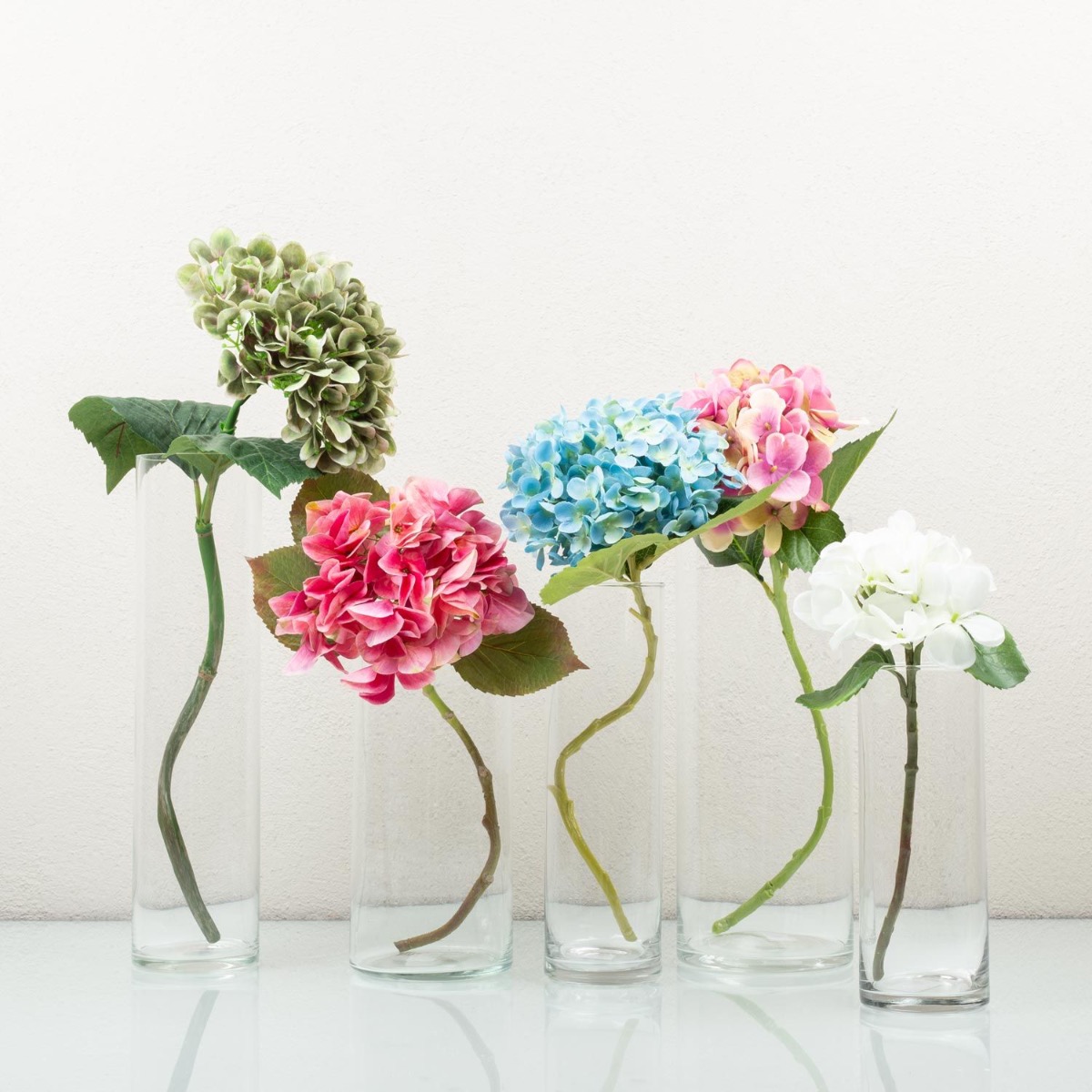Zázrak kulovitých květů! Hortenzie inspirují svými bujnými květními deštníky, které vyrůstají z mnoha malých květů. Tento vzhled je dokonalou letní dekorací, protože působí osvěžujícím dojmem a zobrazuje typické barvy vrcholného léta. Díky válcovým vázám různých délek a průměrů je tento vzhled elegantní a puristický. Nakupte si tento vzhled!