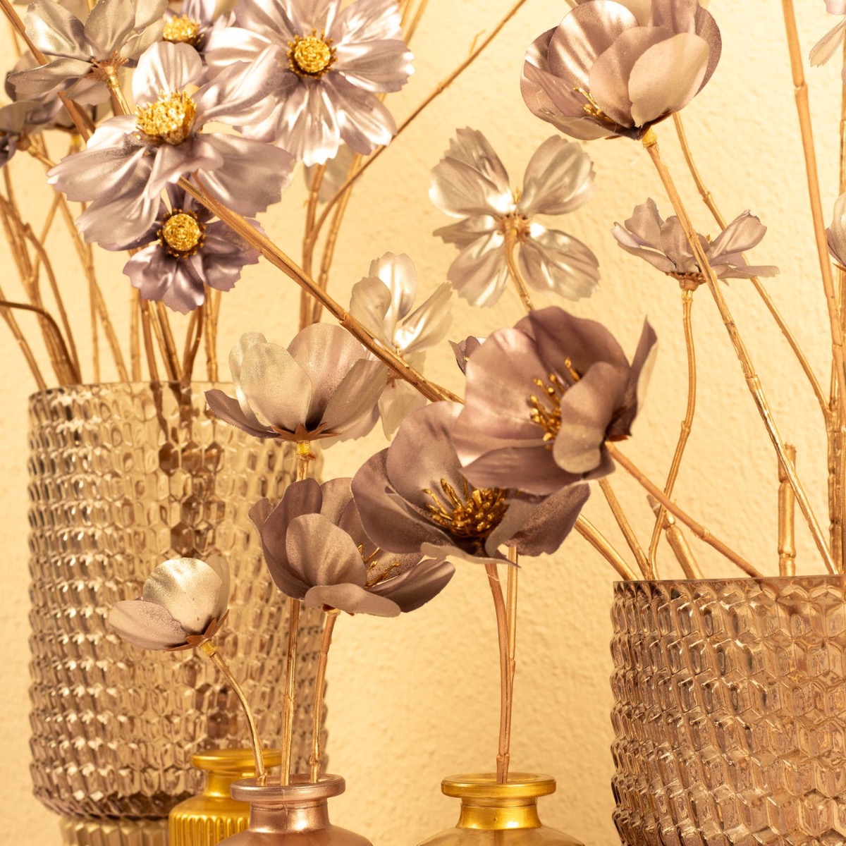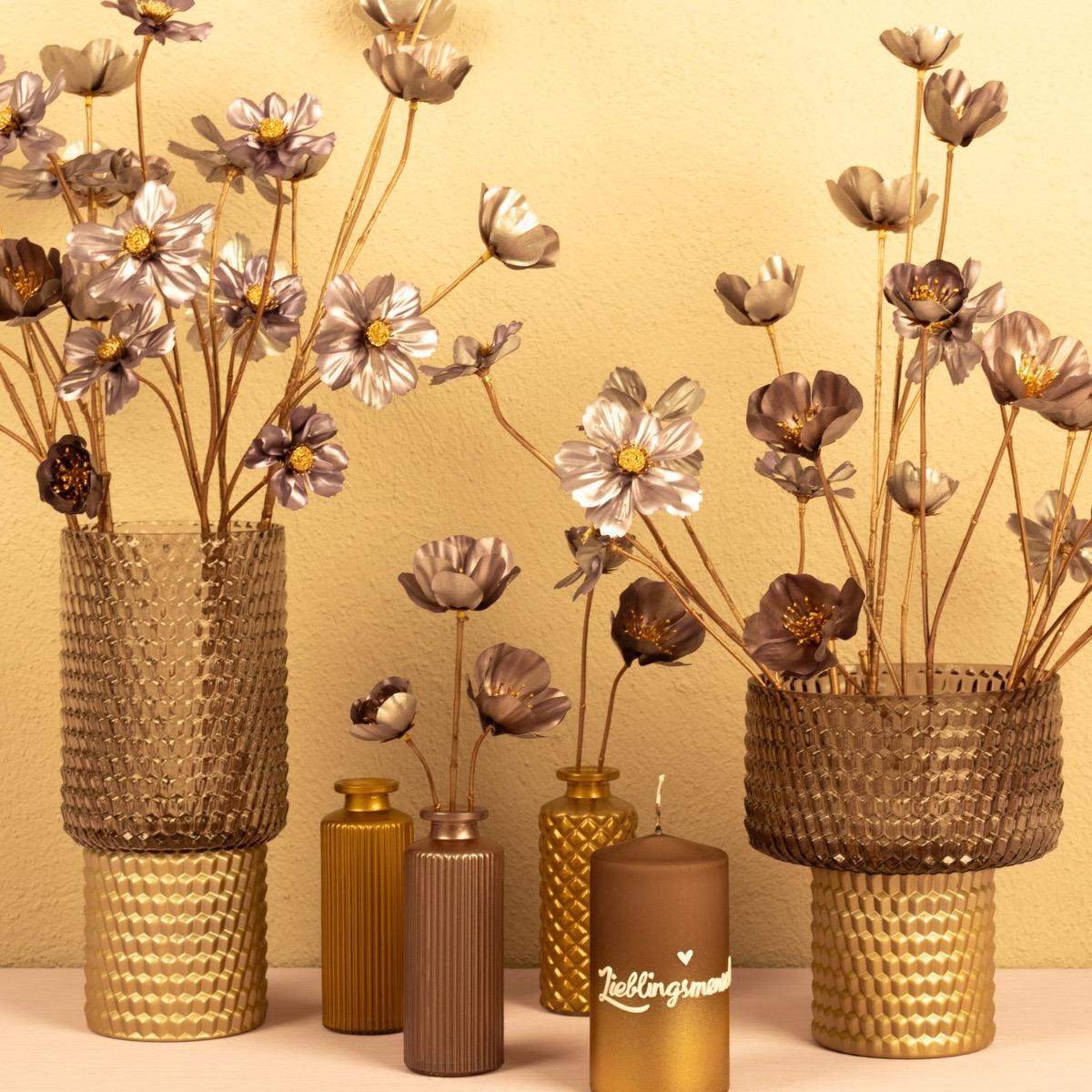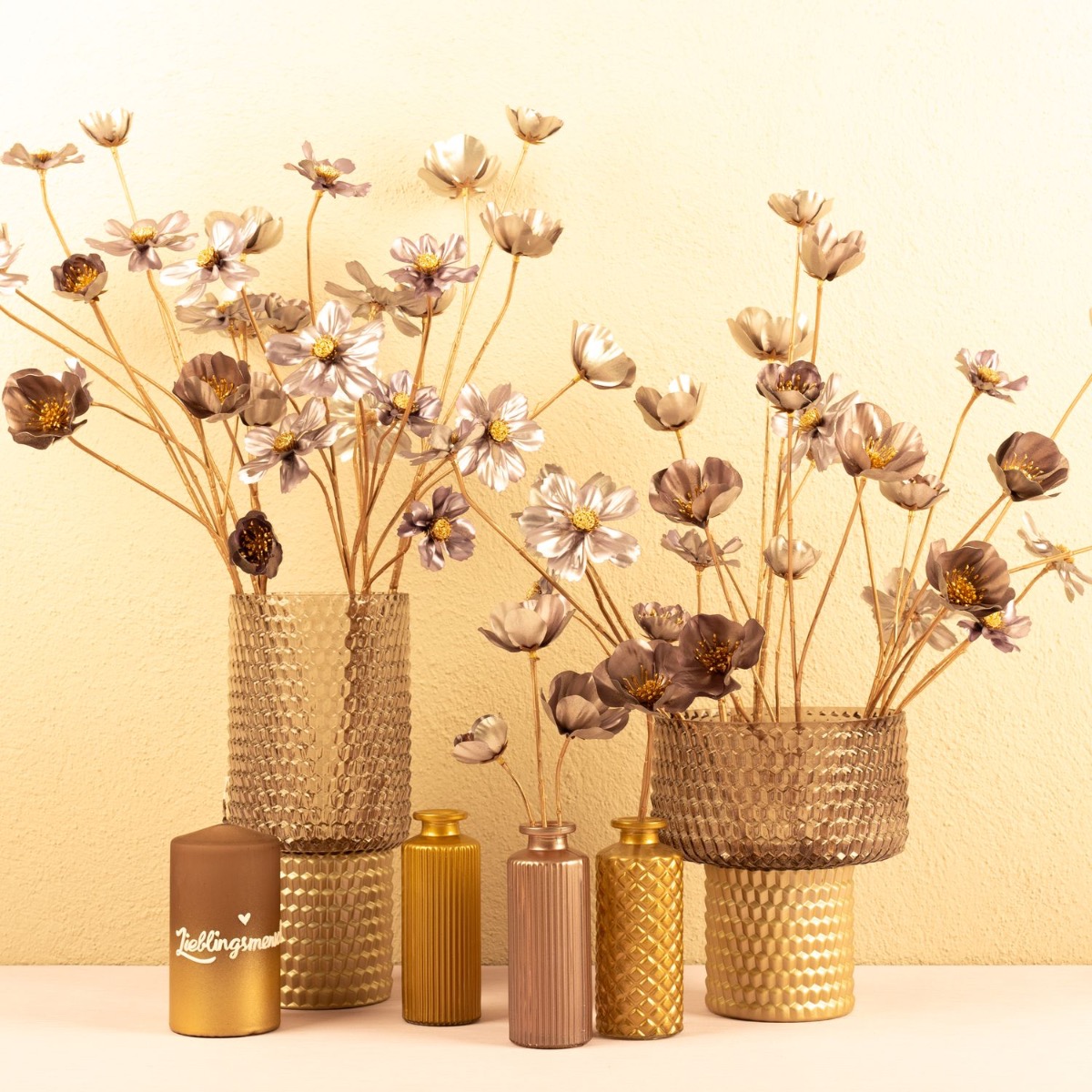 Zlato a růže! Vznikl zde sofistikovaný a extravagantní vzhled s čistým půvabem. Lesklé zlaté vázy a třpytivé kovové květy vytvářejí okouzlující obraz. Zní to jako dokonalý dárek pro vaši oblíbenou osobu. Vzkaz je již napsán na svíčce. Nakupte si tento vzhled!