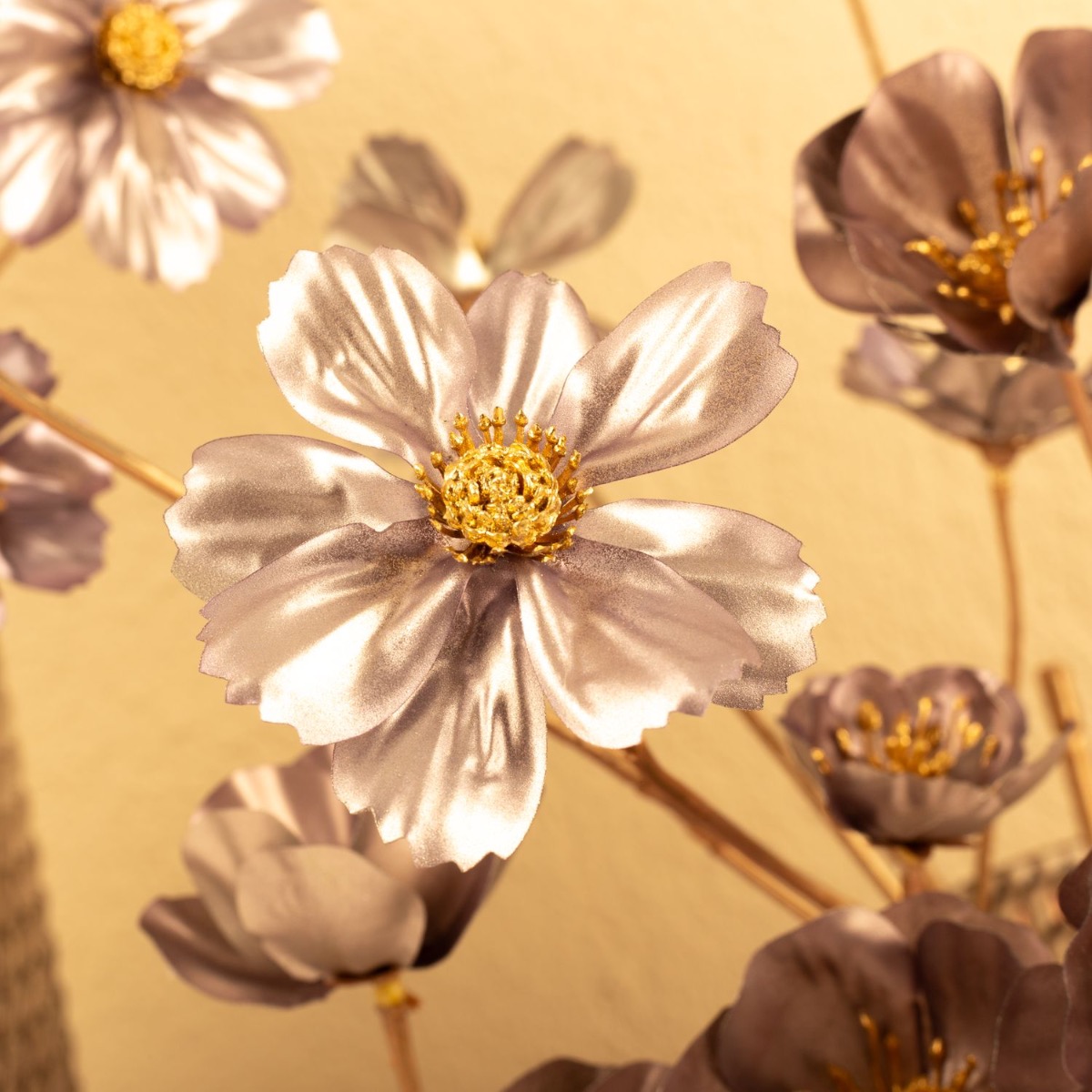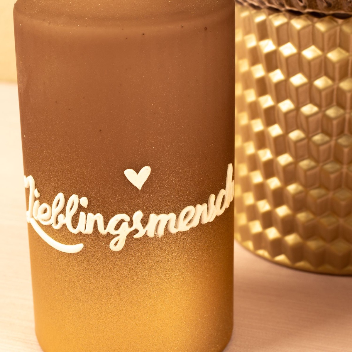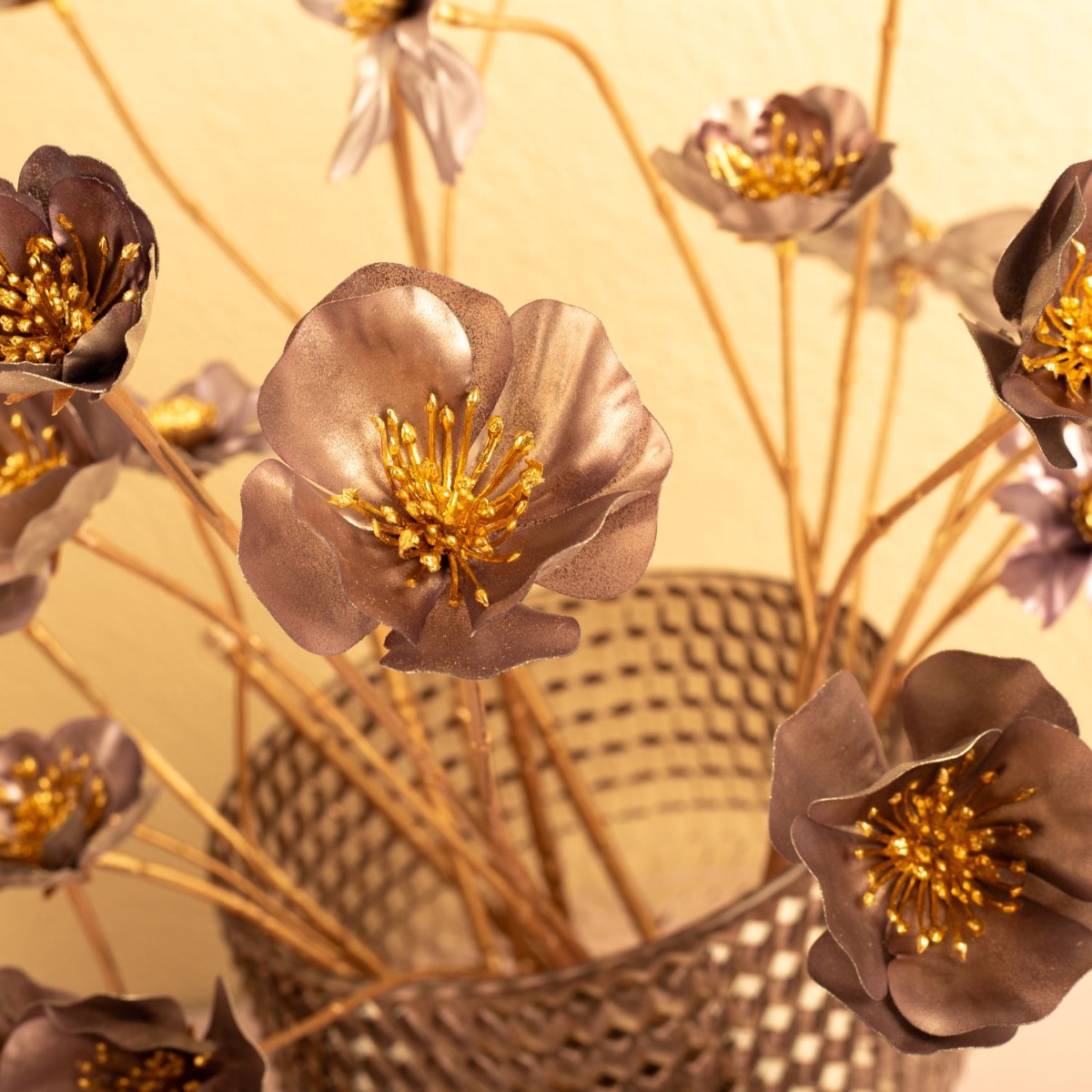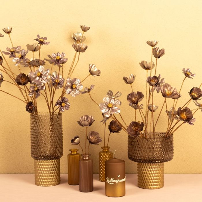Zlato a růže! Vznikl zde sofistikovaný a extravagantní vzhled s čistým půvabem. Lesklé zlaté vázy a třpytivé kovové květy vytvářejí okouzlující obraz. Zní to jako dokonalý dárek pro vaši oblíbenou osobu. Vzkaz je již napsán na svíčce. Nakupte si tento vzhled!