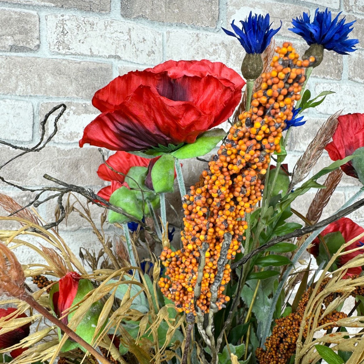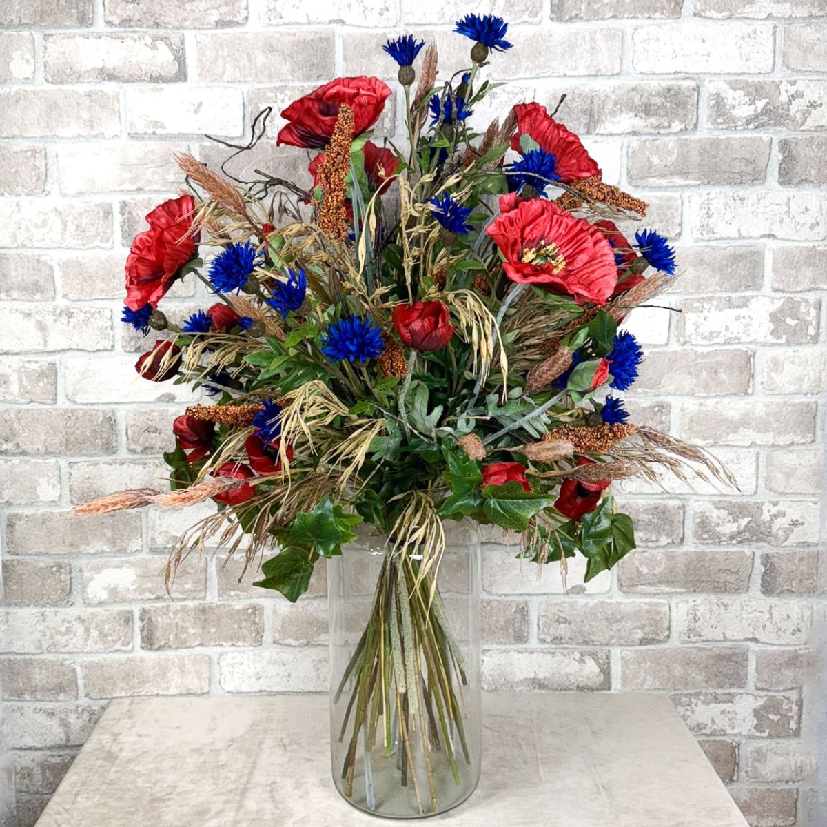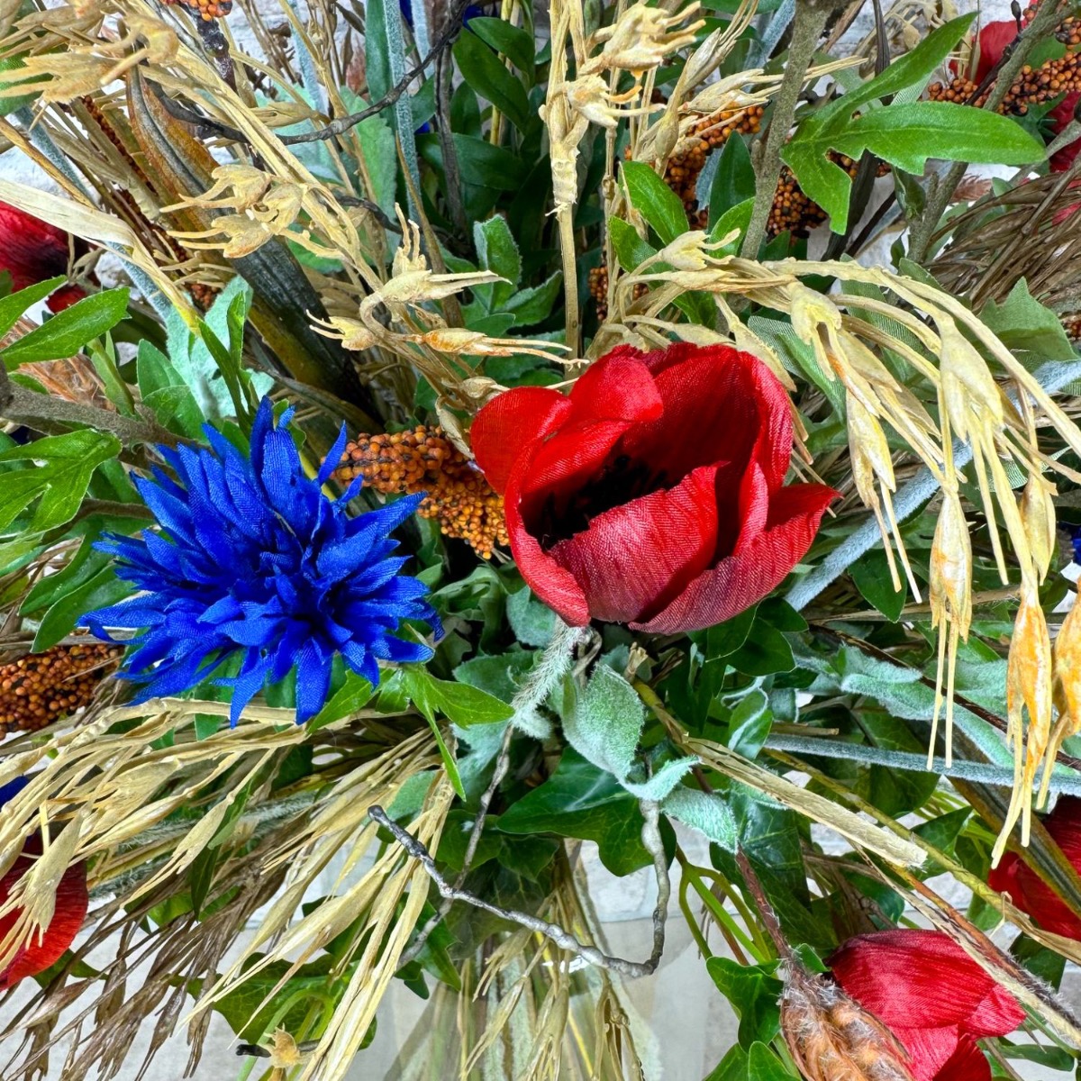 Polní a luční symfonie! Matthias nás požádal, zda bychom mohli vytvořit dvě kytice pro jeho dvě vázy. Měly odpovídat stylu stávajícího umělého květinového aranžmá z polních květin, které bylo umístěno na dřevěném panelu. Výběr květin byl s tímto zadáním rychlý a kromě máků a chrp byl přidán břečťan, vývrtky vrb a samozřejmě několik klasů pšenice, ovsa hladkého a prosa čiroku. Pšeničné klasy se svou zlatavou barvou a jemnými křivkami propůjčují kytici hřejivou a venkovskou atmosféru. Symbolizují hojnost a čas sklizně a vnášejí do kytice uklidňující přirozenost. Drobné a velké květy máku a chrpy umně obklopují kukuřičné klasy a rovněž poskytují skvělé barevné akcenty. Větve vývrtkové vrby se vinou celou kyticí a na vrcholu odvážně vyčnívají. Větvičky břečťanu kytici dokonale doplňují a dodávají jí přirozenou plnost. Chtěli byste mít krásu pole i u vás doma? Nakupte si tento vzhled!