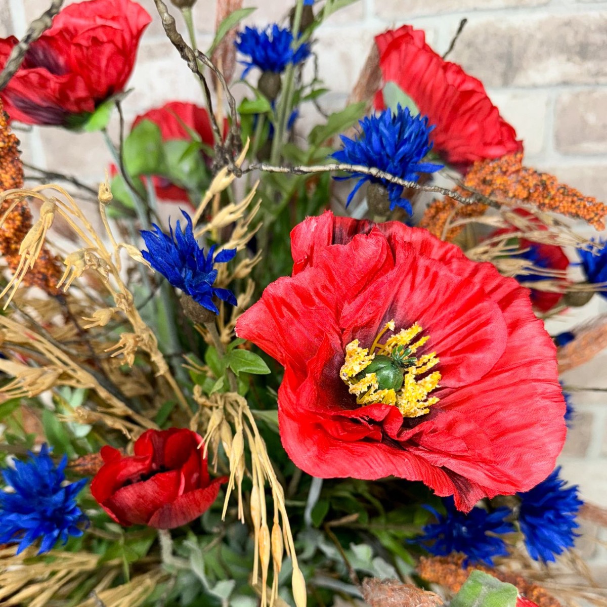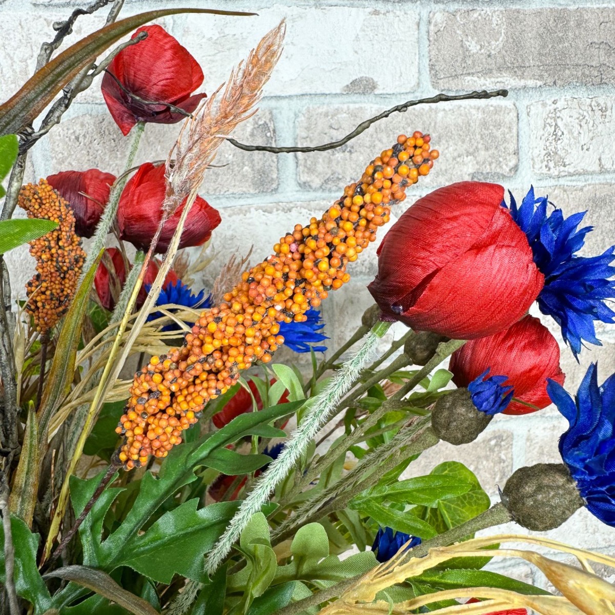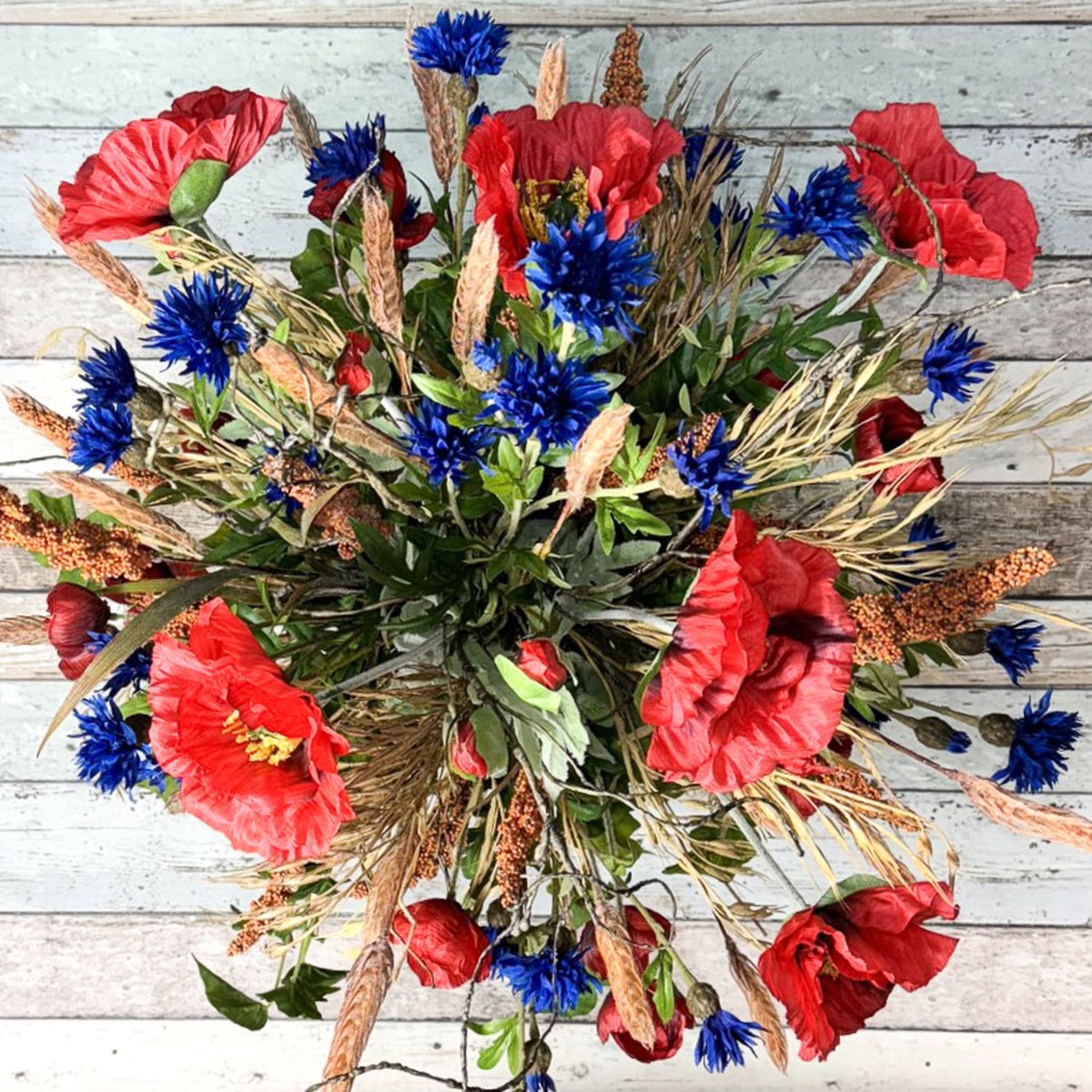 Polní a luční symfonie! Matthias nás požádal, zda bychom mohli vytvořit dvě kytice pro jeho dvě vázy. Měly odpovídat stylu stávajícího umělého květinového aranžmá z polních květin, které bylo umístěno na dřevěném panelu. Výběr květin byl s tímto zadáním rychlý a kromě máků a chrp byl přidán břečťan, vývrtky vrb a samozřejmě několik klasů pšenice, ovsa hladkého a prosa čiroku. Pšeničné klasy se svou zlatavou barvou a jemnými křivkami propůjčují kytici hřejivou a venkovskou atmosféru. Symbolizují hojnost a čas sklizně a vnášejí do kytice uklidňující přirozenost. Drobné a velké květy máku a chrpy umně obklopují kukuřičné klasy a rovněž poskytují skvělé barevné akcenty. Větve vývrtkové vrby se vinou celou kyticí a na vrcholu odvážně vyčnívají. Větvičky břečťanu kytici dokonale doplňují a dodávají jí přirozenou plnost. Chtěli byste mít krásu pole i u vás doma? Nakupte si tento vzhled!
