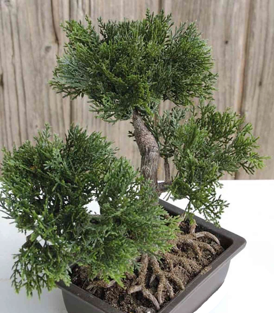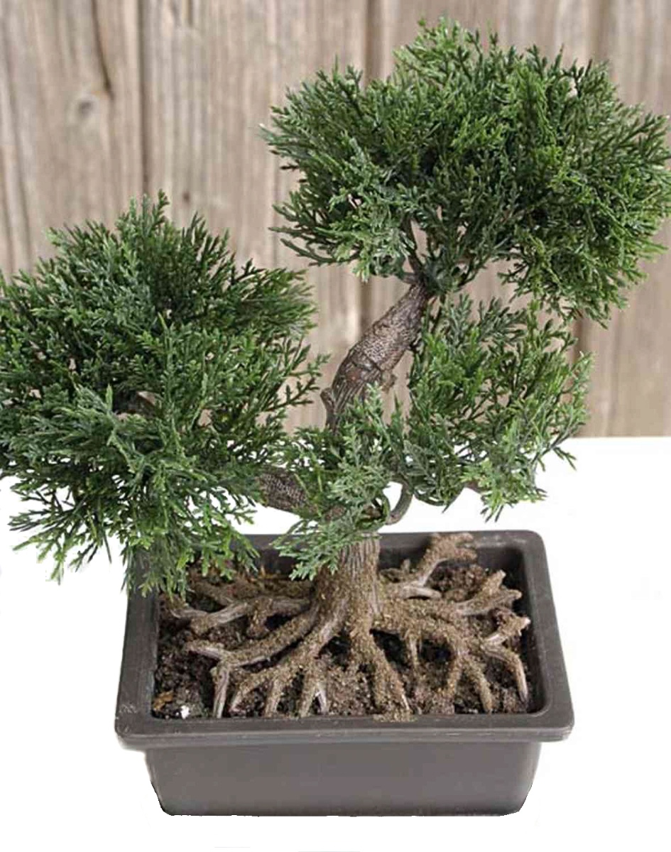 Umělá bonsaj cedr ALVARI s kořeny, v ozdobné misce, 20cm