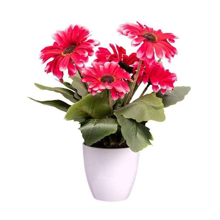 Umělá gerbera KROLVEN v bílém dekorativním květináči, fuchsie, 27cm