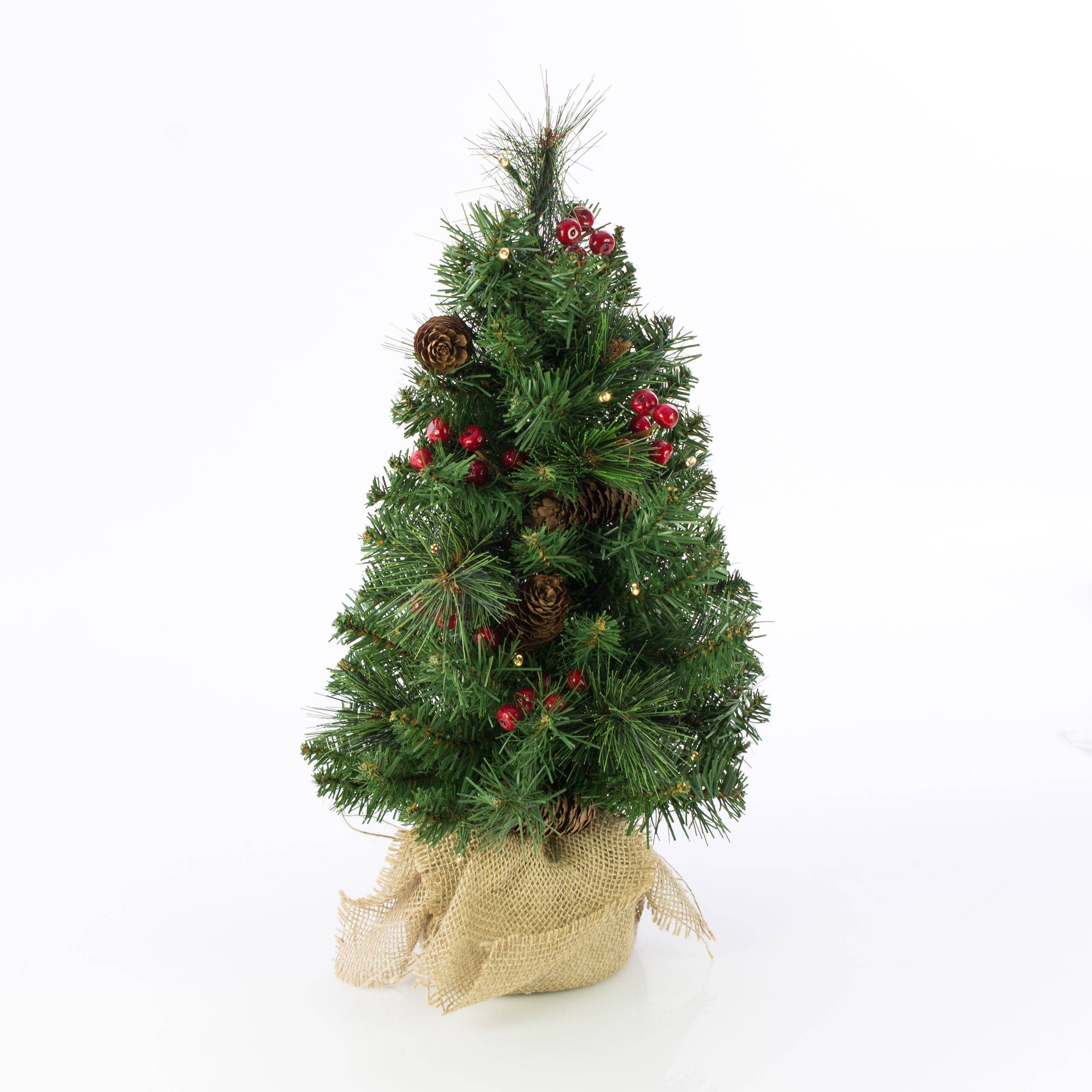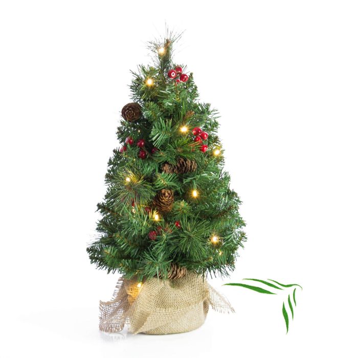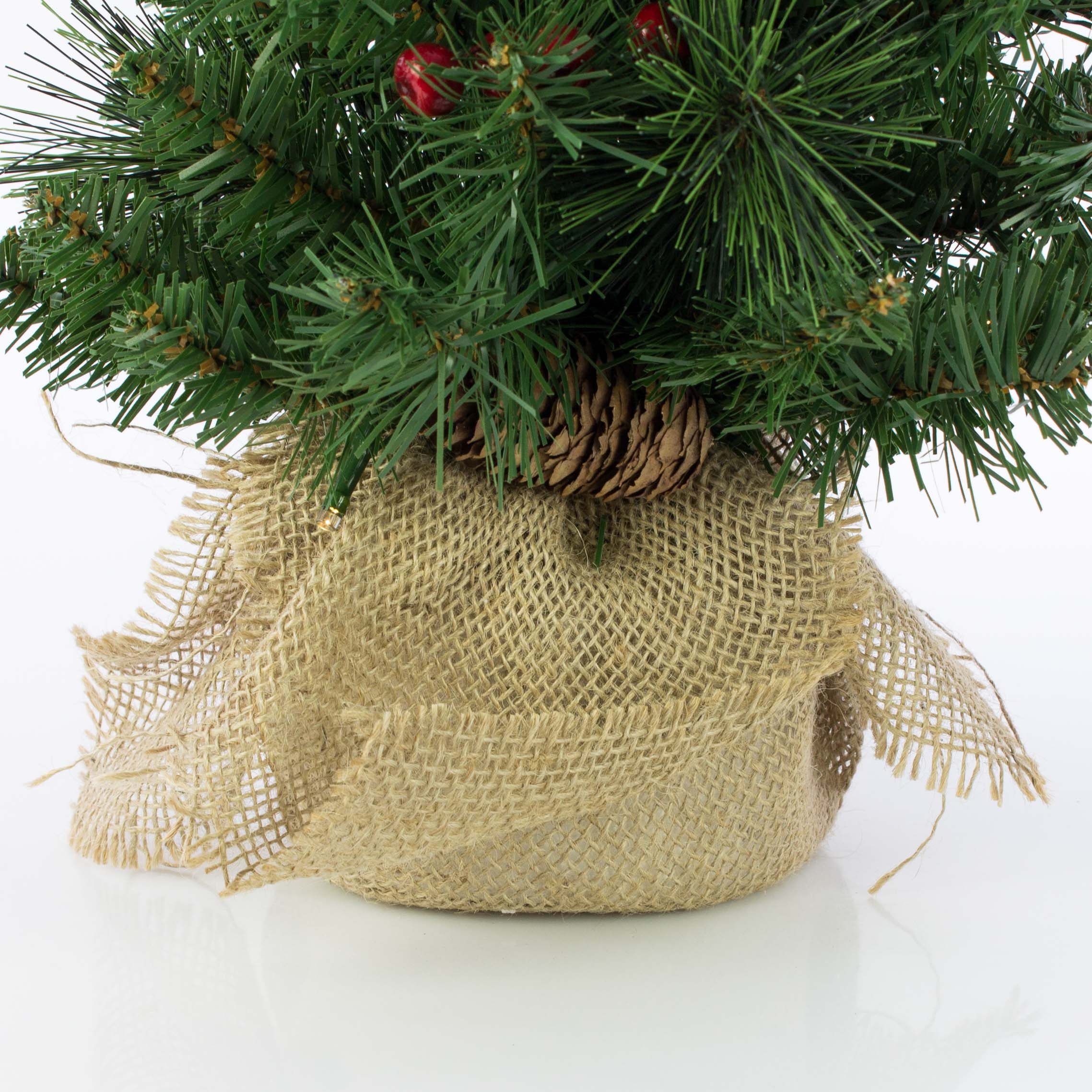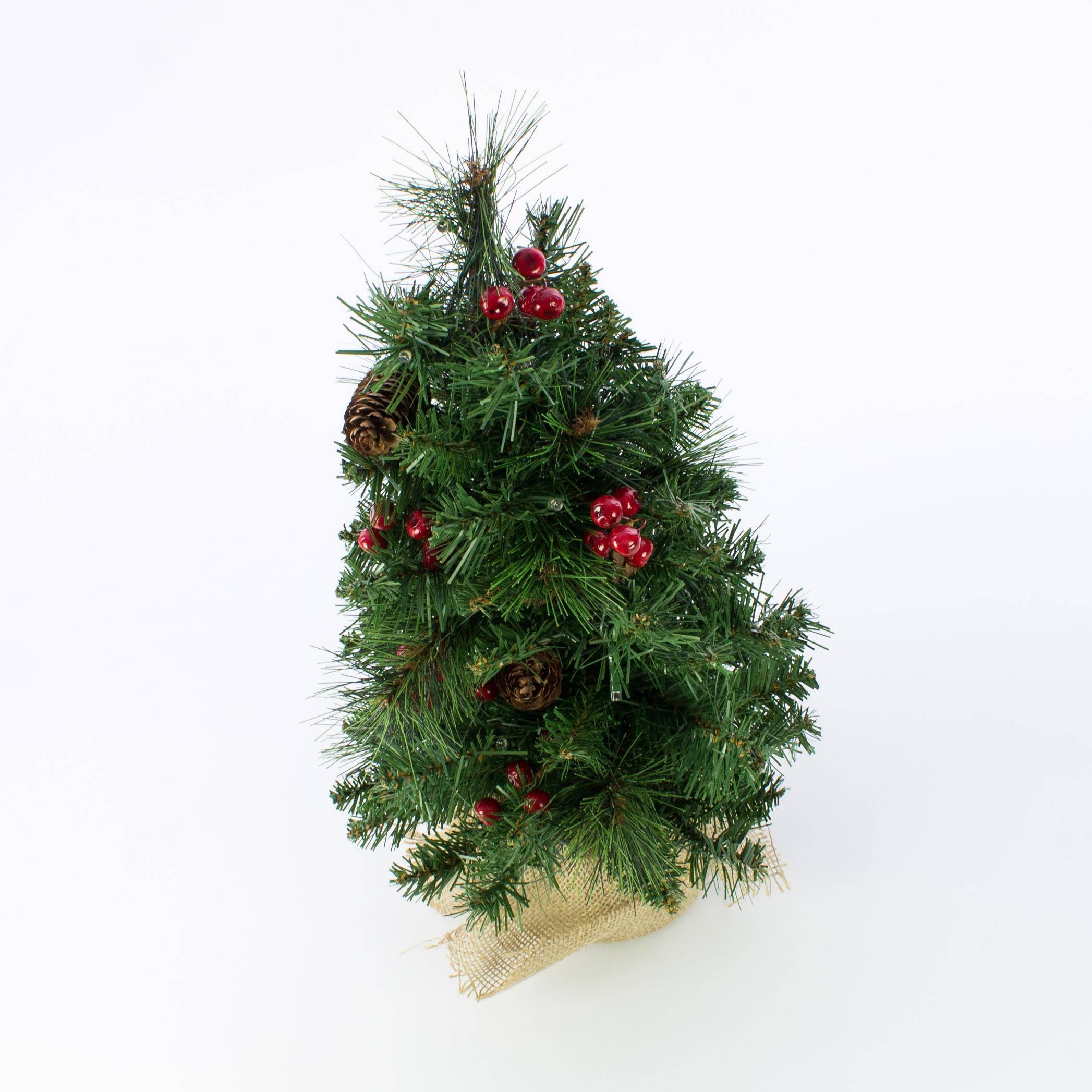 Umělá jedle BUKAREST, se šiškami, jutový pytel, ozdobený, LED diody, 45cm, Ø25cm
