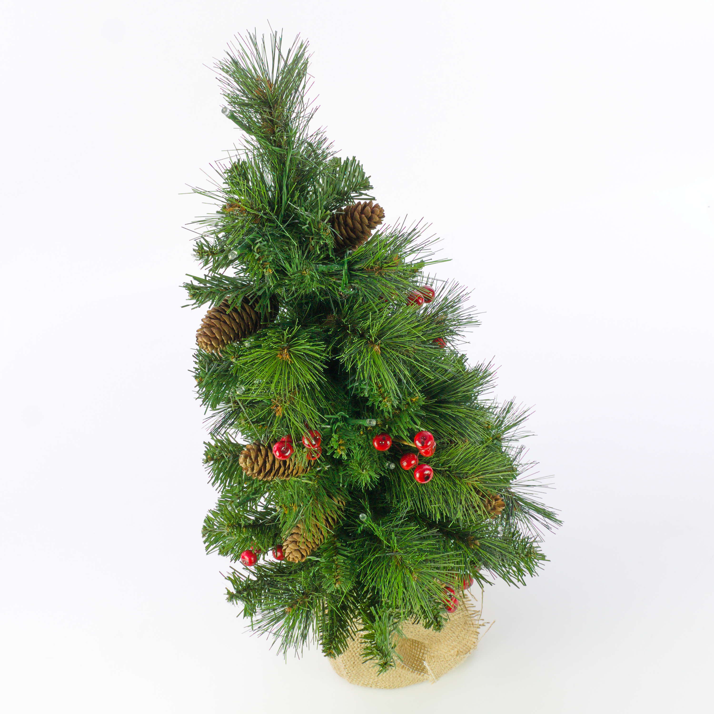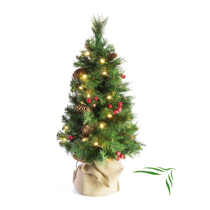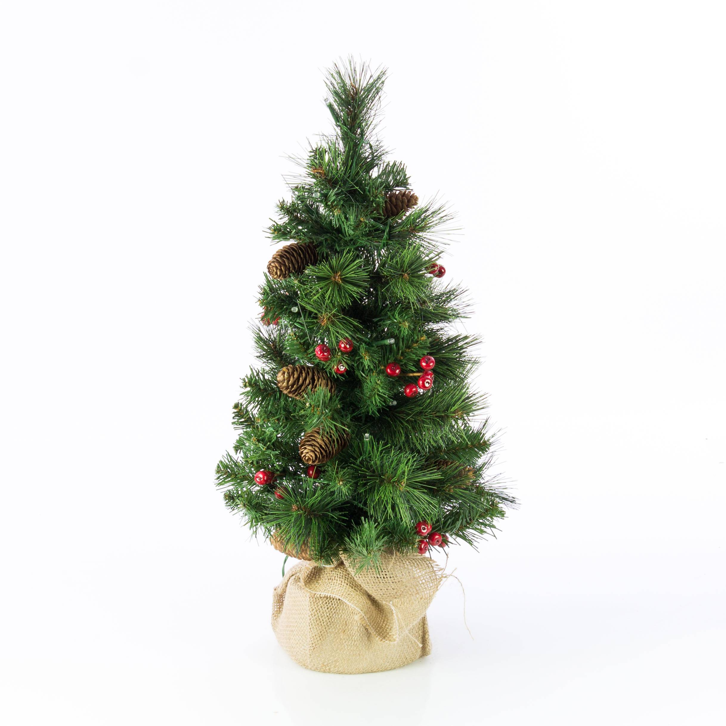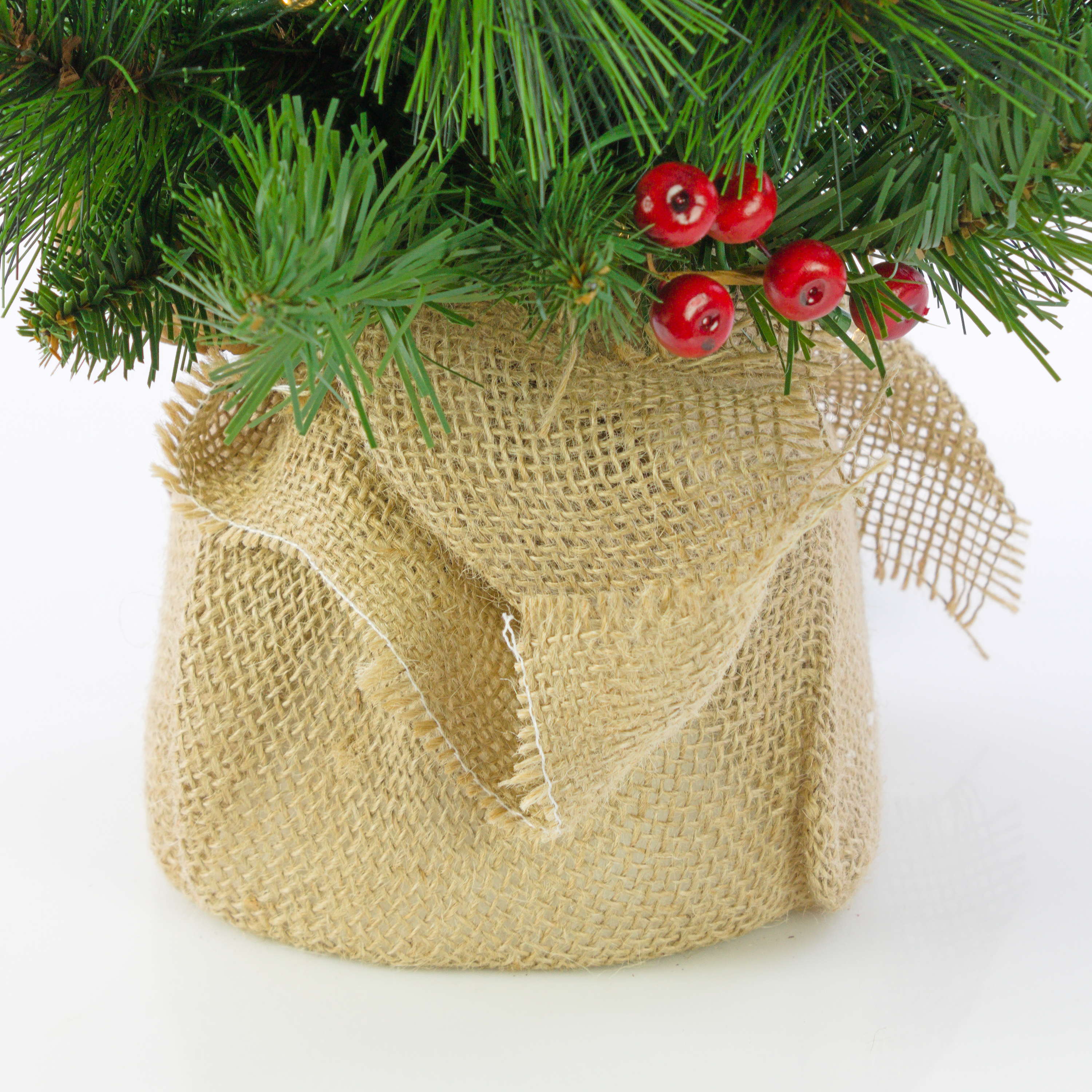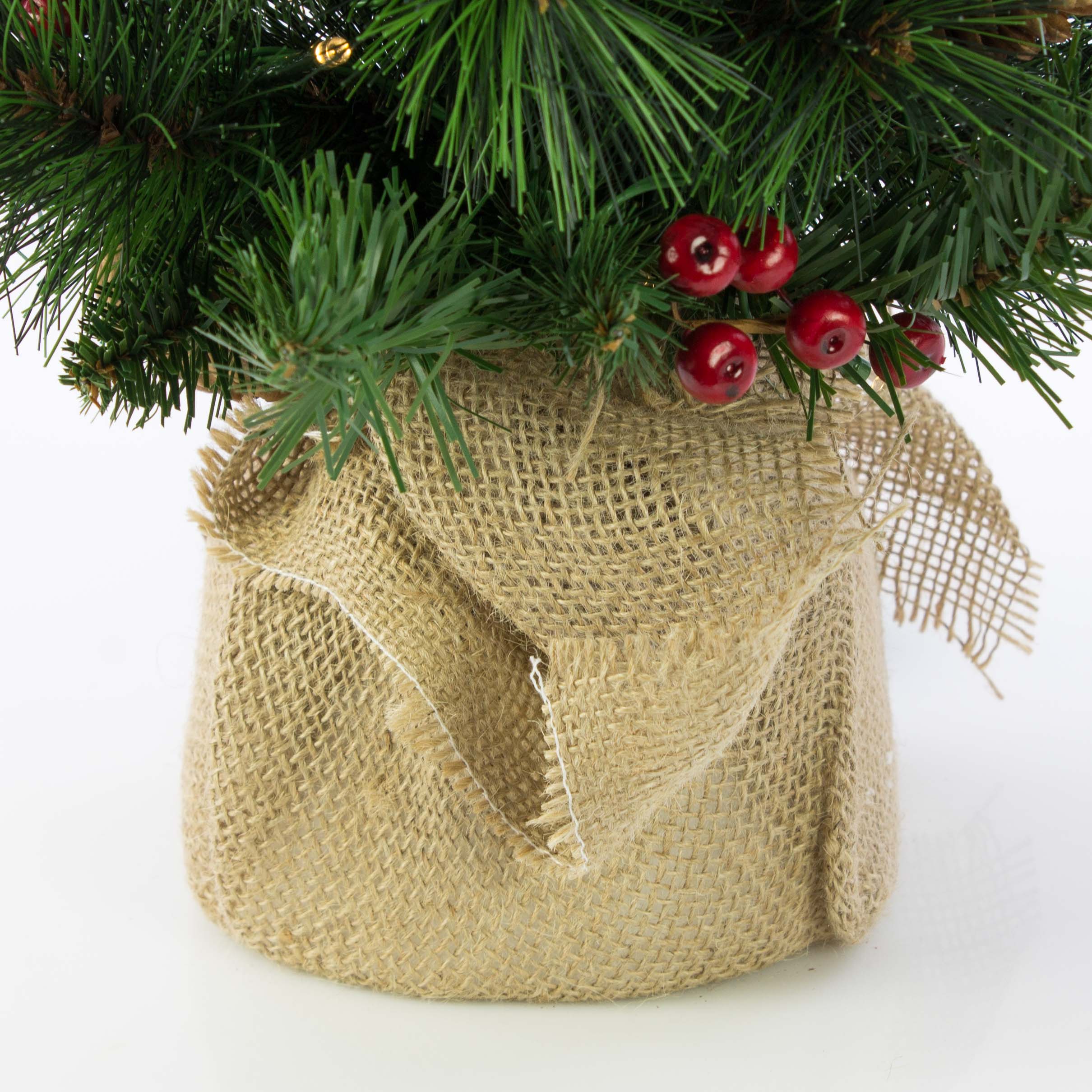 Umělá jedle BUKAREST, se šiškami, jutový pytel, ozdobený, LED diody, 60cm, Ø35cm